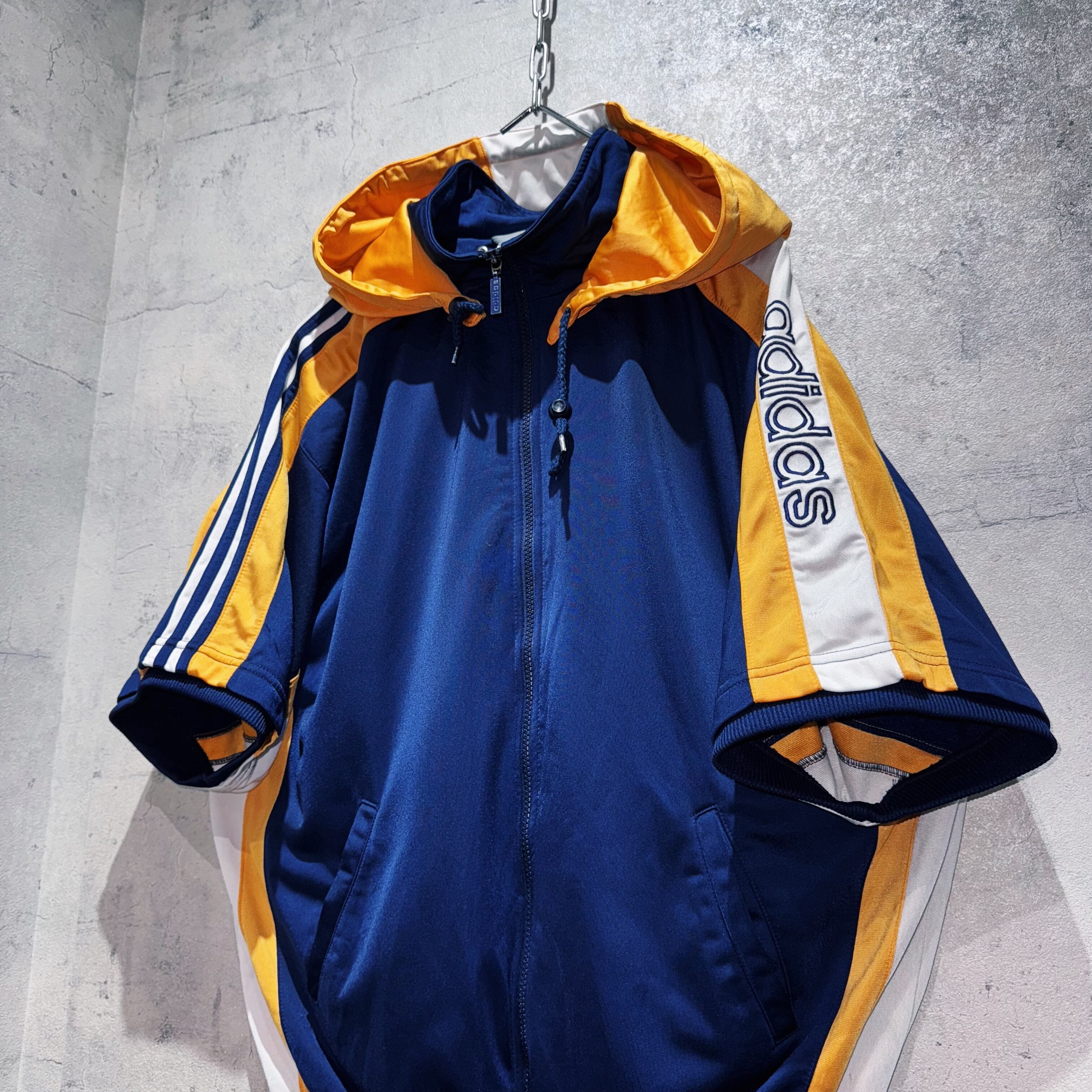 ネイビーのボディにイエローカラーがスイッチングし、差し色になったショートスリーブのトラックジャケット。しかも今回は取り外し可能なフードも搭載した完品でご用意。