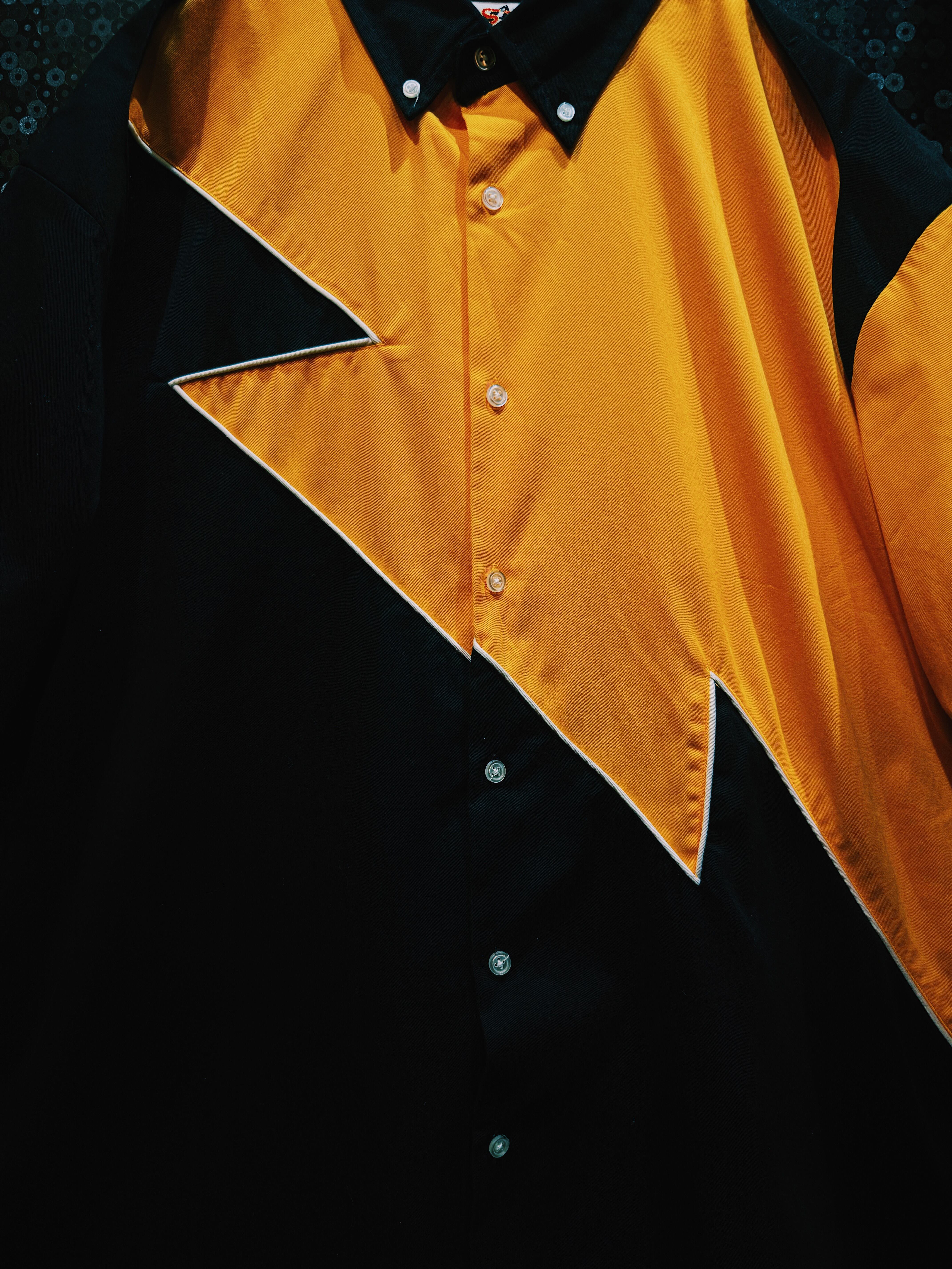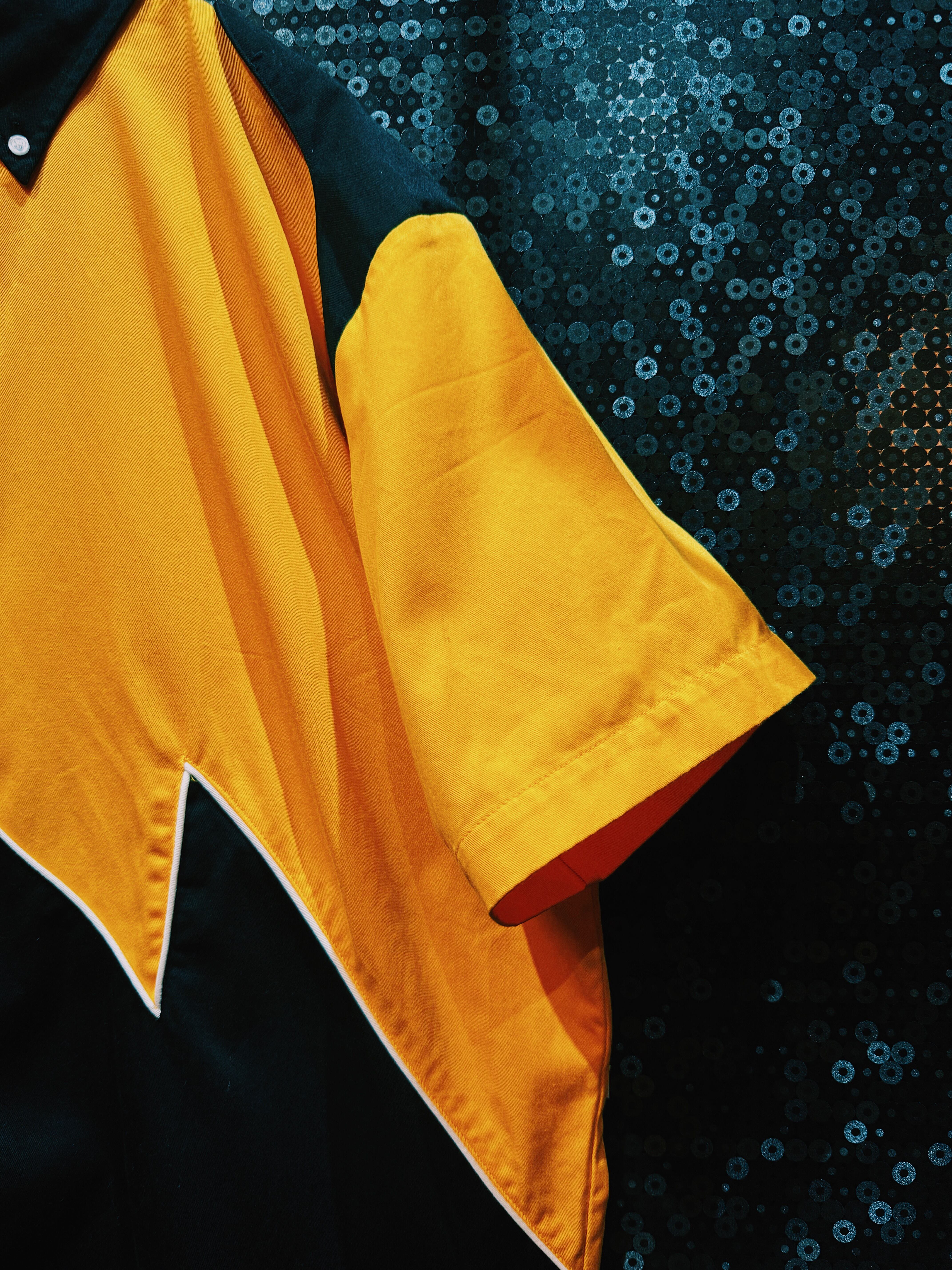 イエローとブラックの大胆なカラーブロッキングが目を引く、ヴィンテージ感溢れる逸品。