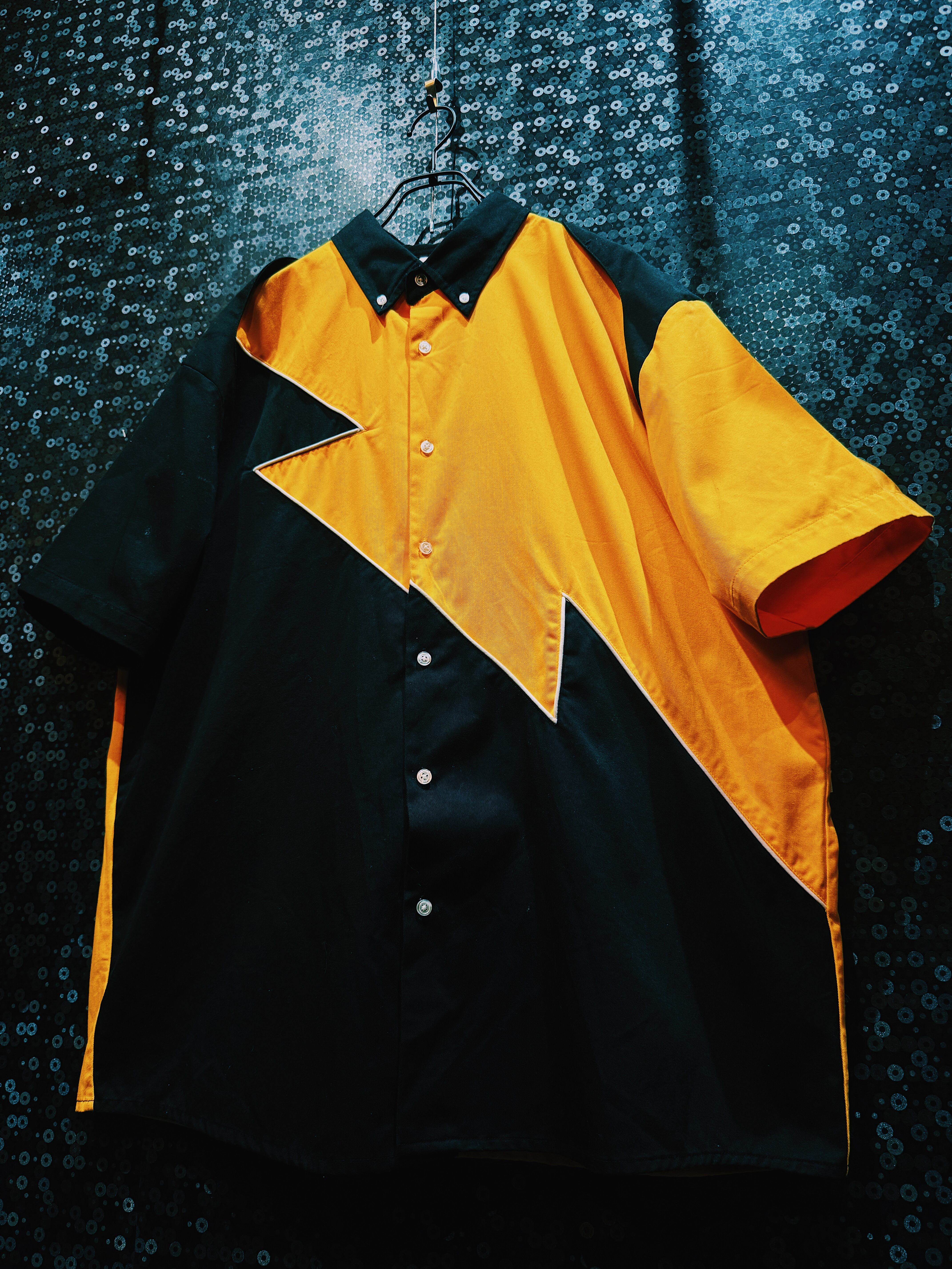 フロントの稲妻のような鋭い切り替えデザインは、ボーリングチームウェアならではのエネルギッシュな雰囲気を演出。