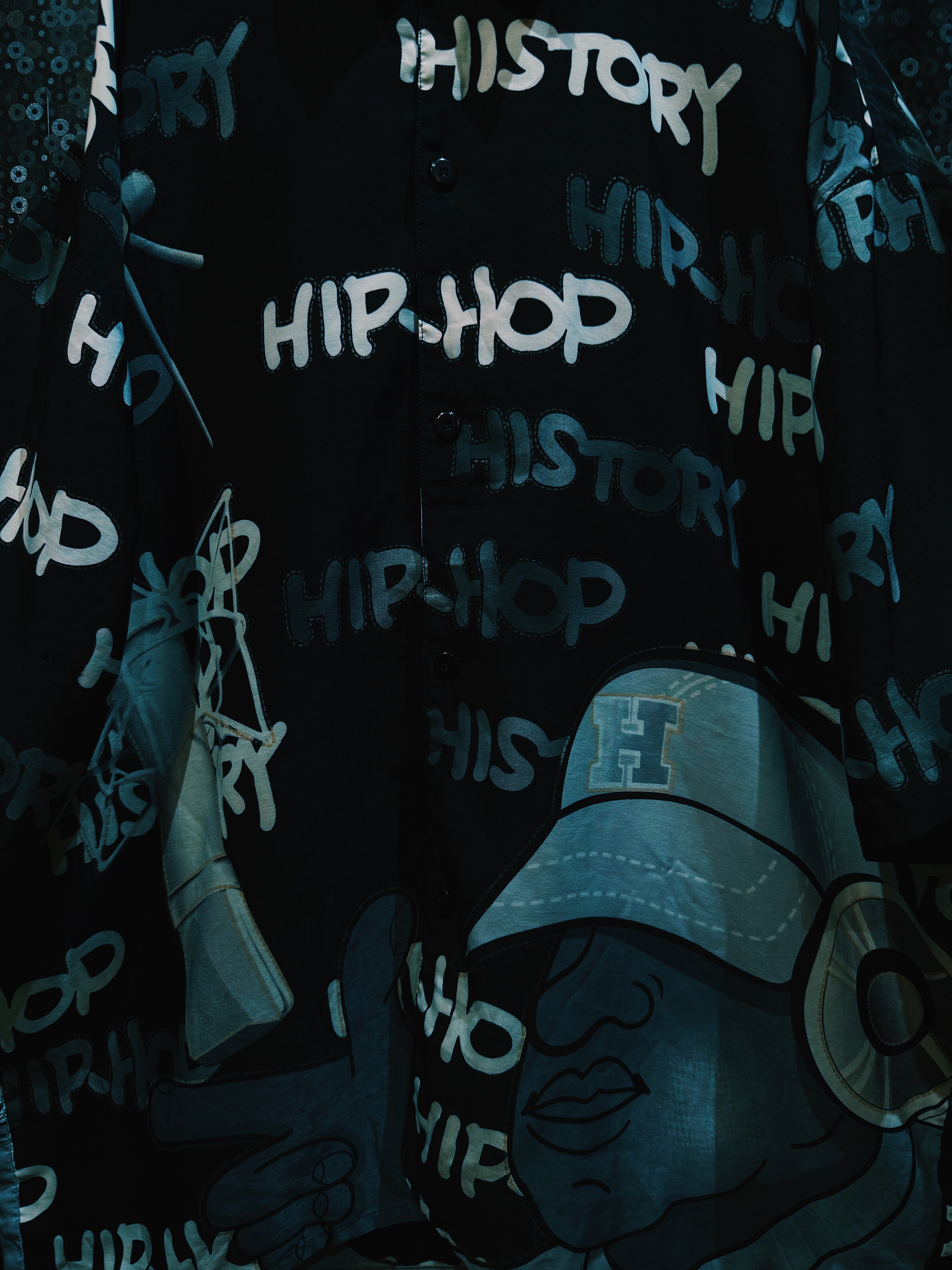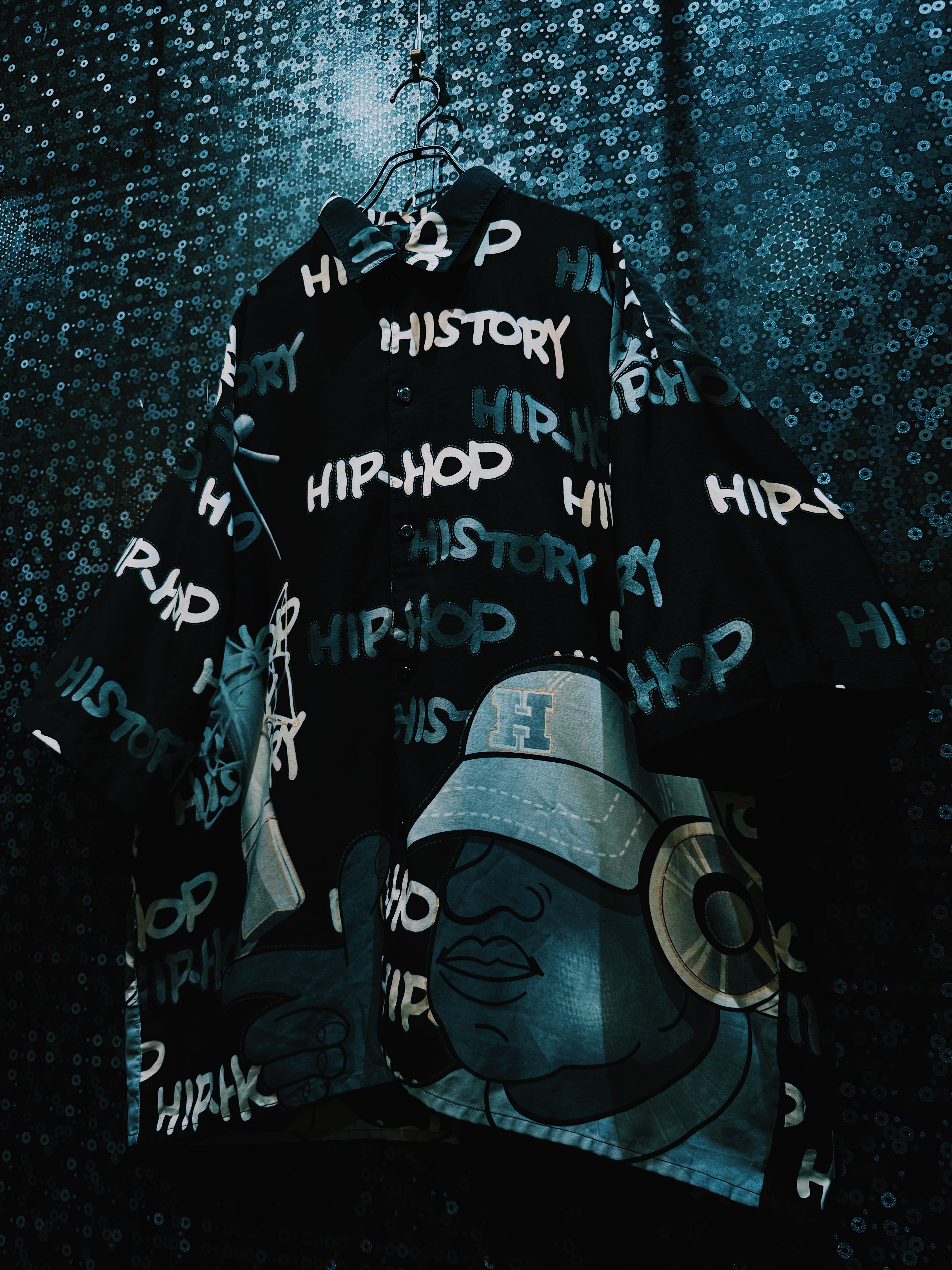 ストリートカルチャー全開のインパクトを放つ「HIP-HOP HISTORY」総柄半袖シャツ。フロント全面に“HIP-HOP”や“HISTORY”といったグラフィティ調の文字がランダムに配置され、存在感抜群の逸品。