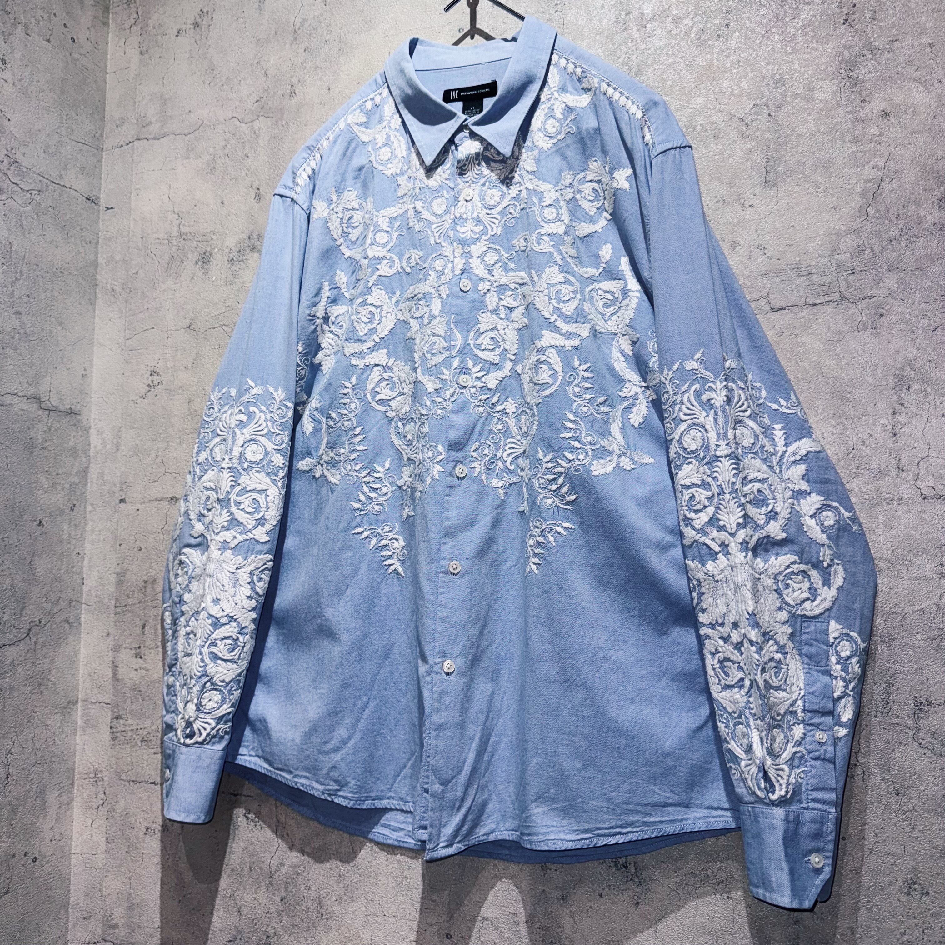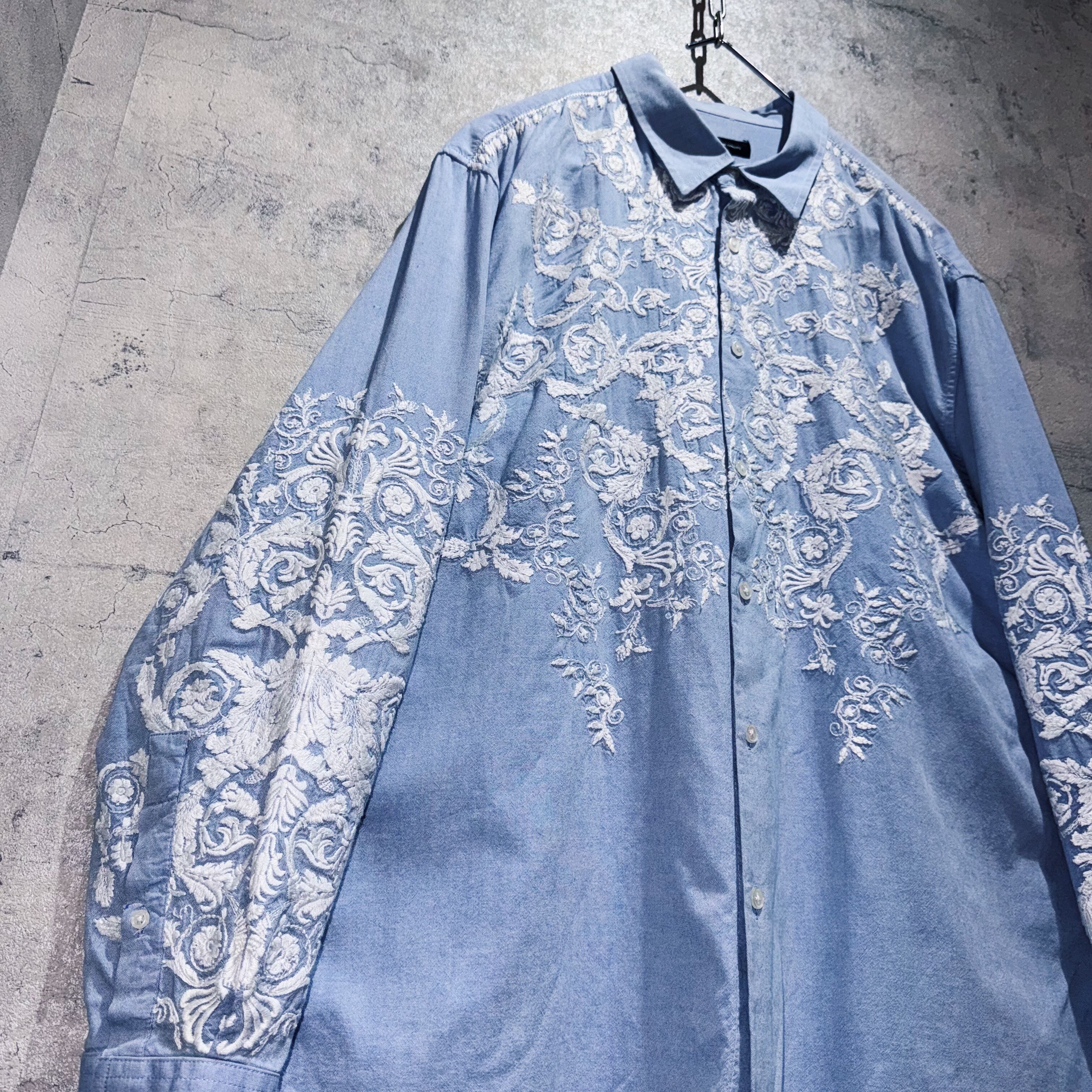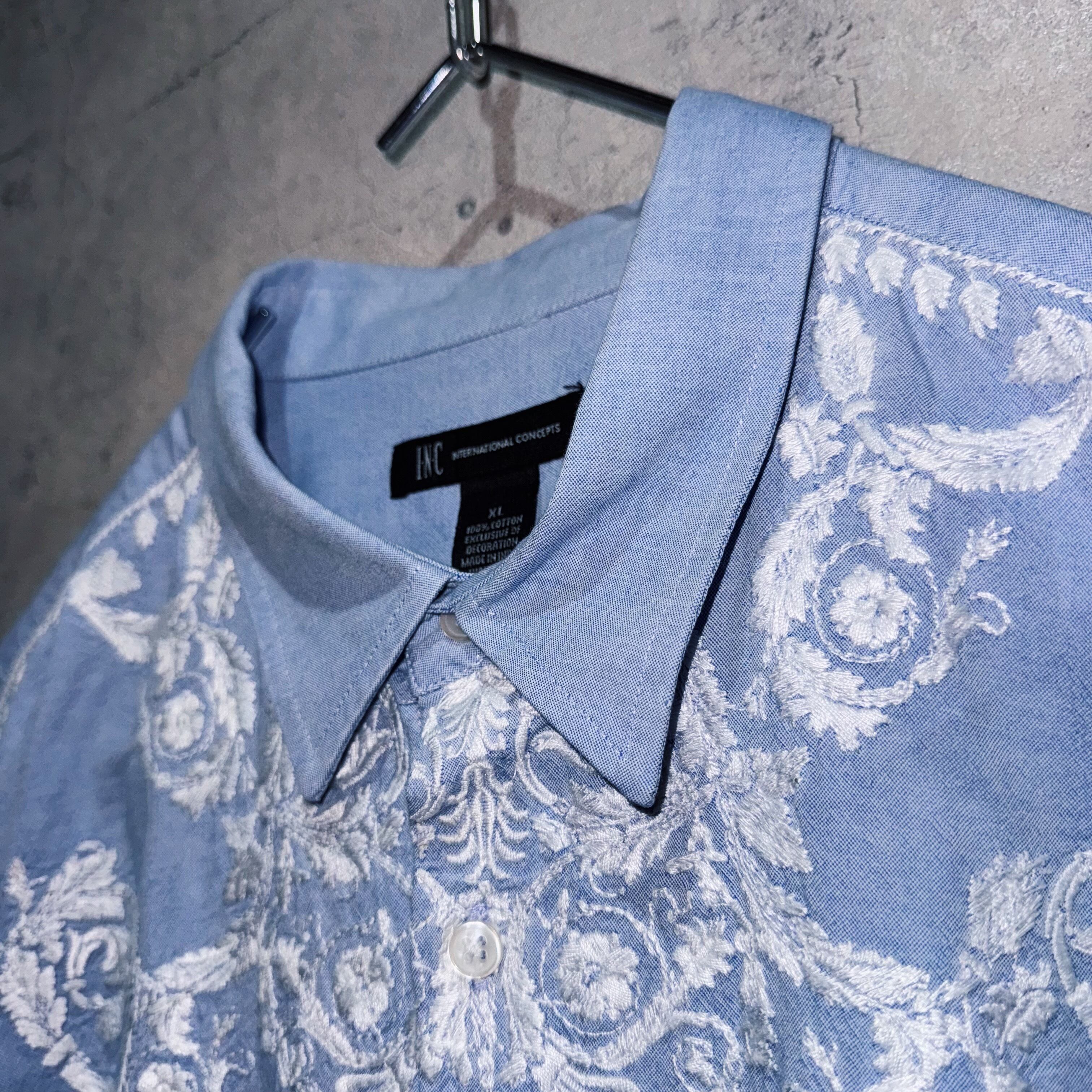 ボタニカルパターンエンブロイダリーデザインブルーカラーシャツ