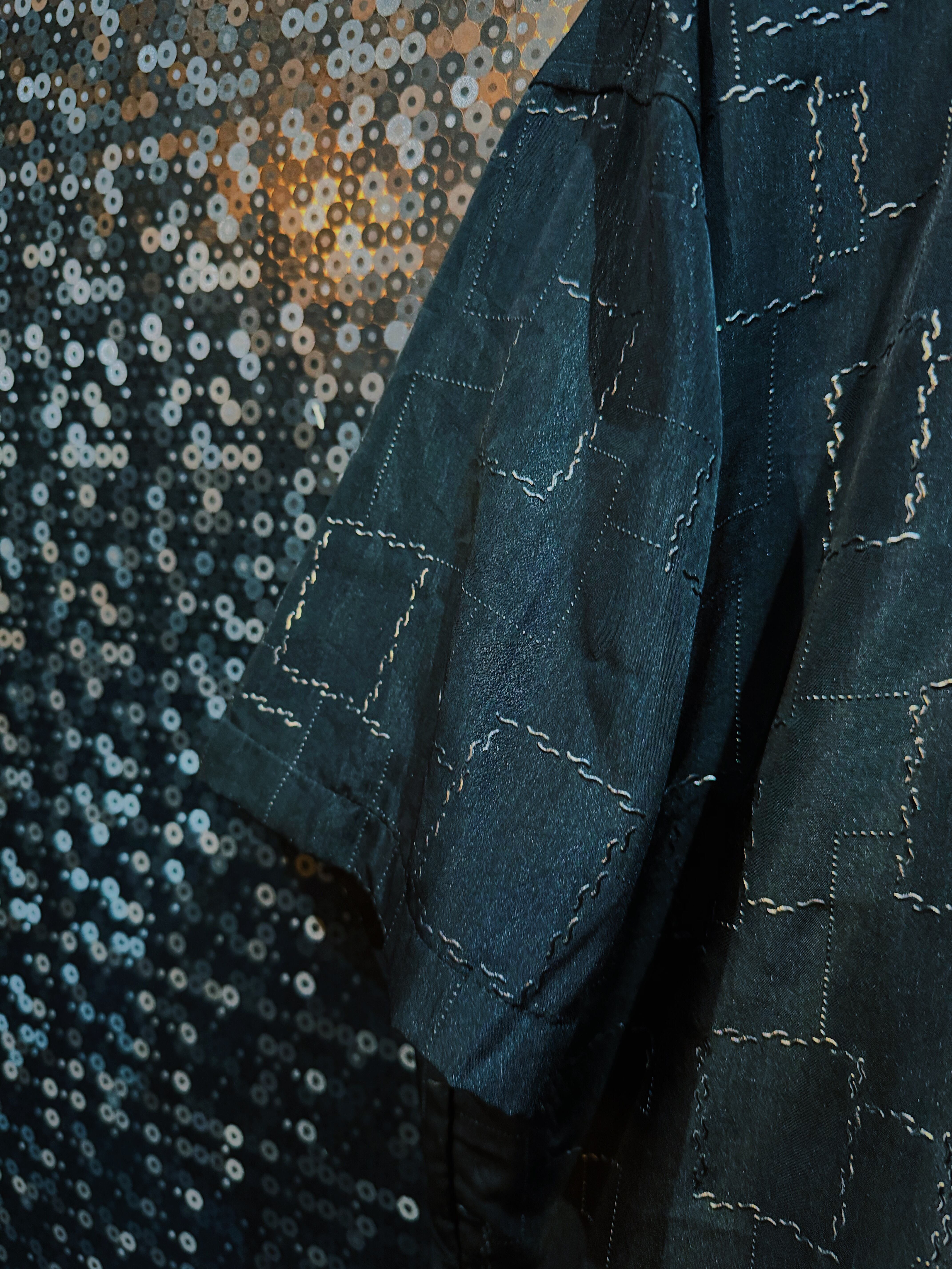 ブラックベースに浮かび上がるのは、まるで手縫いで描かれたかのようなステッチ風のスクエアパターンの逸品。