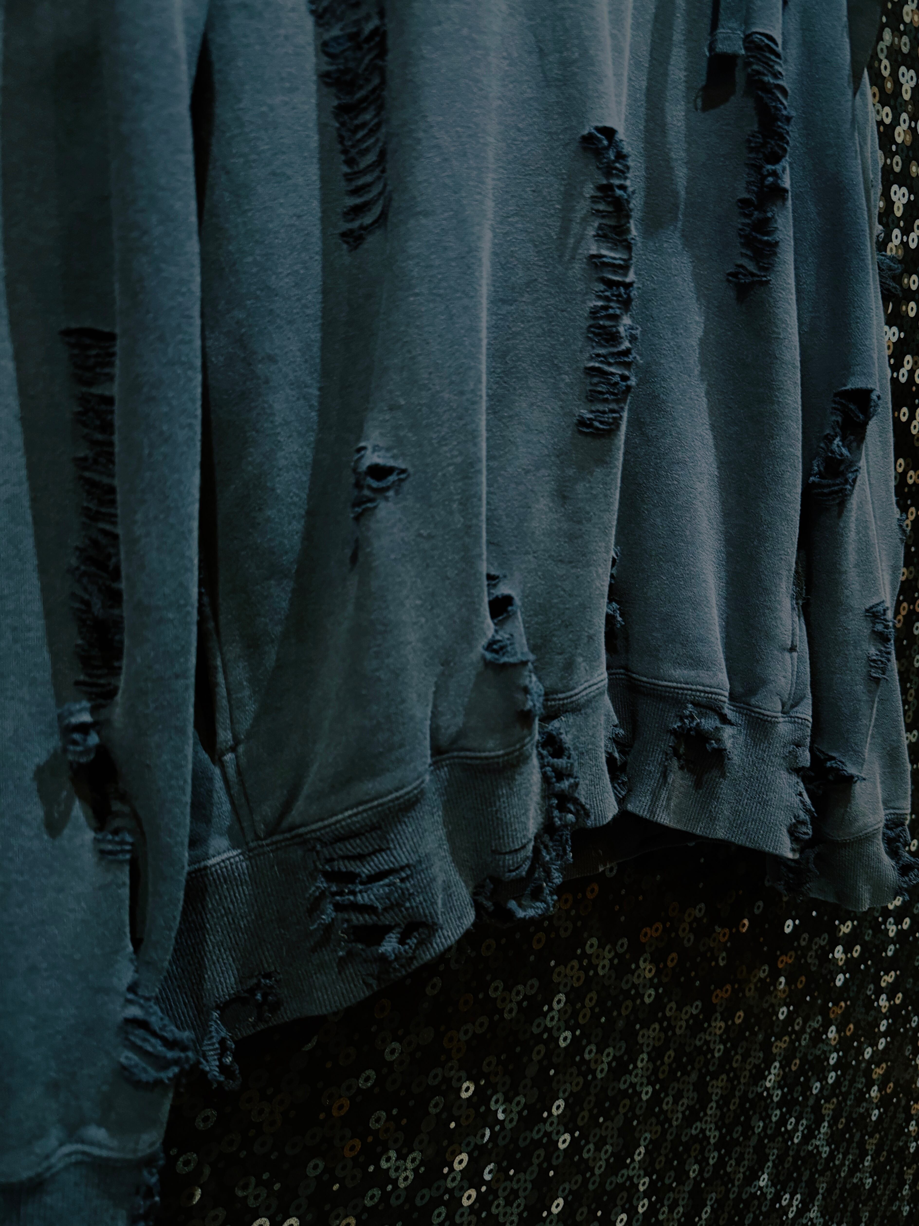 ネイビーボディに真っ白なロゴのコントラストが映えすぎてて、シンプルなのに目が離せない。そしてそこに容赦なくぶち込まれたボロ加工。袖、フード、胴体、どこを見ても穴だらけ。だけど、それがいい。