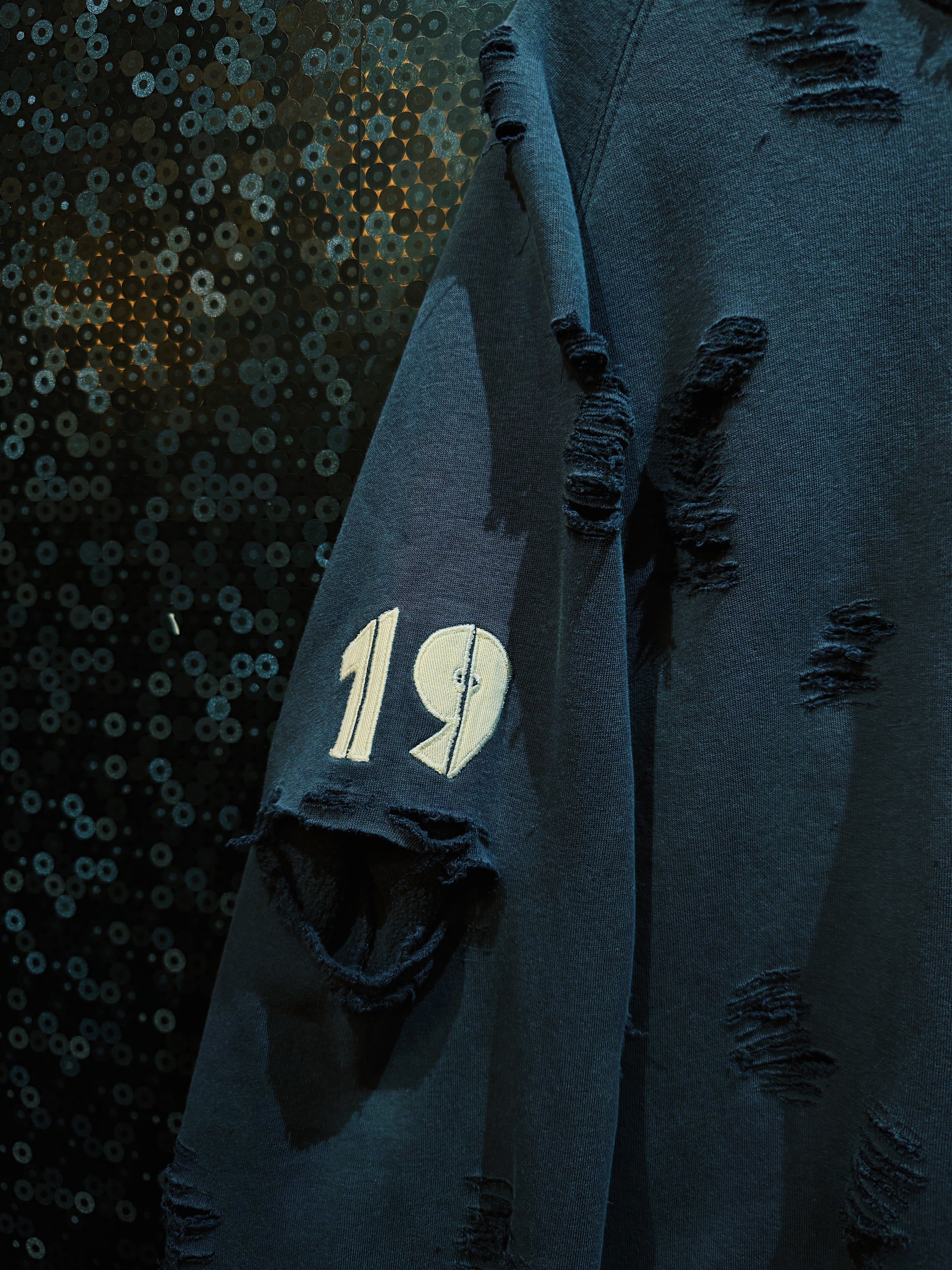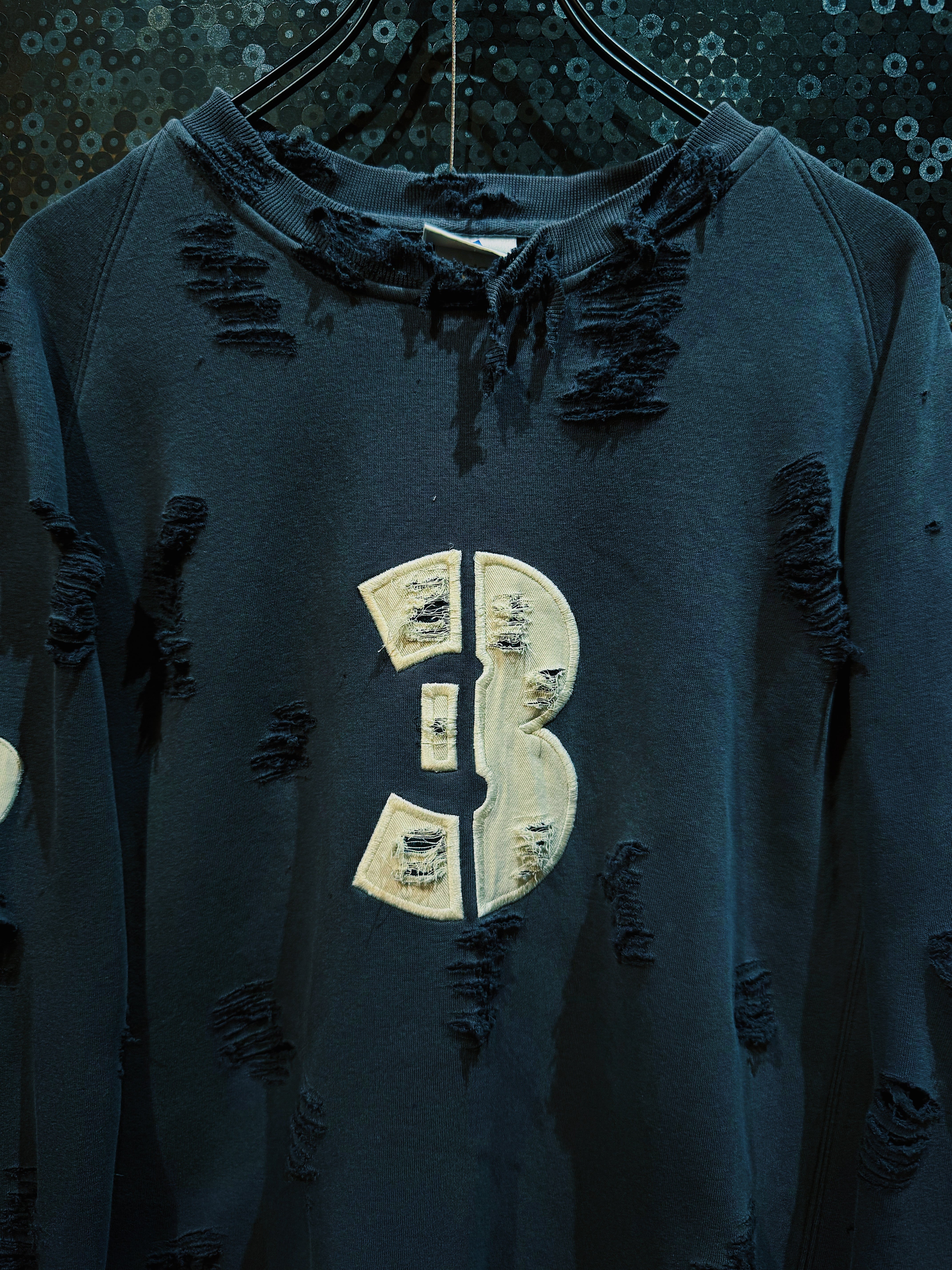 中央にデカデカと配置された「3」のナンバリング、その両腕に“19”と“49”を配置したスポーツライクなグラフィックに、全身ズタボロなクラッシュ加工がぶち込まれた逸品。