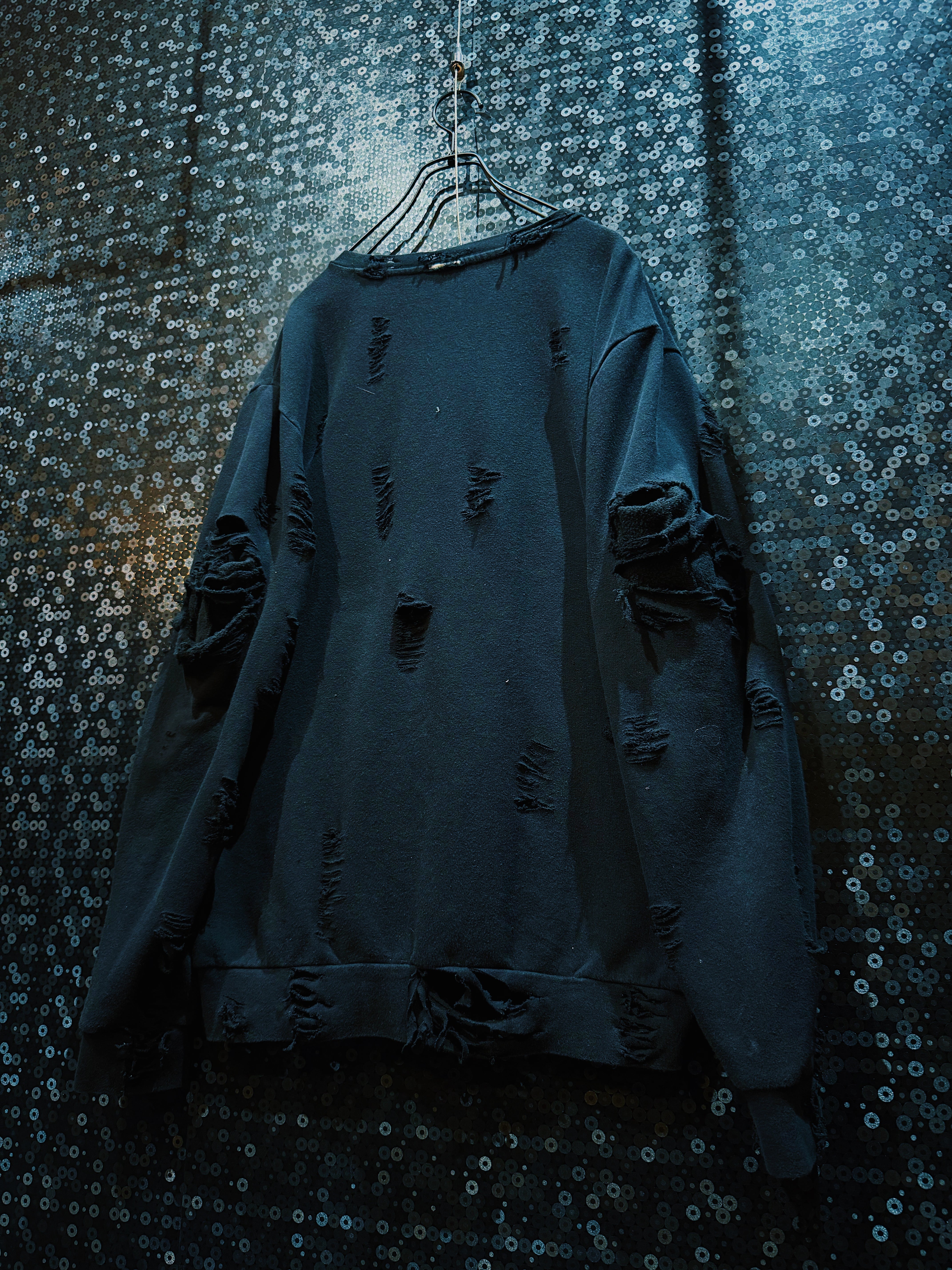 adidasのパフォーマンスロゴ入りブラックスウェットを、これでもかってくらいボロボロに仕上げた逸品。