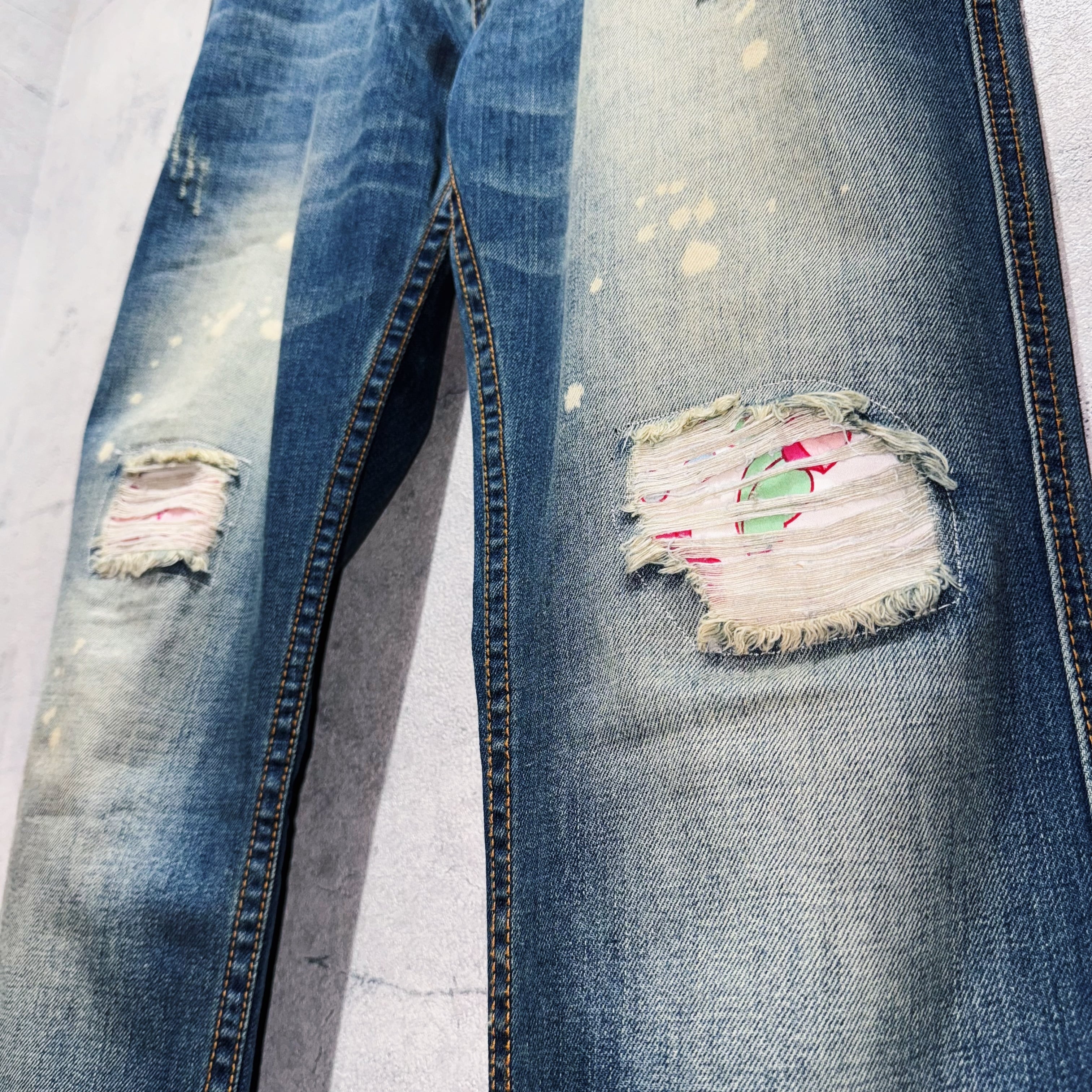 現在トレンドでもあるダメージ加工をあしらい非常に美しいストレートシルエットのデニムパンツ。ダメージ部分にはボタニカル柄の生地をあしらいアクセントにしています。