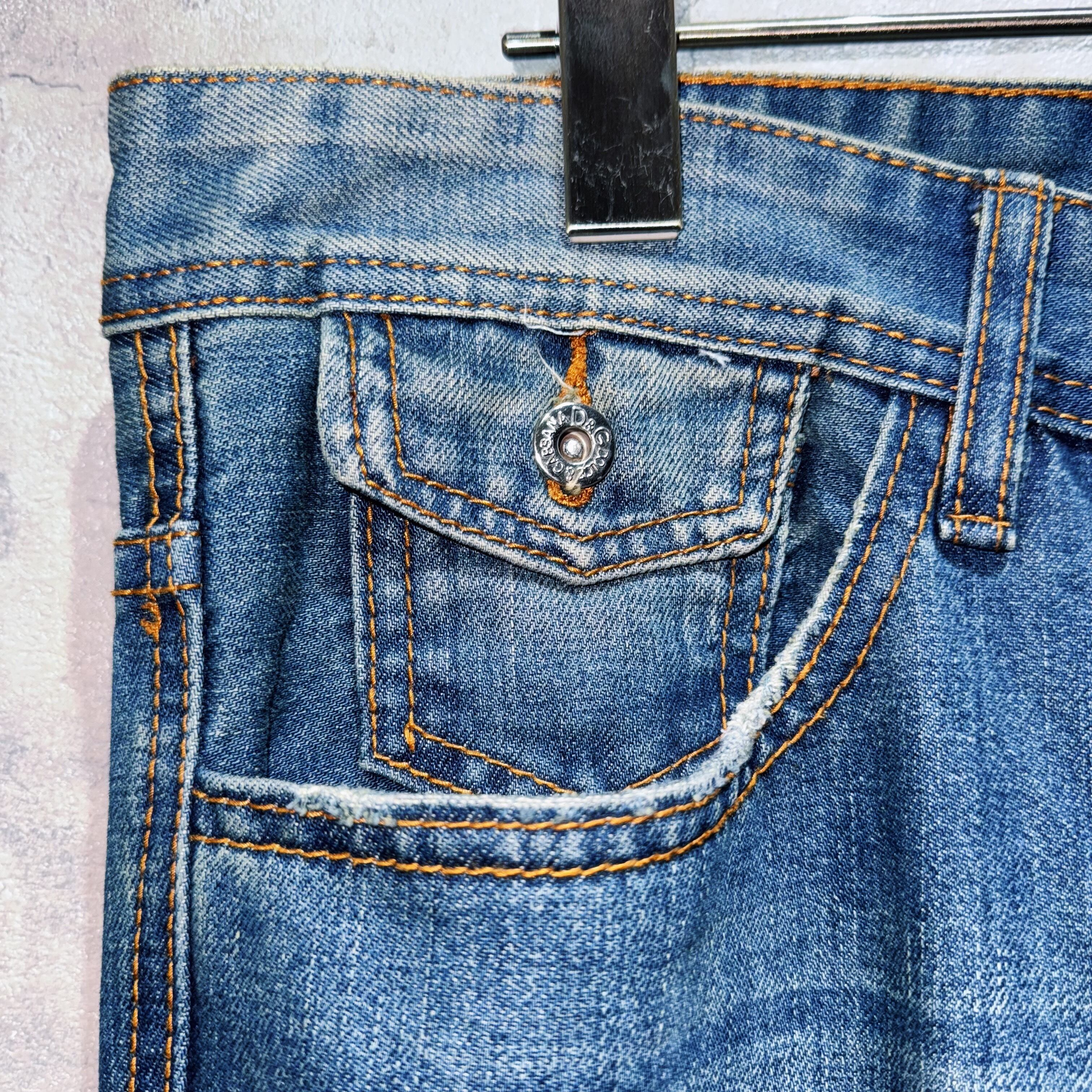 Levi'sの大戦モデルを彷彿させるようなドーナツボタン。バックポケットにはブランド名が刻まれたメタルパッチがあしらわれており、存在感を演出。