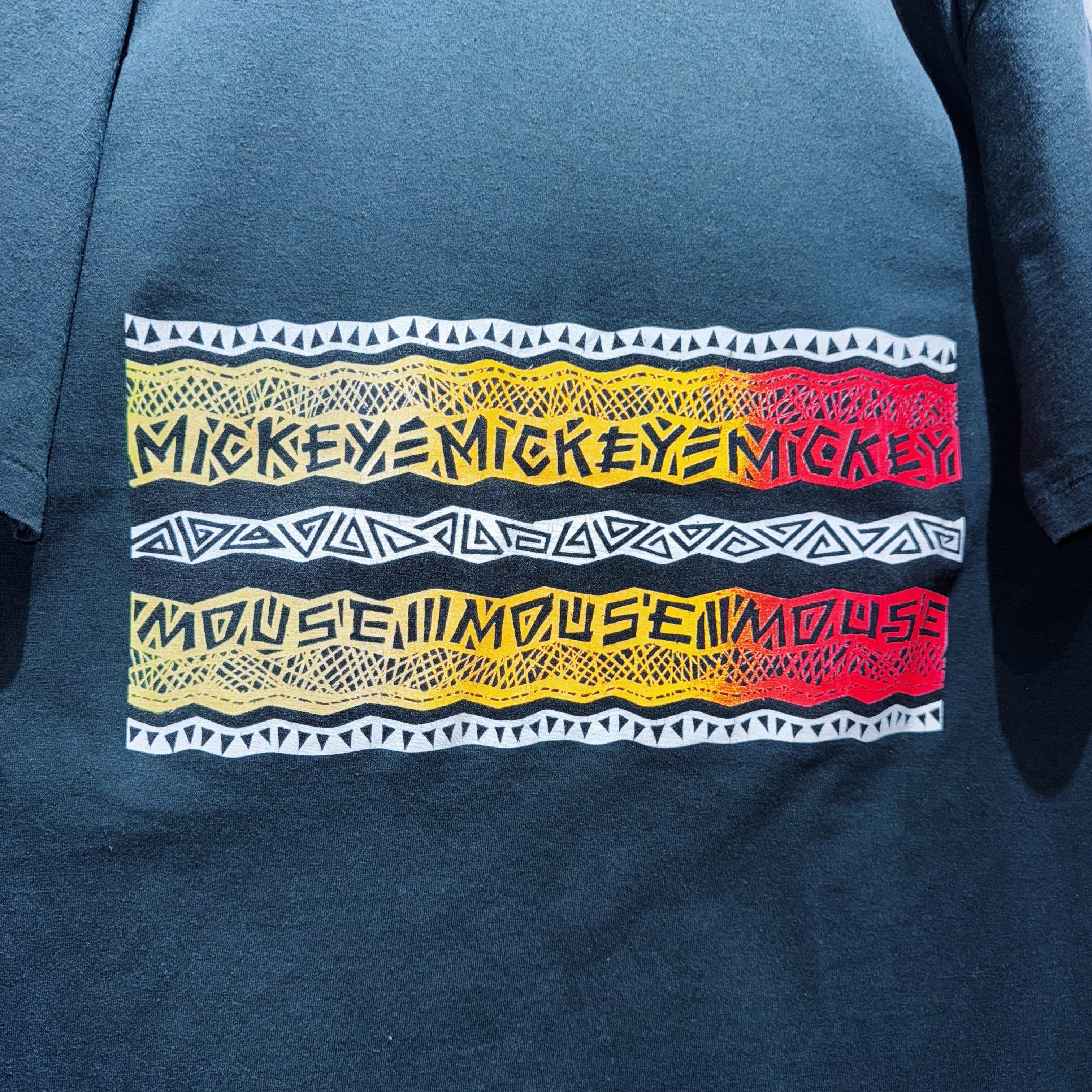 レトロな風合い漂うミッキーのデザインがあしらわれたグラフィックTシャツ。周りのグラフィックが古代文明っぽくてかなりイケてます。
