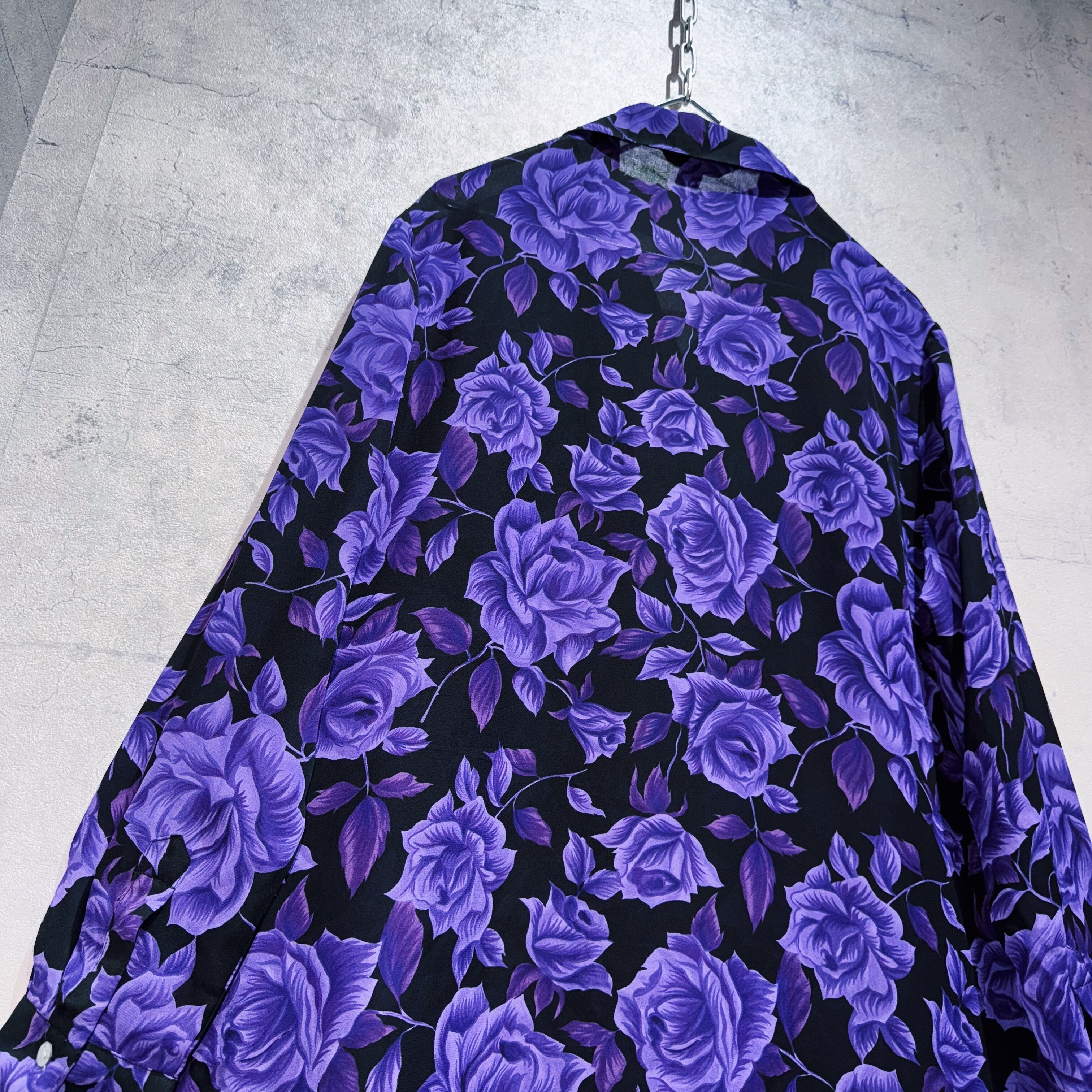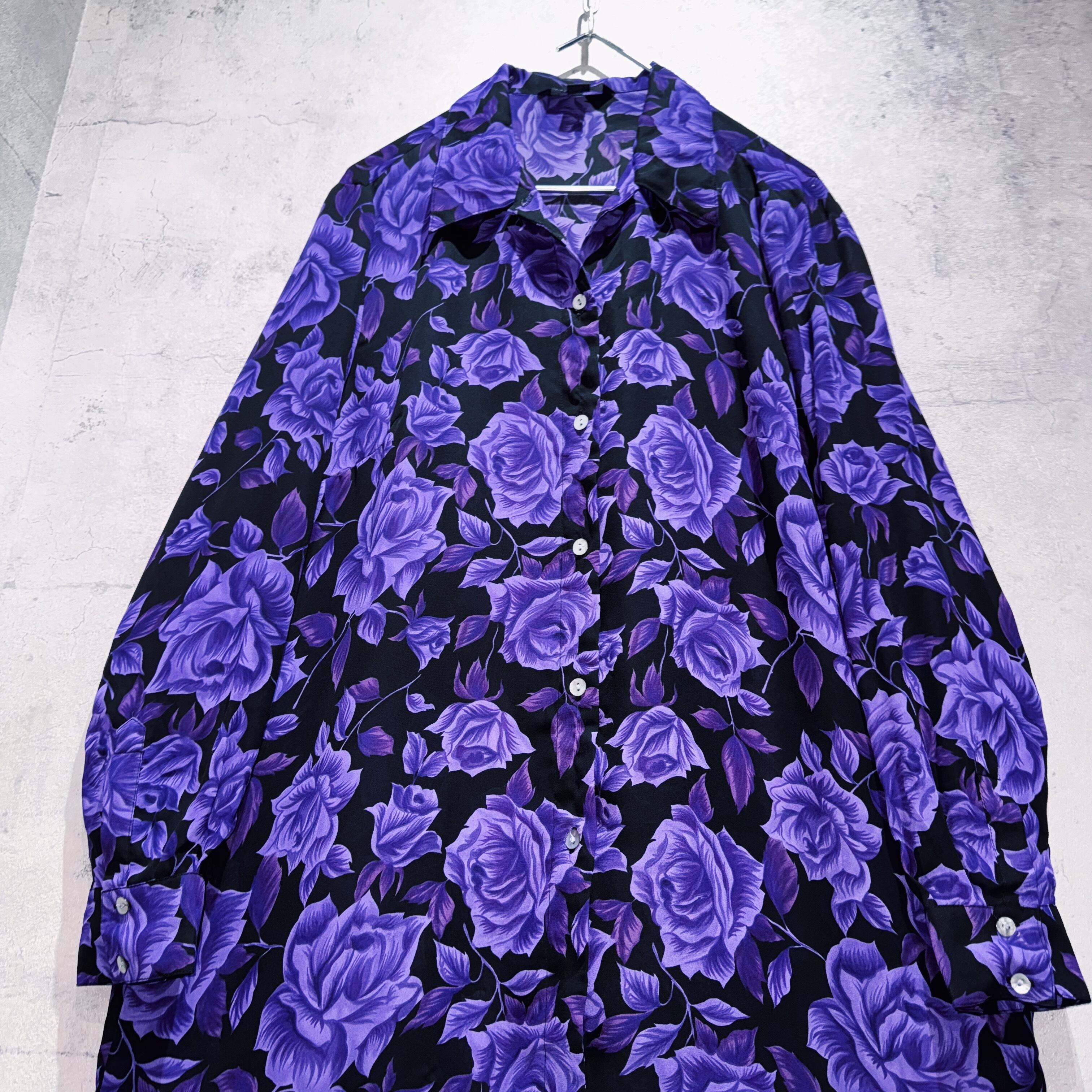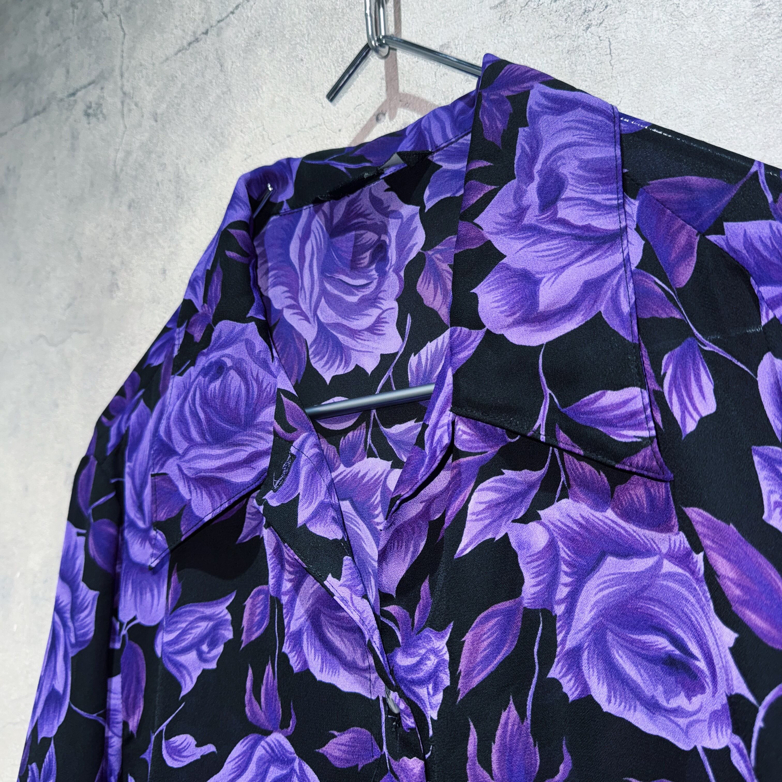 美しく咲き誇る紫色の薔薇柄デザインを全面にあしらったエレガンスなデザインシャツ。黒のボディに咲き誇る花々は圧巻の佇まい。