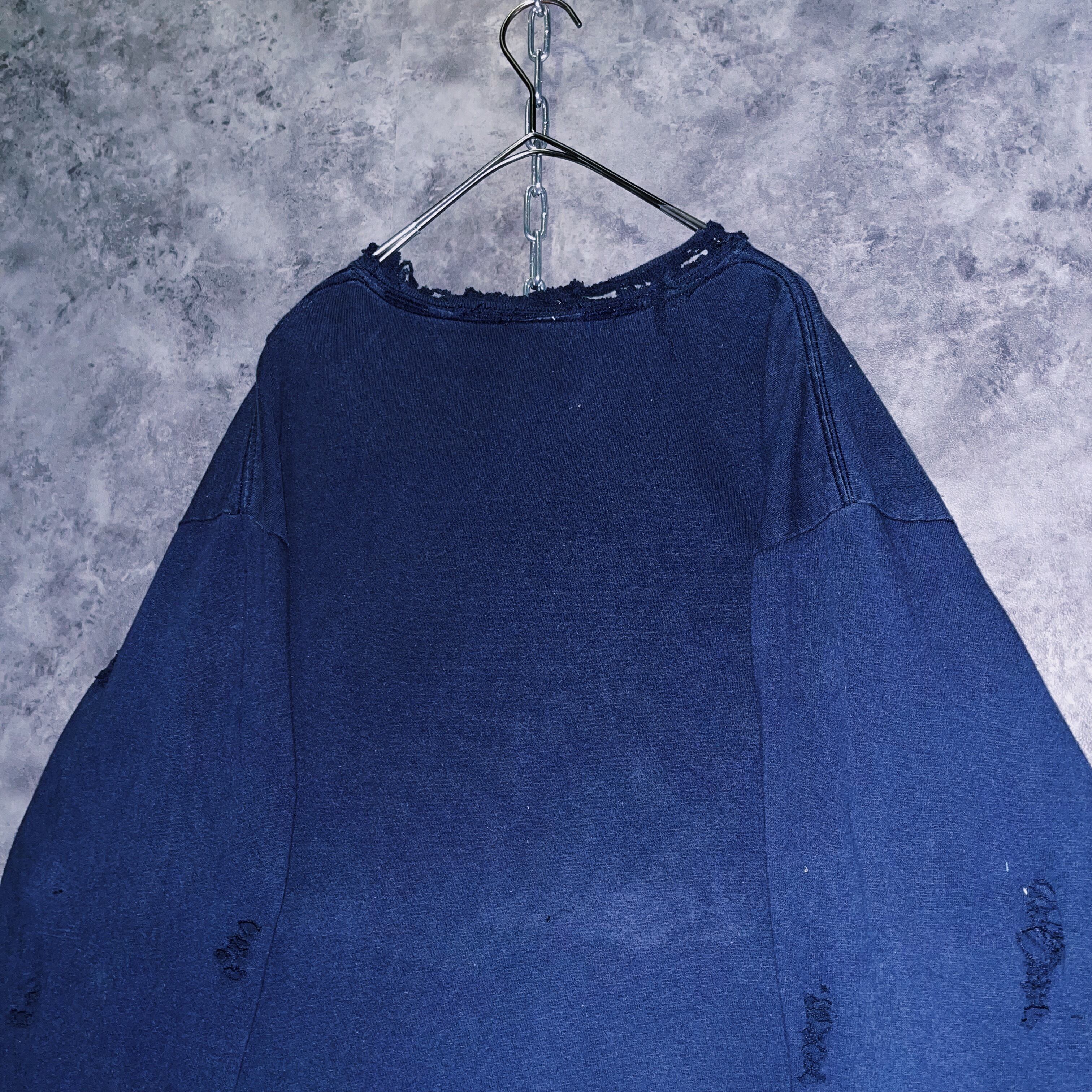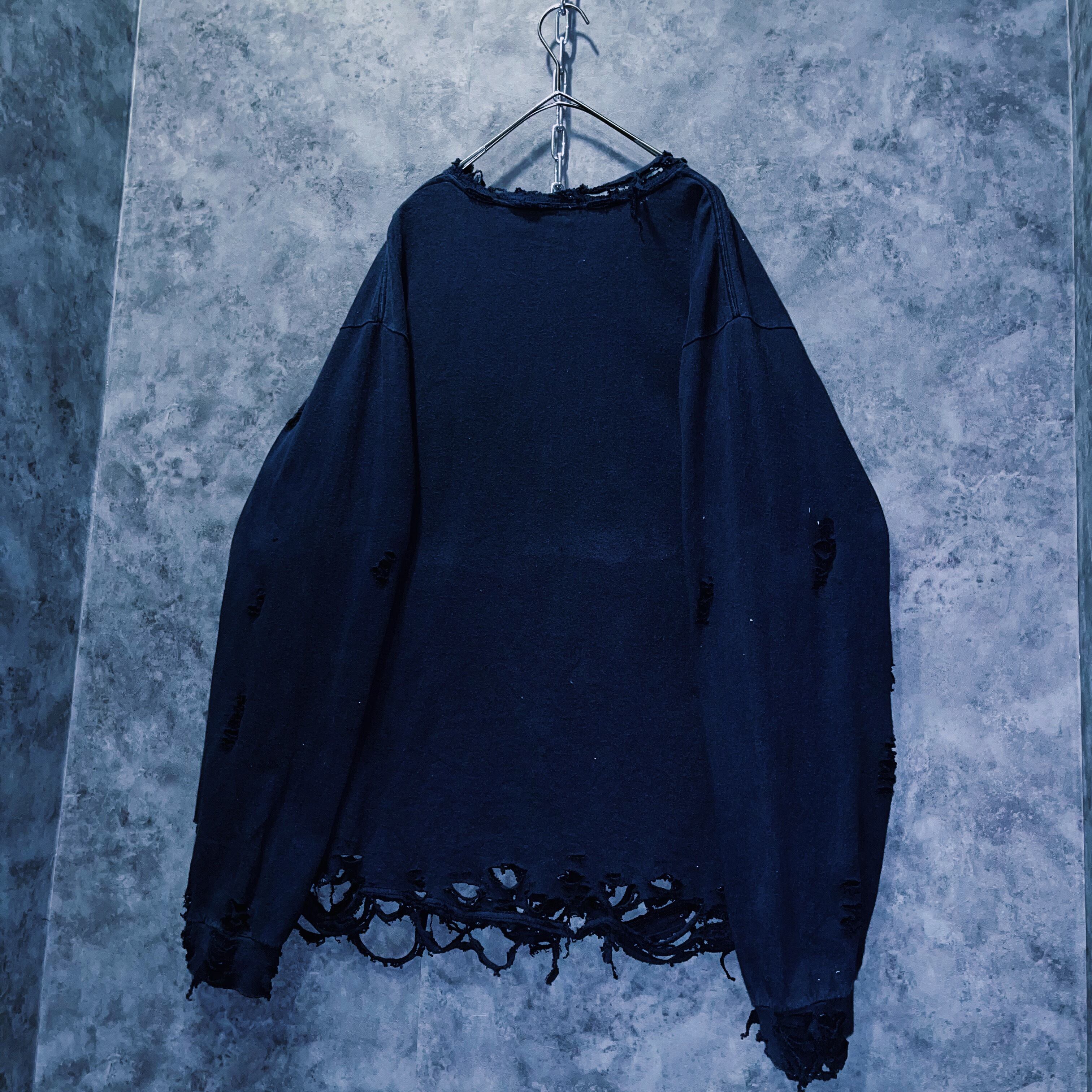 リブ中心に絶妙な加減で施されたダメージにオーバーなサイズ感がトレンドであるグランジ・ロック感も含んだ逸品。