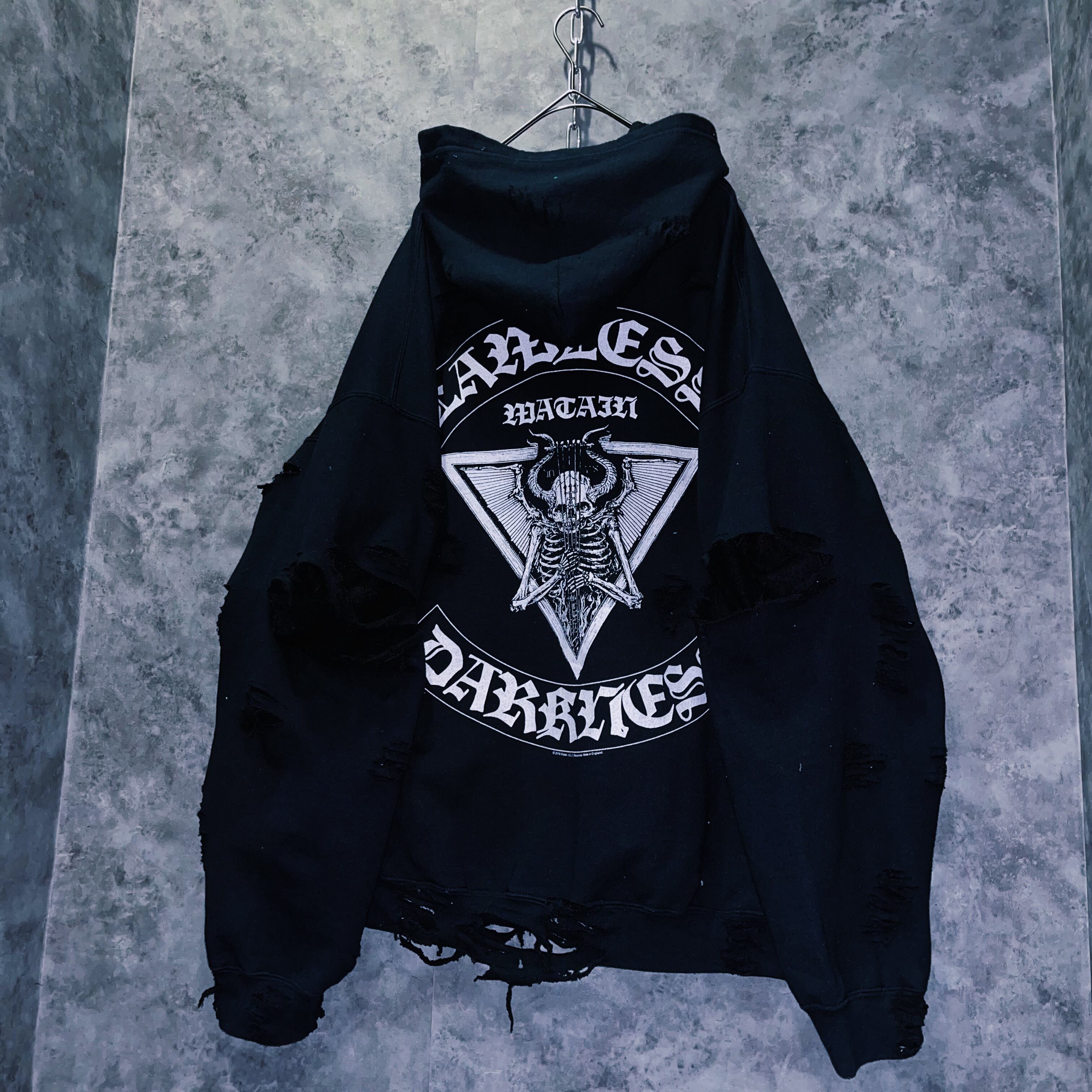 フロントに圧倒的存在感のトライバルデザインプリントがなされ、バックには角を持ったスカルデザイン。元の素材がすでにロック、グランジ感満載なデザイン。