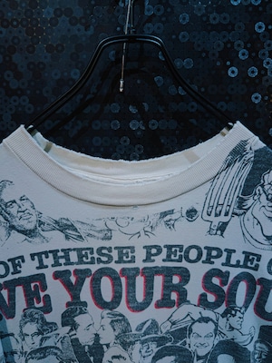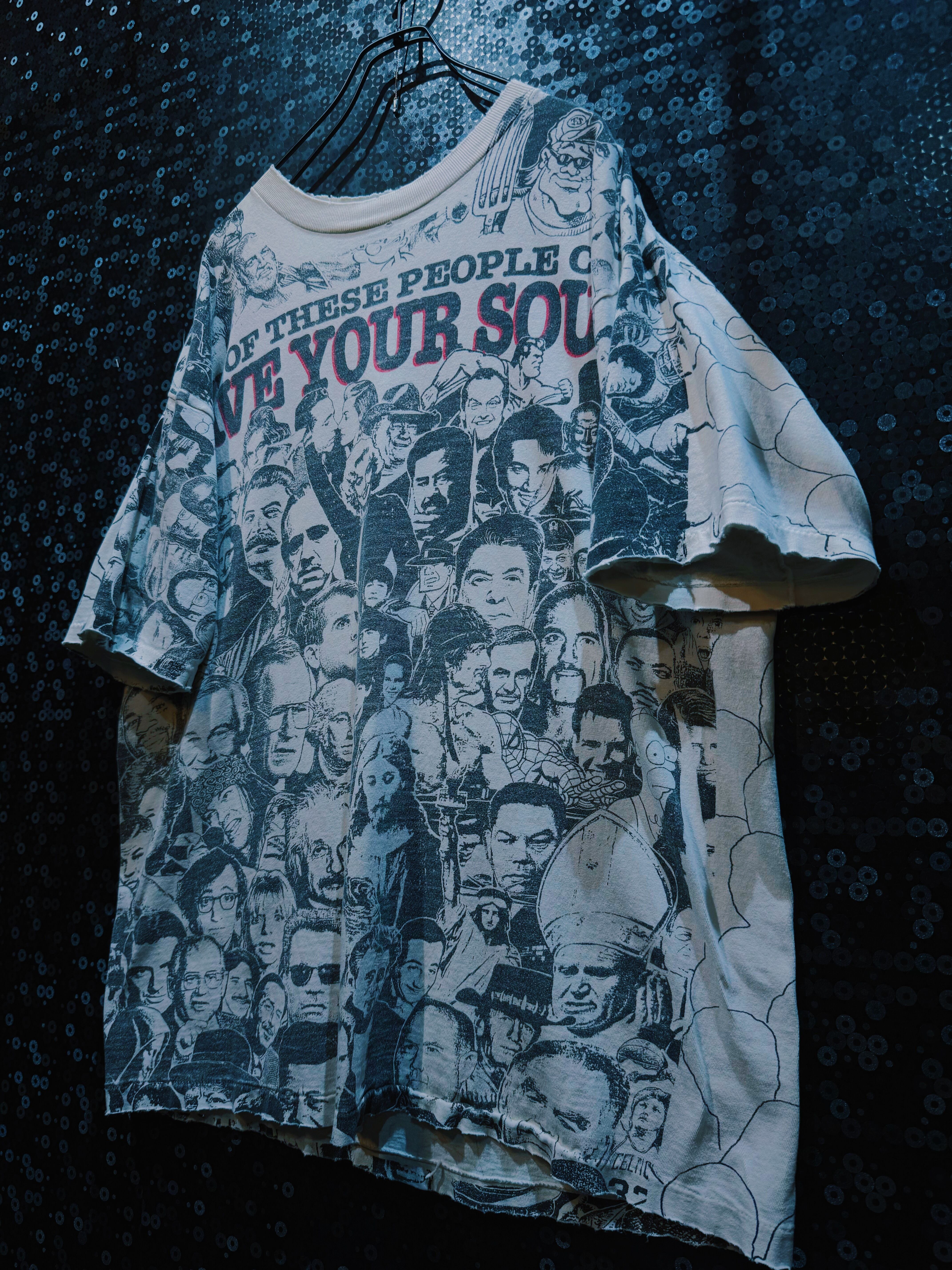 インパクト大のヴィンテージTシャツ。全体にびっしりとプリントされたのは、歴史に名を刻んだセレブリティや著名人たちの顔、顔、顔。その数、ざっと50人以上。アインシュタイン、シュワルツェネッガー、マリリン・モンローからスーパーマンまで、ジャンルも時代も超越したカオスなコラージュが、他にない存在感を放ってる。