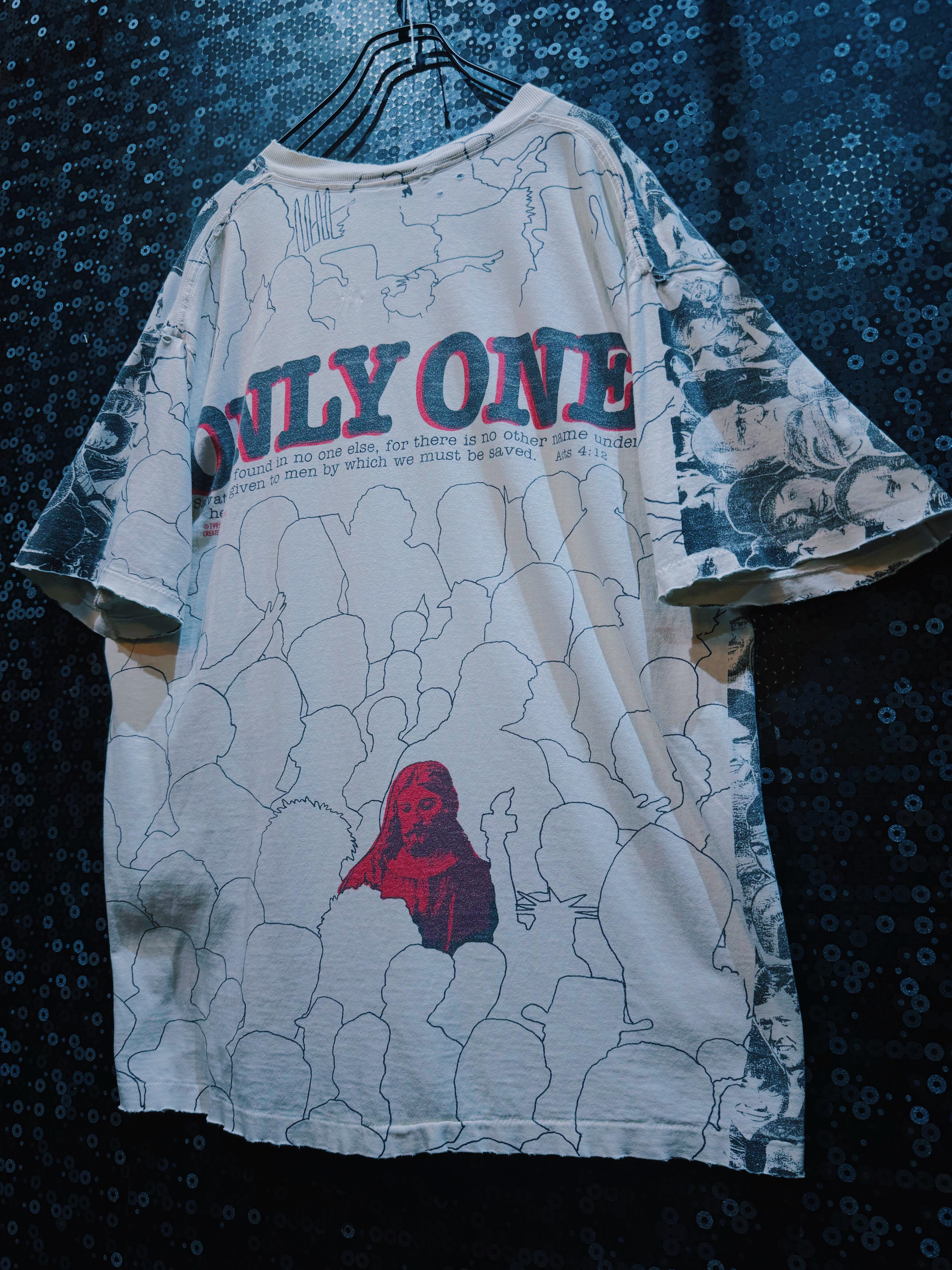 胸元には「OF THESE PEOPLE CAN SAVE YOUR SOUL(この中の誰かがお前の魂を救うかもな)」という挑発的なフレーズがレイアウト。首元のダメージ、全体の色褪せとクタっとしたボディがリアルな経年変化を刻んでて、まさに一点モノの風格。XLサイズのゆるっとしたシルエットで、ストリートでもアートでもハマる仕上がり。着るというより、語るTシャツ。