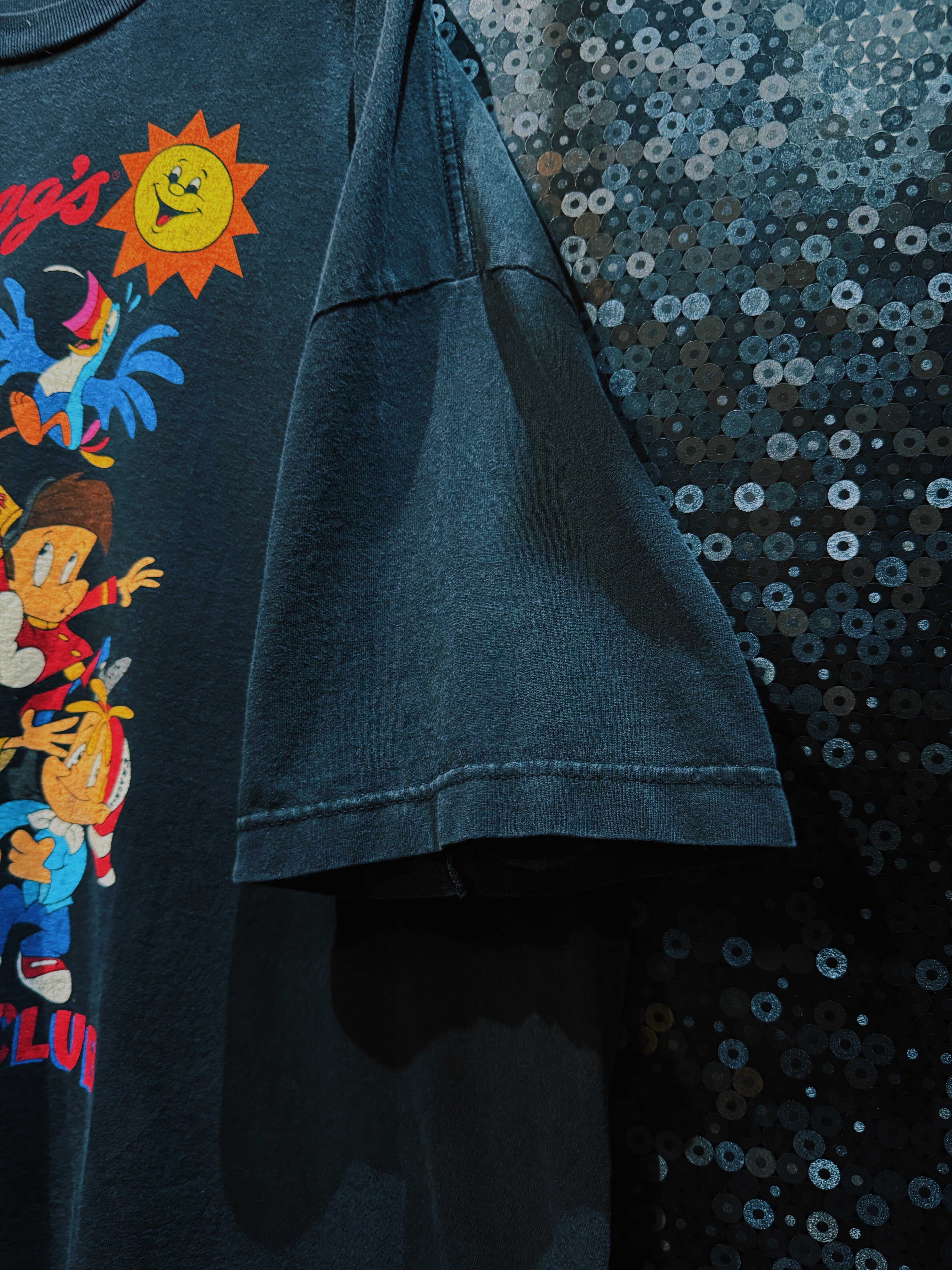 ケロッグの人気キャラクターたちが勢揃いした、夢の共演Tシャツ。トニー・ザ・タイガー、サニーボーイ、トゥーカン・サム、ポップス、スナップ・クラッケル・ポップなど、朝を彩るあの仲間たちがコミカルに描かれたヴィンテージデザイン。