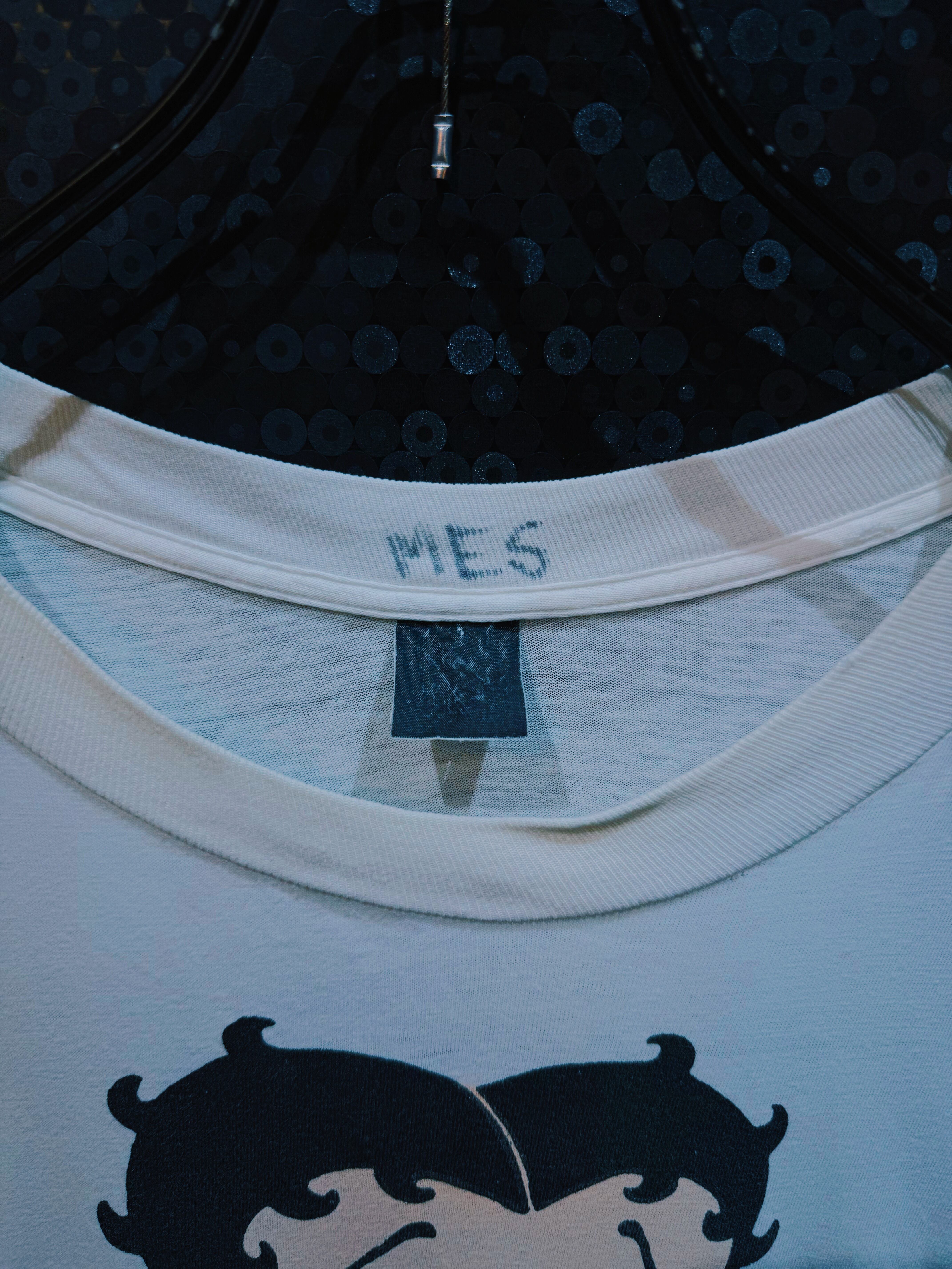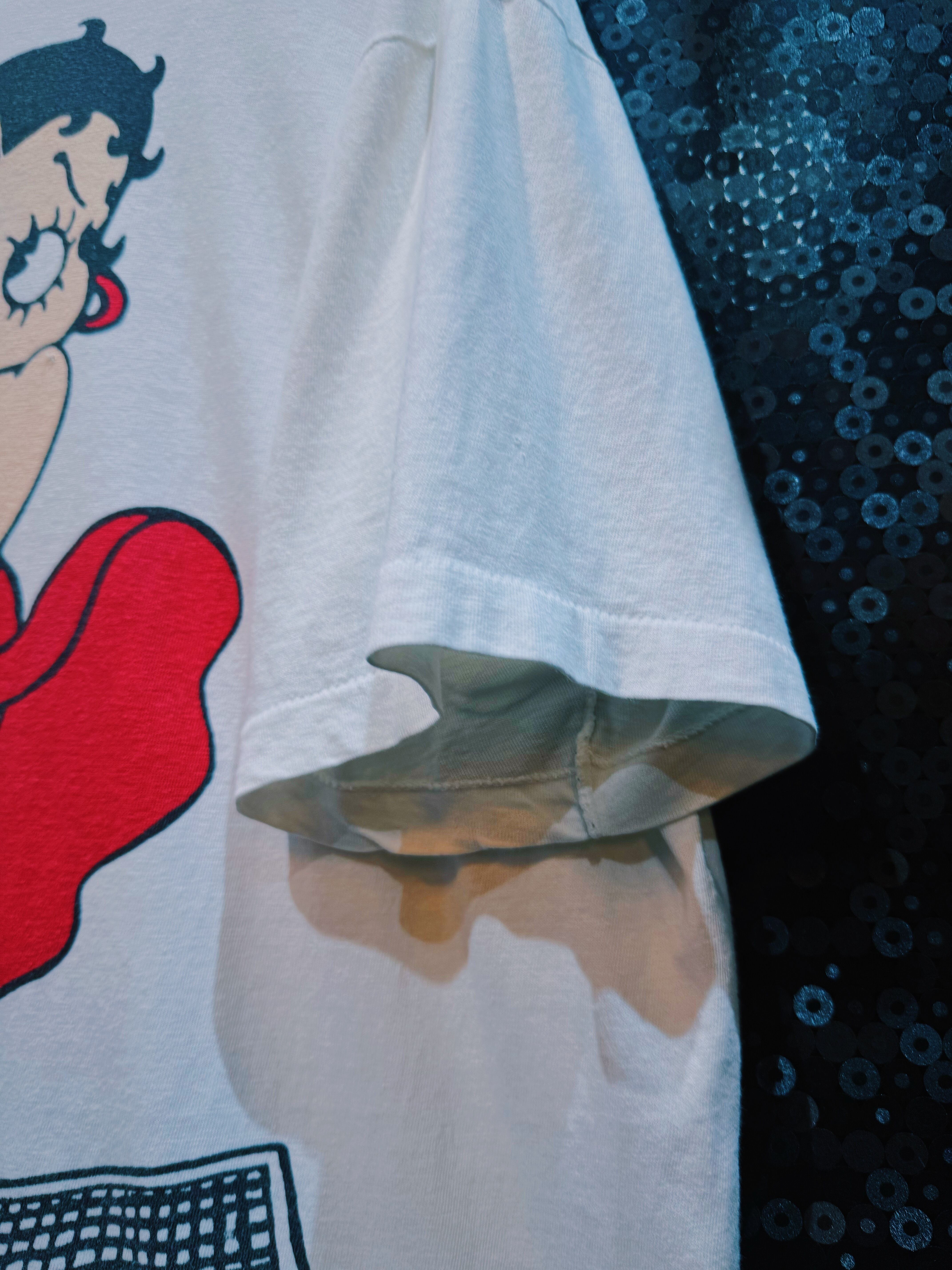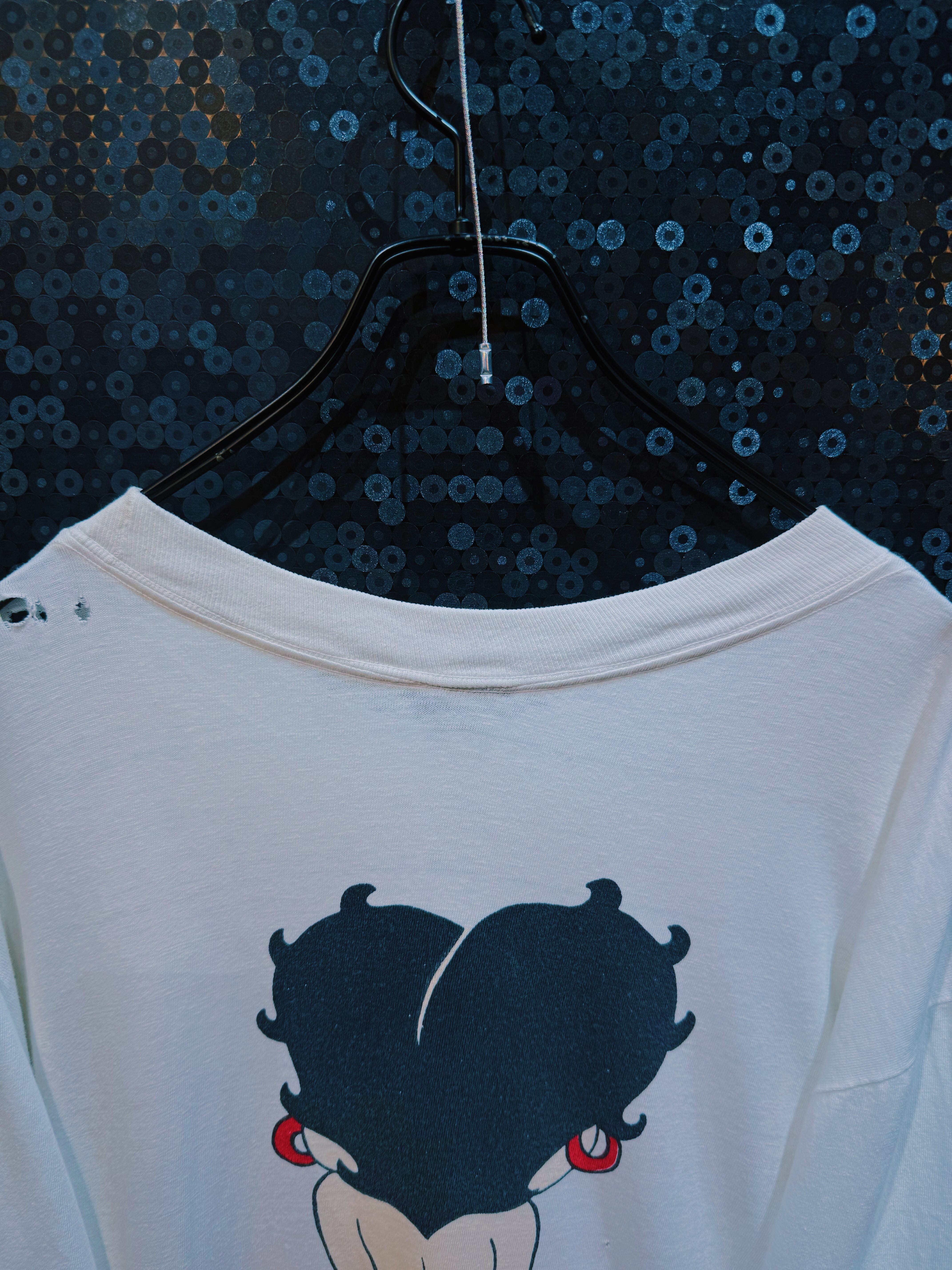ベティ・ブープの象徴的なレッドドレス姿がど真ん中にプリントされた、ポップでキュートなホワイトTシャツ。ただのグラフィックTじゃ終わらない。随所に施されたダメージ加工が、エンドユーザーによるカスタムによってアートピースへと昇華されてる。