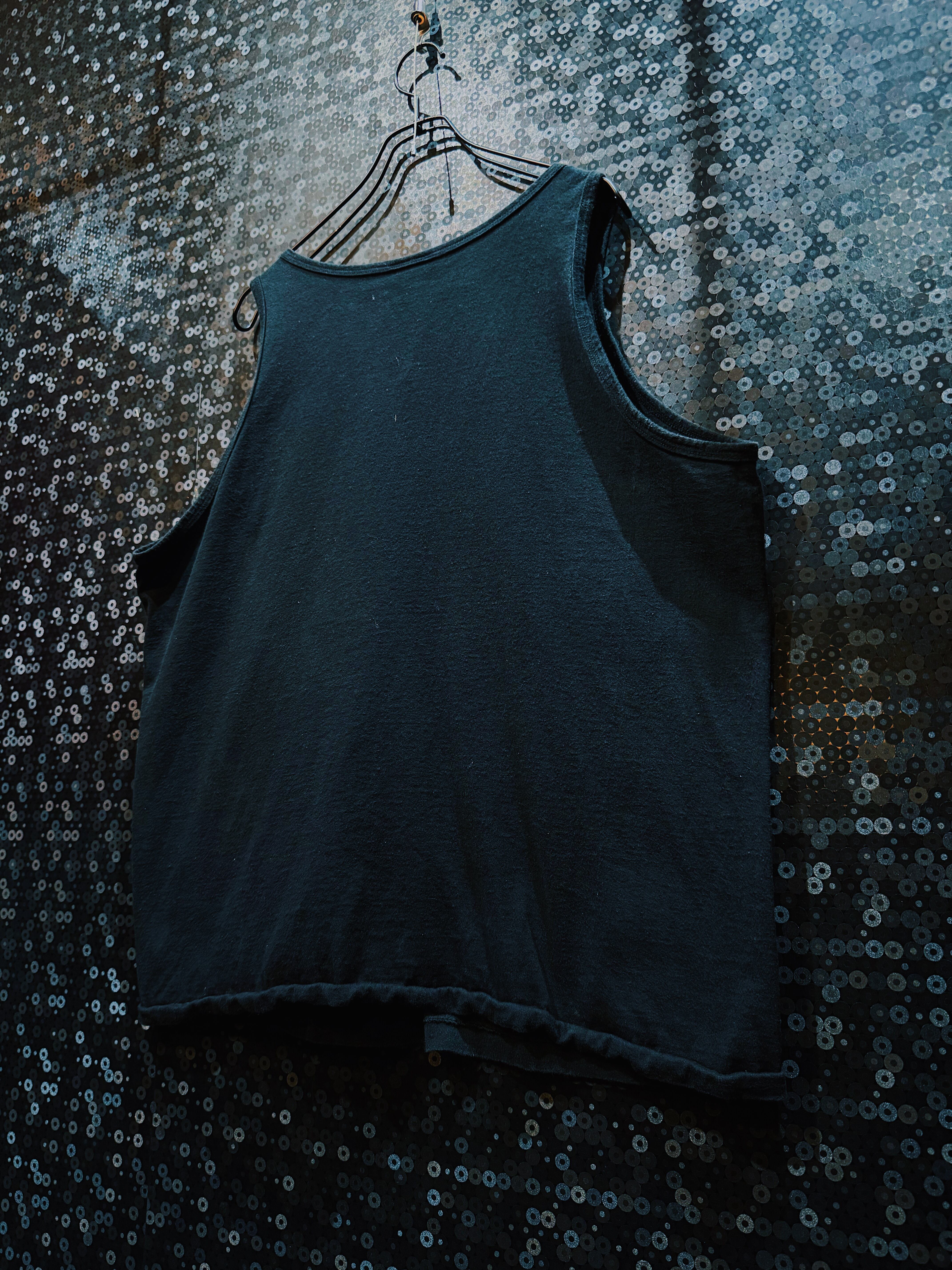 ボディはGiant by Anvil製のUSA製ヘビーウェイトタンクトップ。ボディの質感も厚手でしっかりしており、タンクトップながらタフに着こなせるヴィンテージ仕様。プリントの発色も良く、黒ボディに映えるブルーのグラデーションが圧巻。