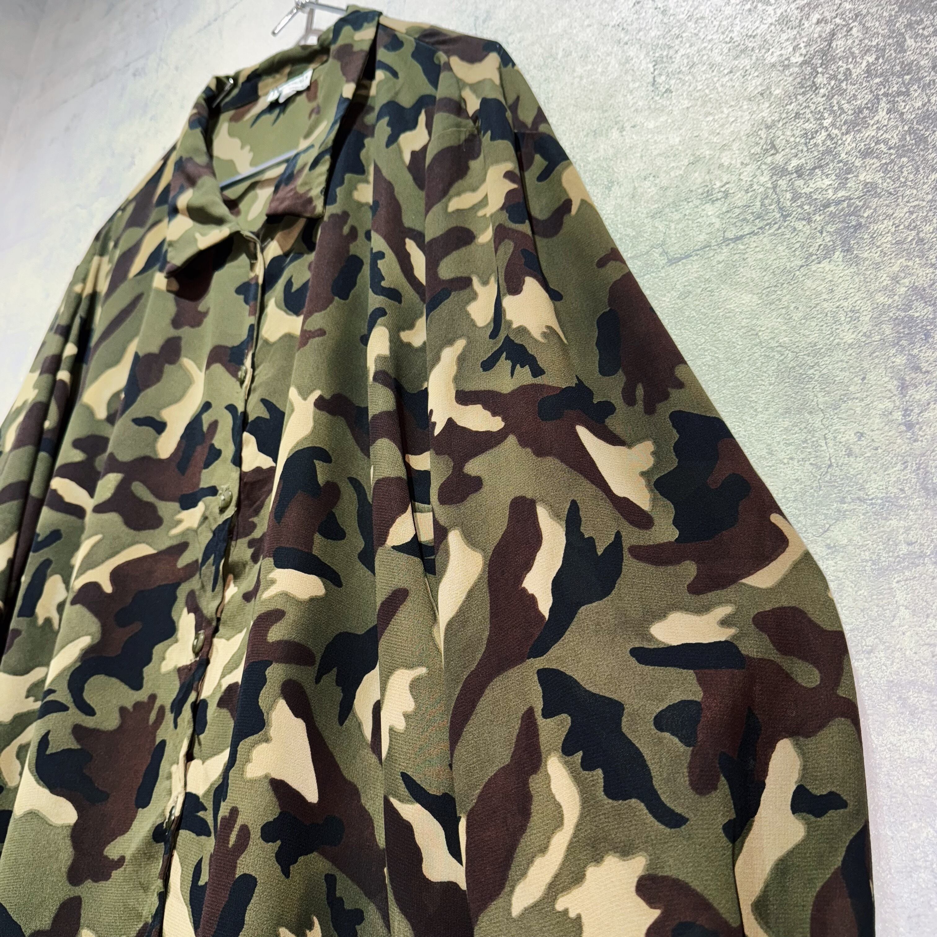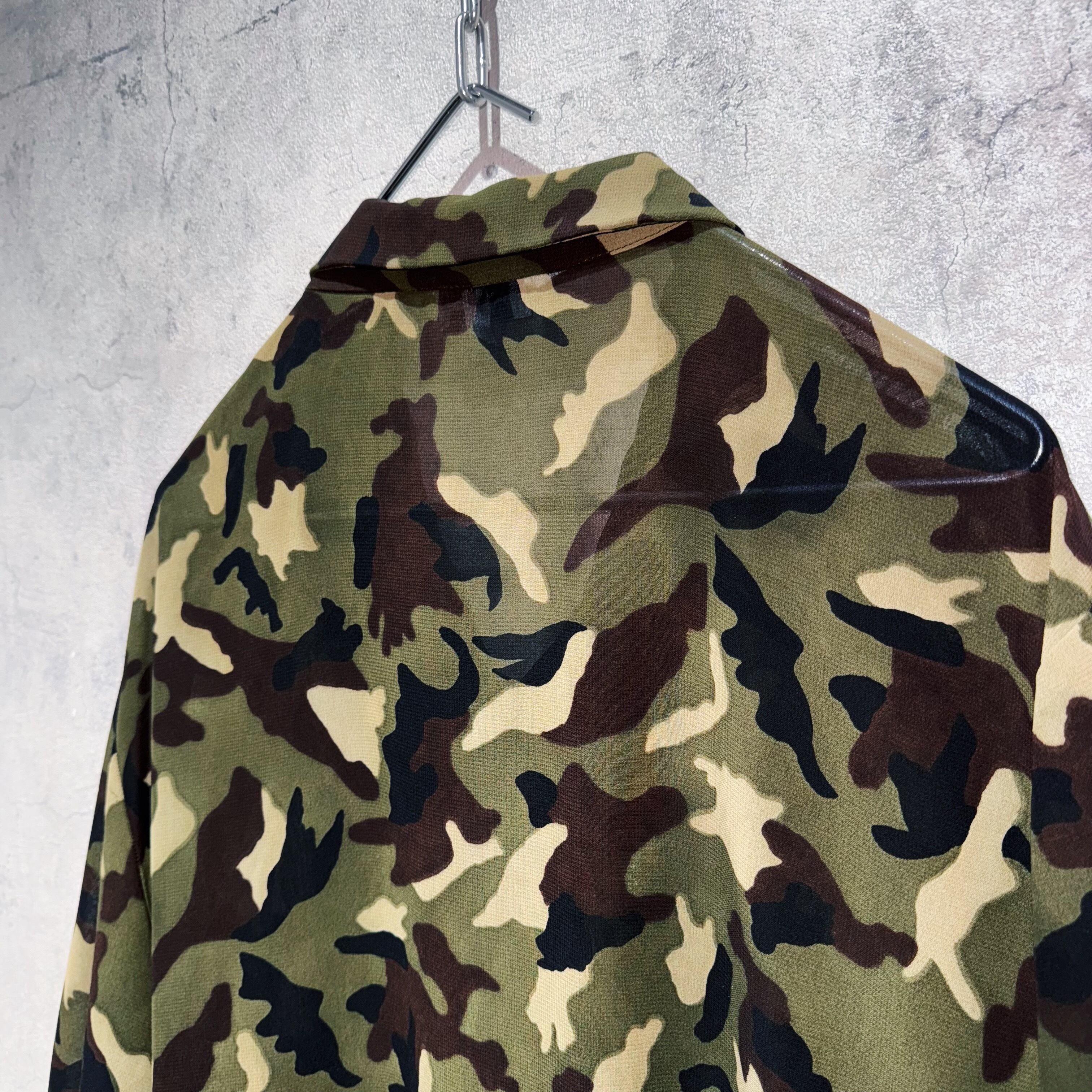 現在のファッションシーンでもトレンドであるカモフラージュパターンを全目にあしらったシアーシャツ。パンツで履いている人はちょくちょく見かけますが、シャツタイプは中々ないですね。