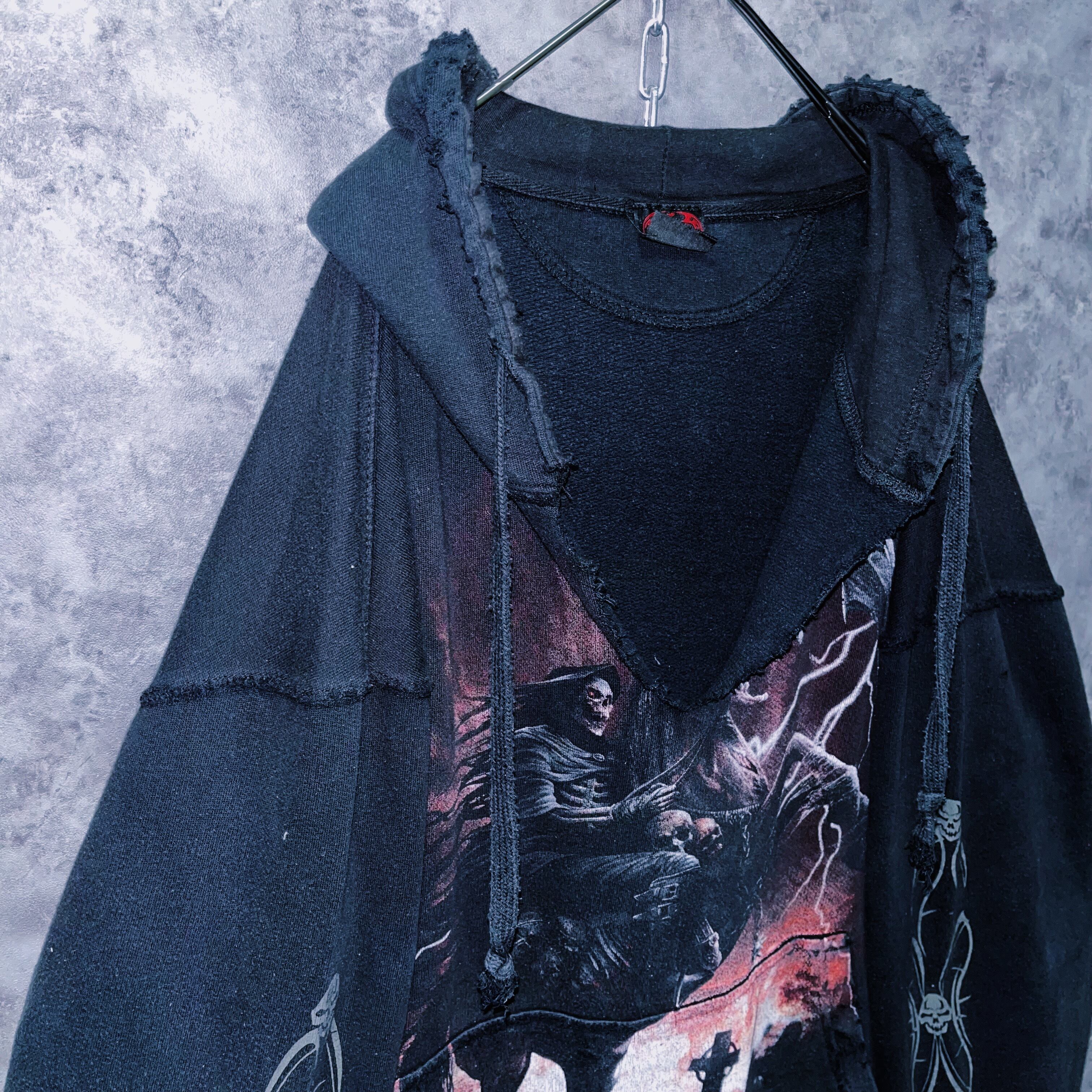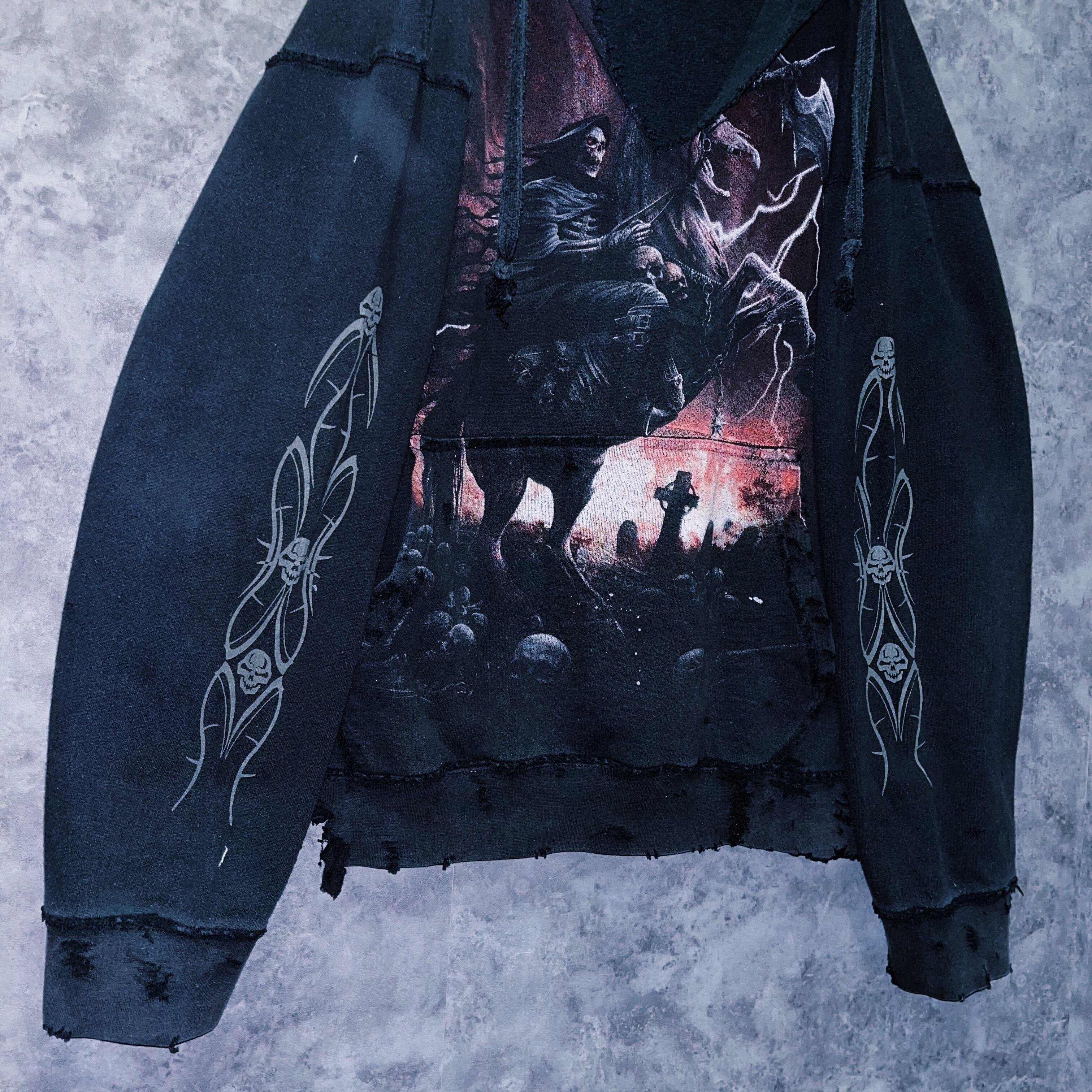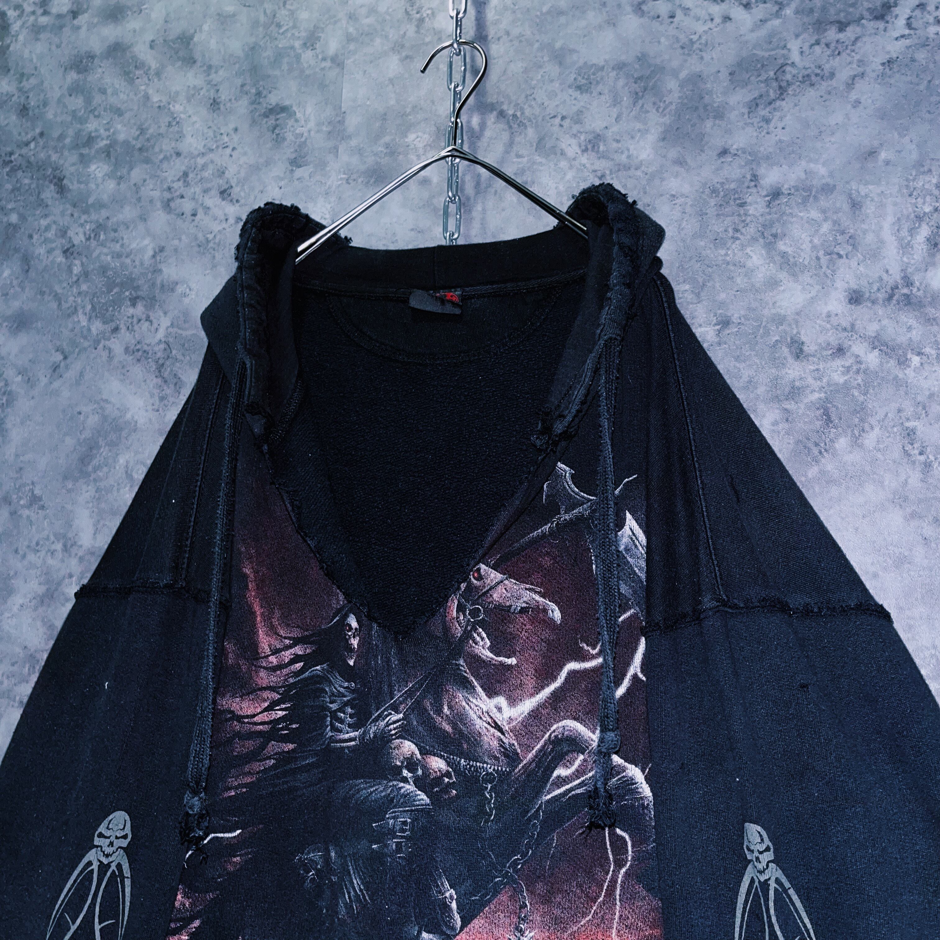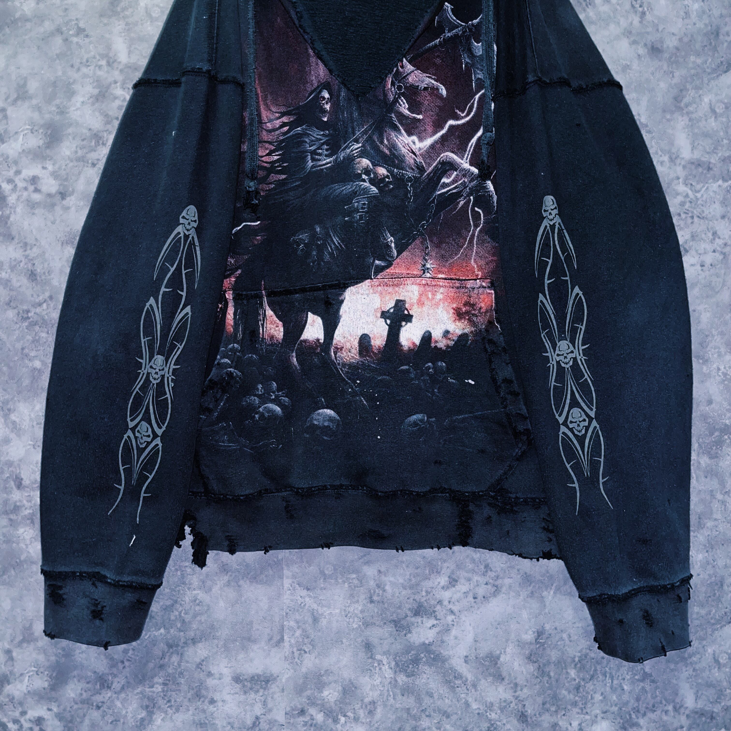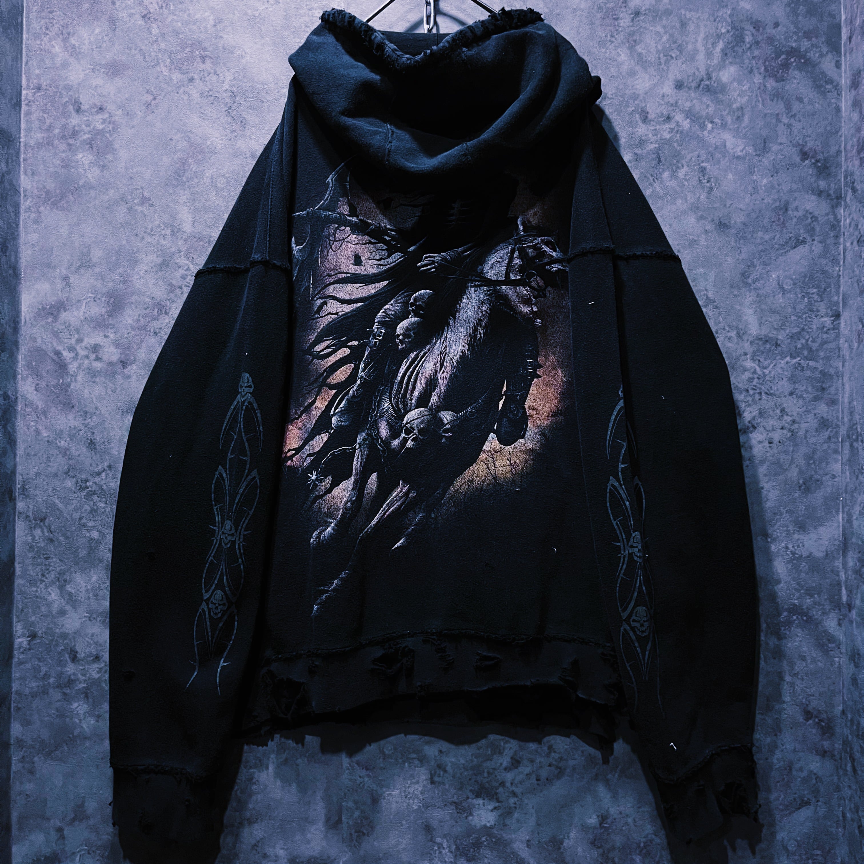 ブラックボディの生地にデザインされた馬にまたがる骸骨。禍々しいプリントフーディに当店自慢のボロカスタムを施した一枚。