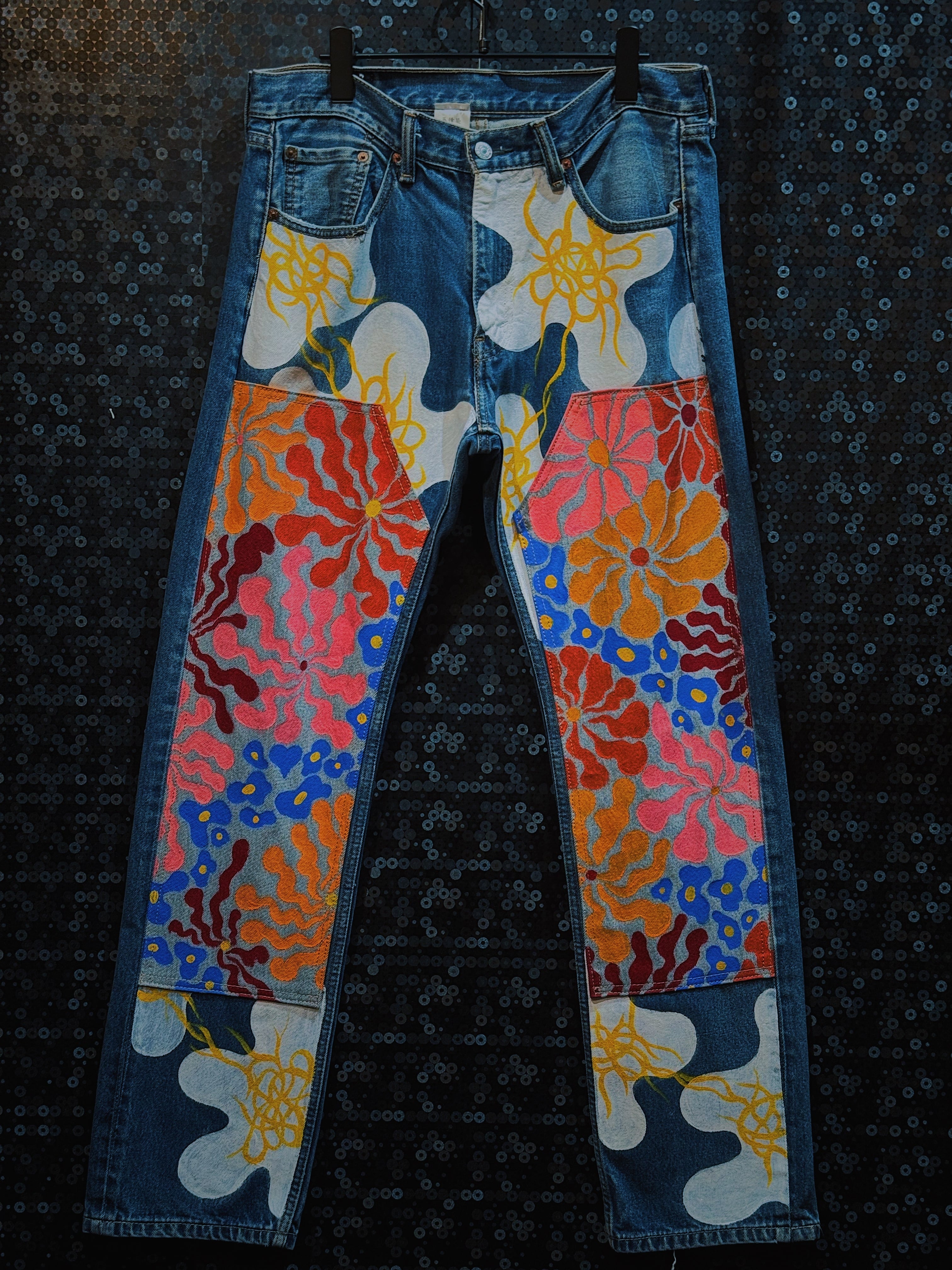 再倖築が手掛けた、圧倒的な存在感を放つハンドペイントデニム。ベースはヴィンテージのLevi’sを採用し、フロント全面に鮮烈な色彩のフラワーパターンと有機的なウェーブ模様を描き込んでいる。