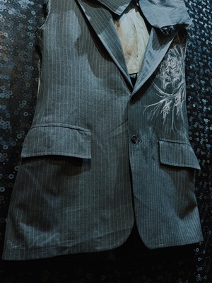 ベースにはクラシックなピンストライプのテーラードジャケットを採用し、その上に大胆な再構築を施した逸品。