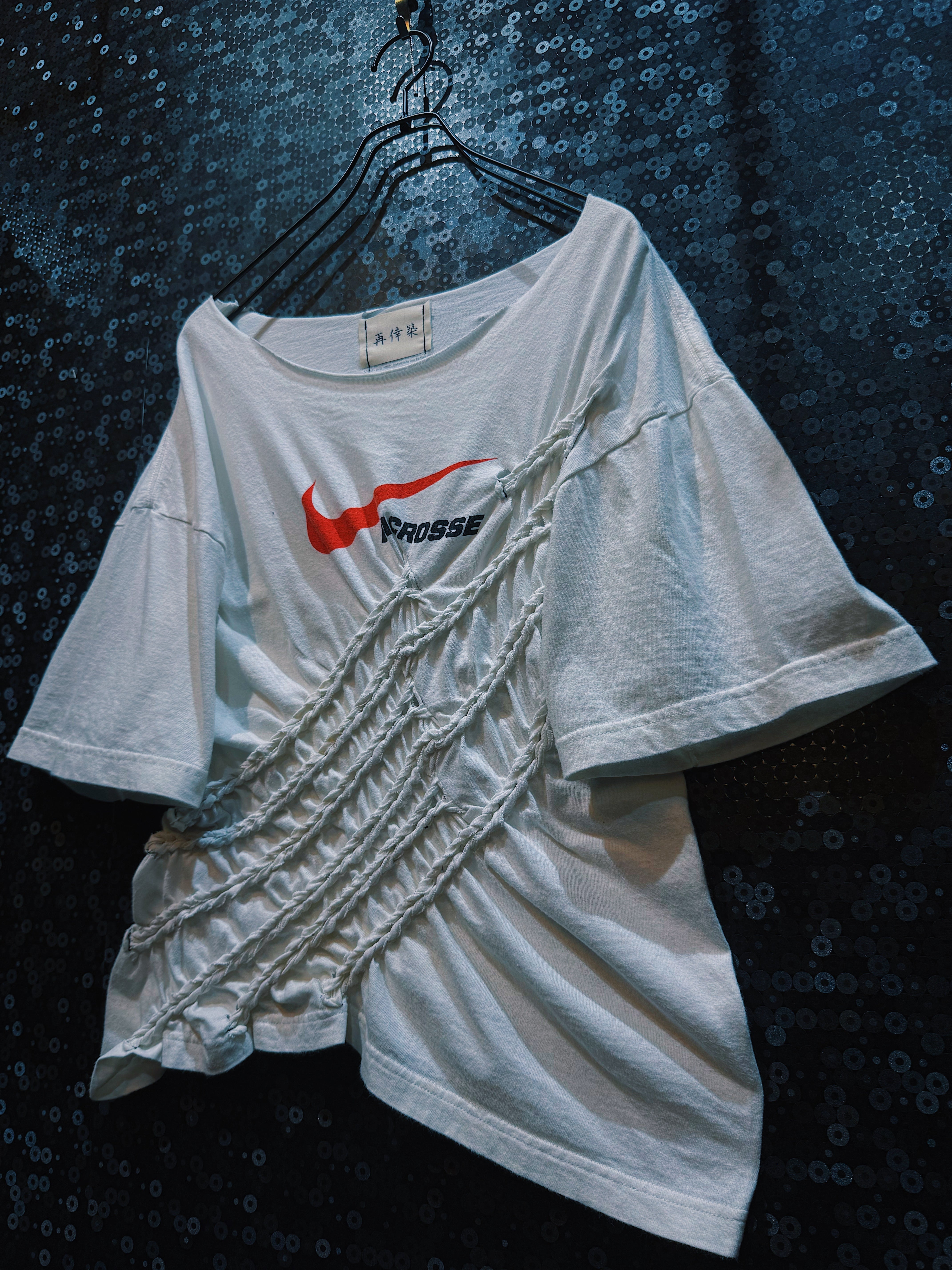 ベースにはNIKEのレッドスウッシュが印象的なヴィンテージTシャツを採用し、そのフロントを斜めに横断するようにハンドメイドで編み込み加工を施している。