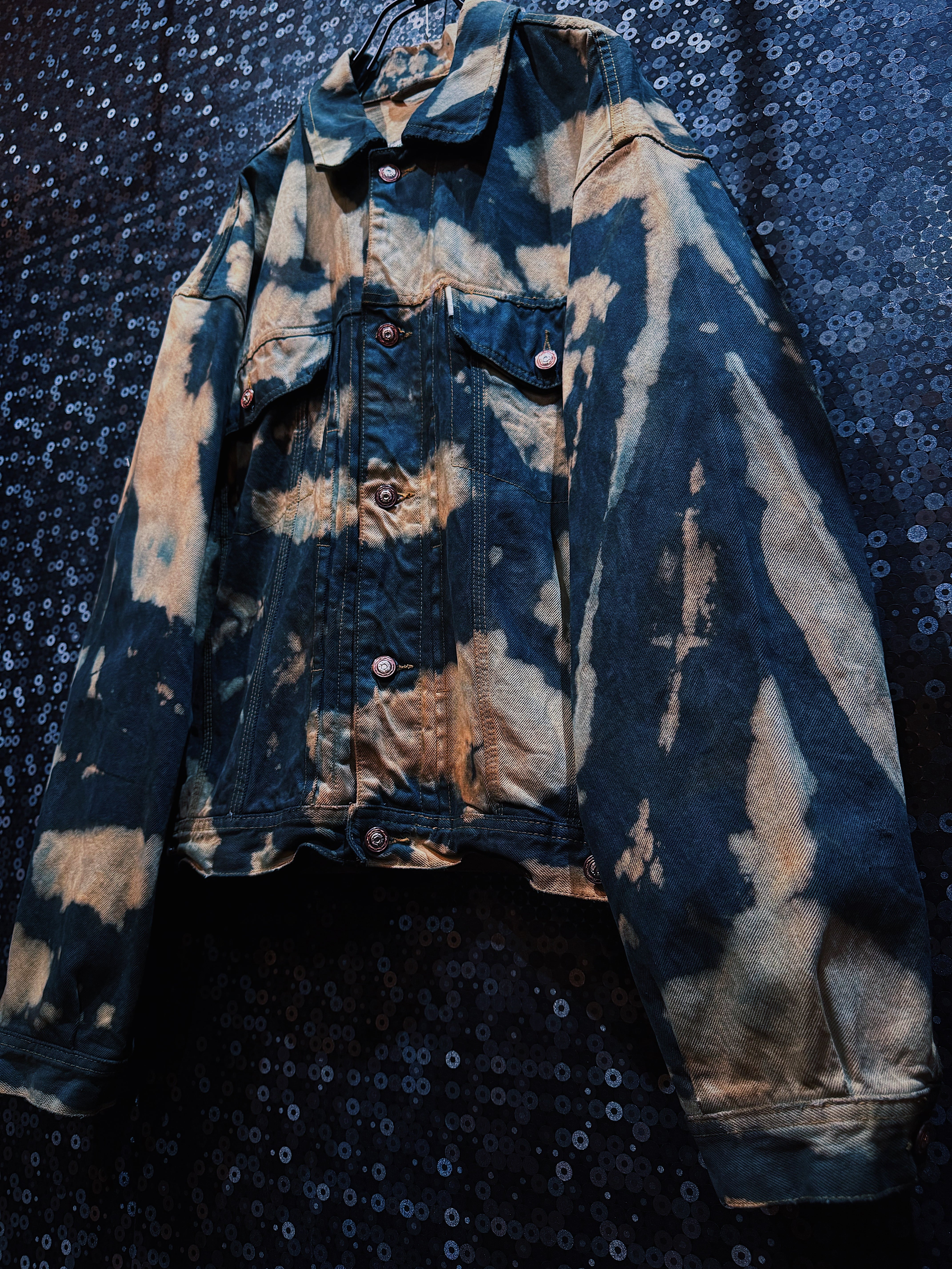 独特な表情を持つ「FASHION AFFAIRS」のヴィンテージブラックデニムジャケット。全体に広がる模様はブリーチ加工ではなく、まるで夜空に雲が浮かんだような空模様が表現されており、通常のデニムジャケットにはない幻想的な存在感を放つ逸品。