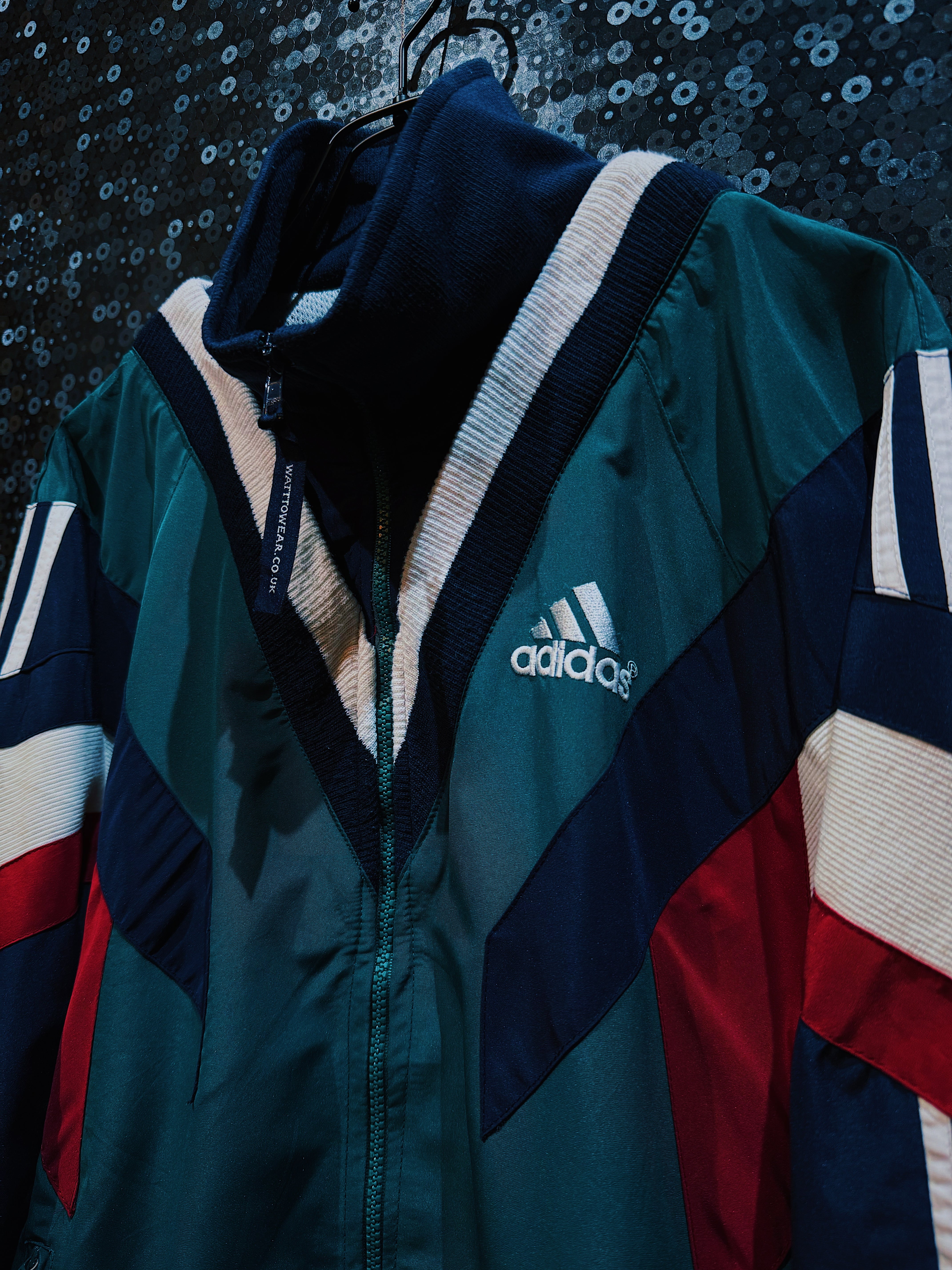 90's特有の雰囲気を醸し出すadidasのヴィンテージナイロンジャケット。グリーン、ネイビー、ホワイト、レッドを巧みに組み合わせた切替デザインは、トラックジャケットの枠を超えてファッションアイテムとして強い印象を残す仕上がりの逸品。