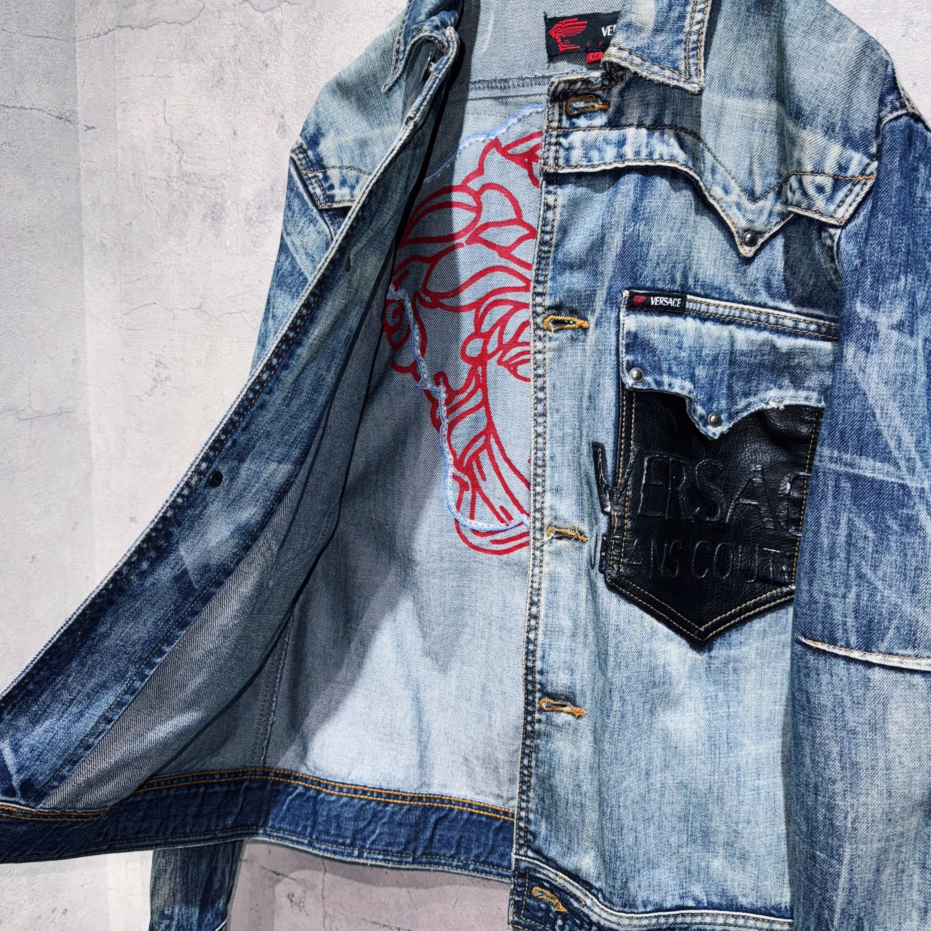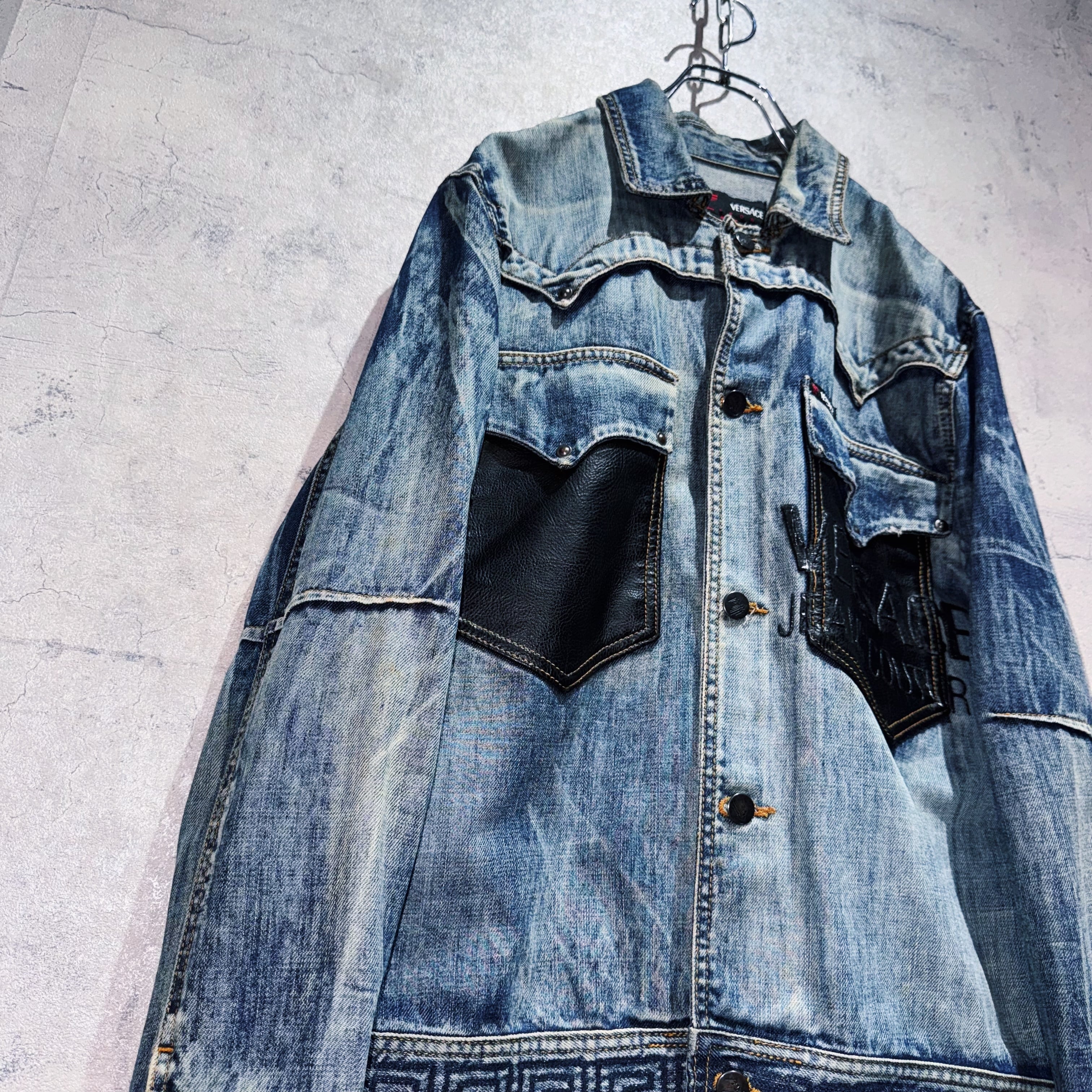 "ヴェルサーチ"メデューサバックデザインレザースイッチングデニムジャケット