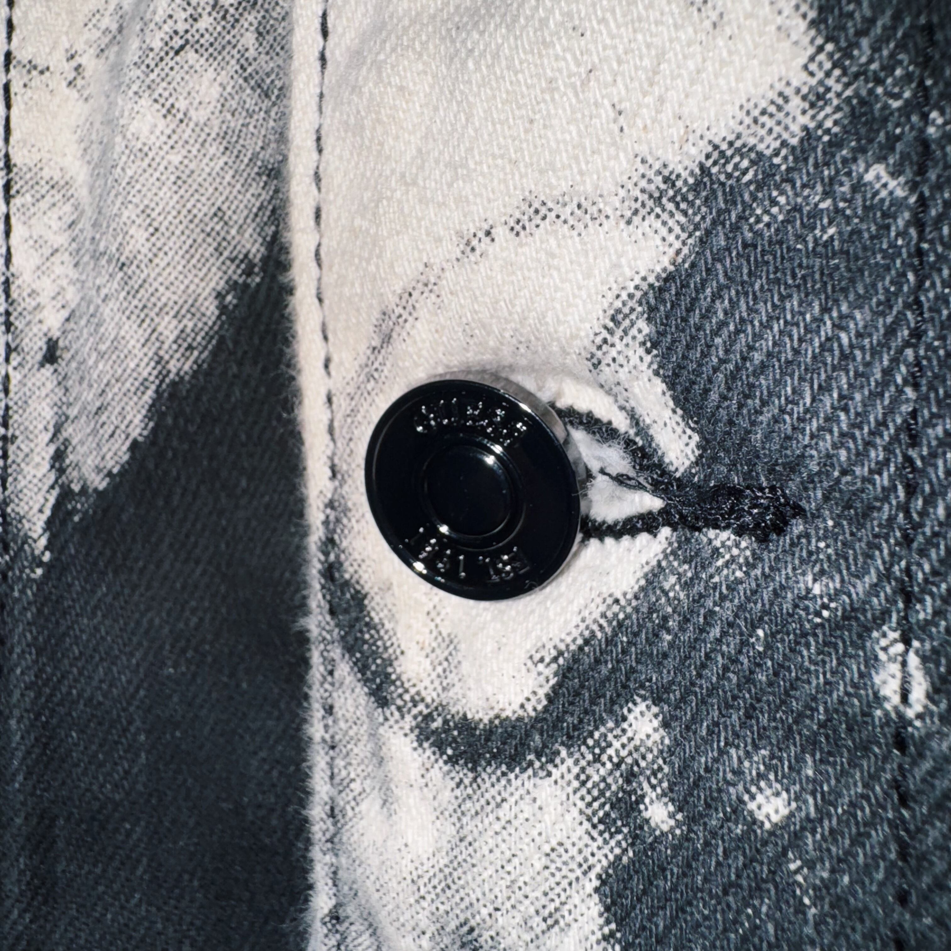 ブラックのボディをブリーチしたようにアートグラフィックを描いたアバンギャルドなデニムジャケット。よく見ると人の手が写っており、どこか奇妙さもあります。