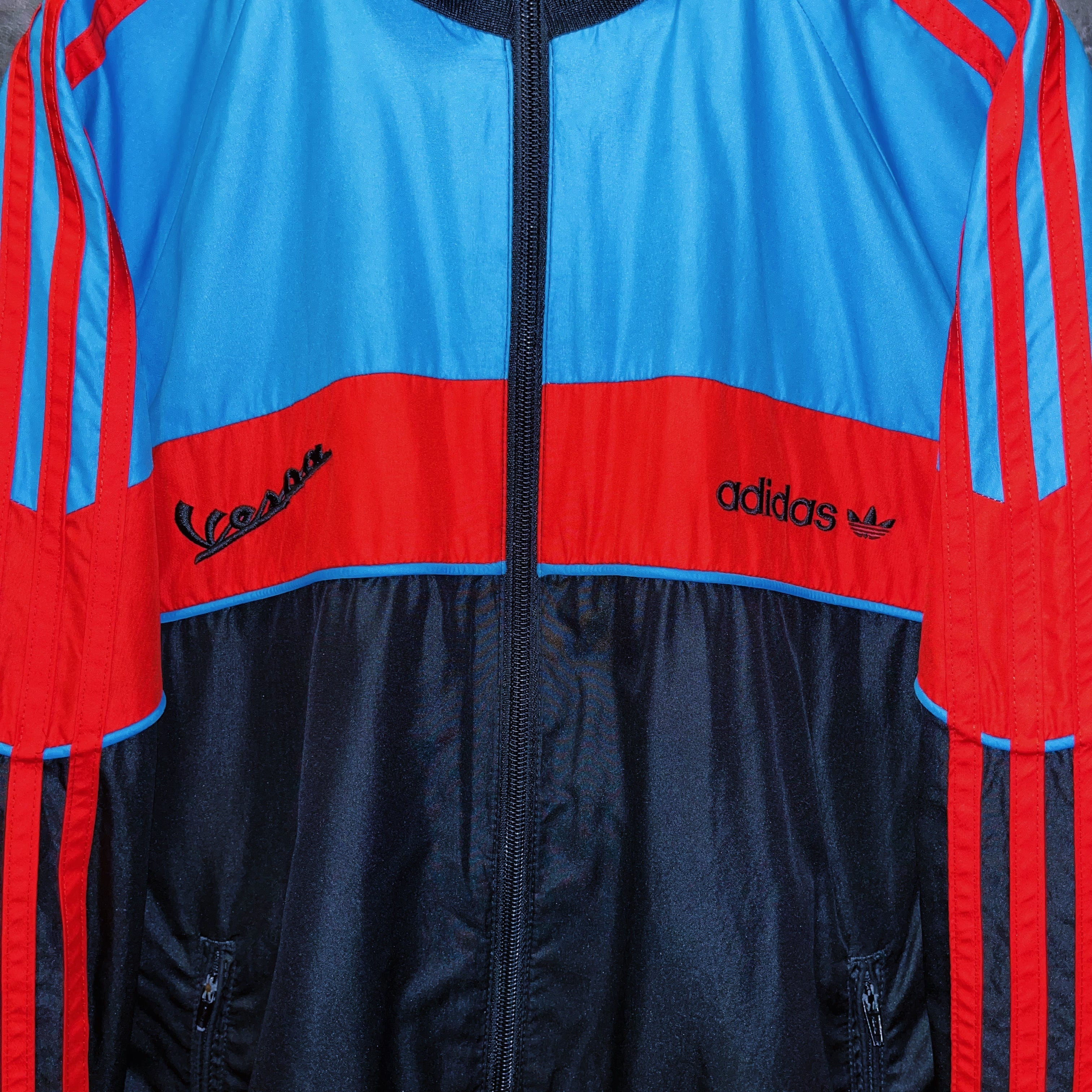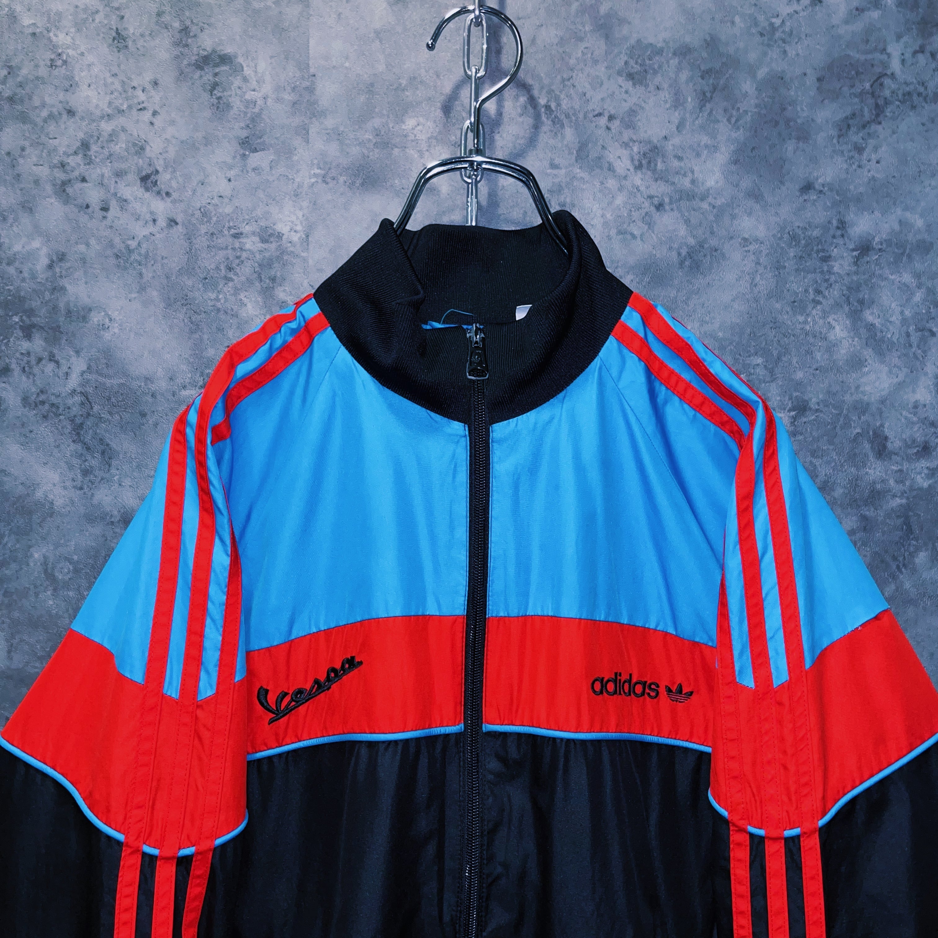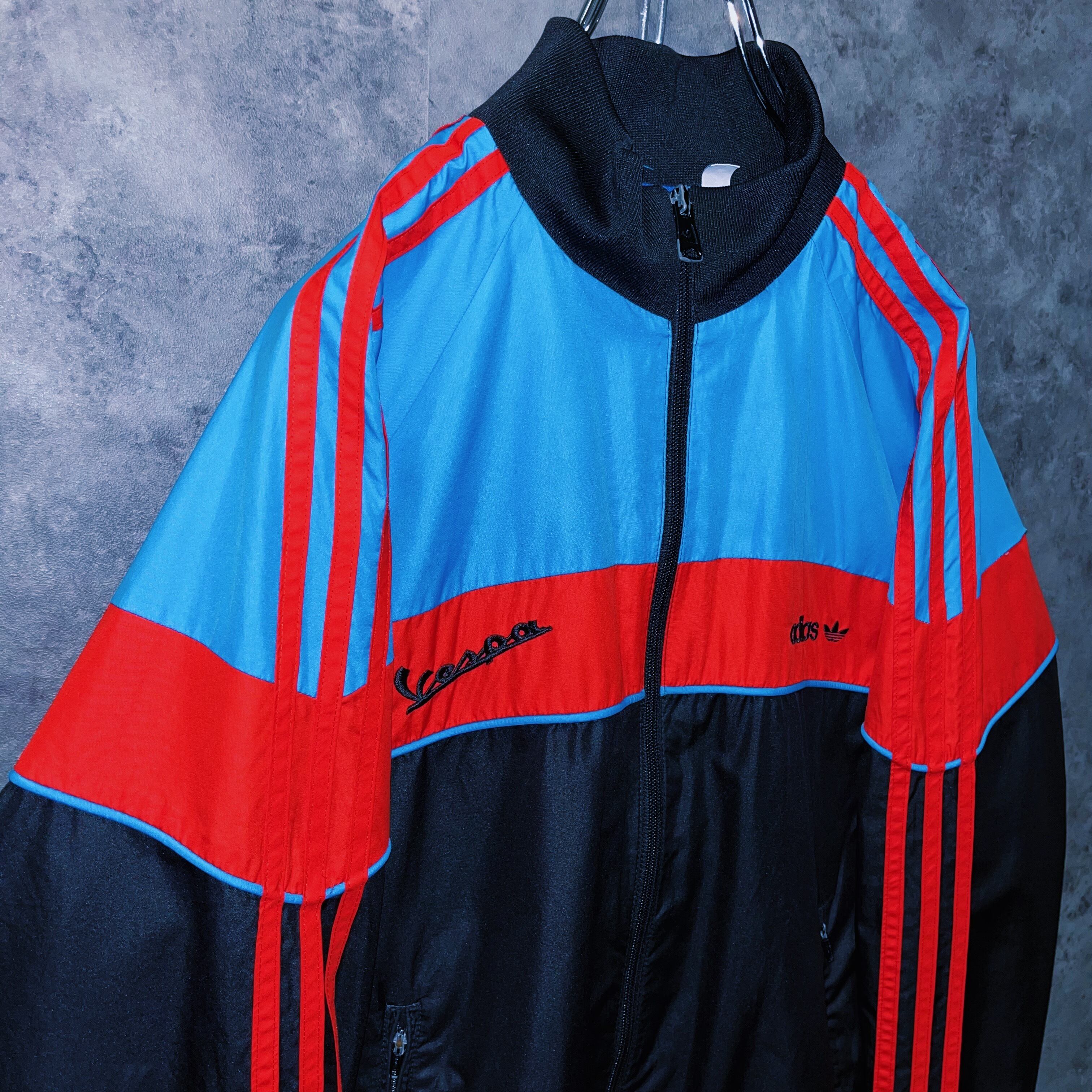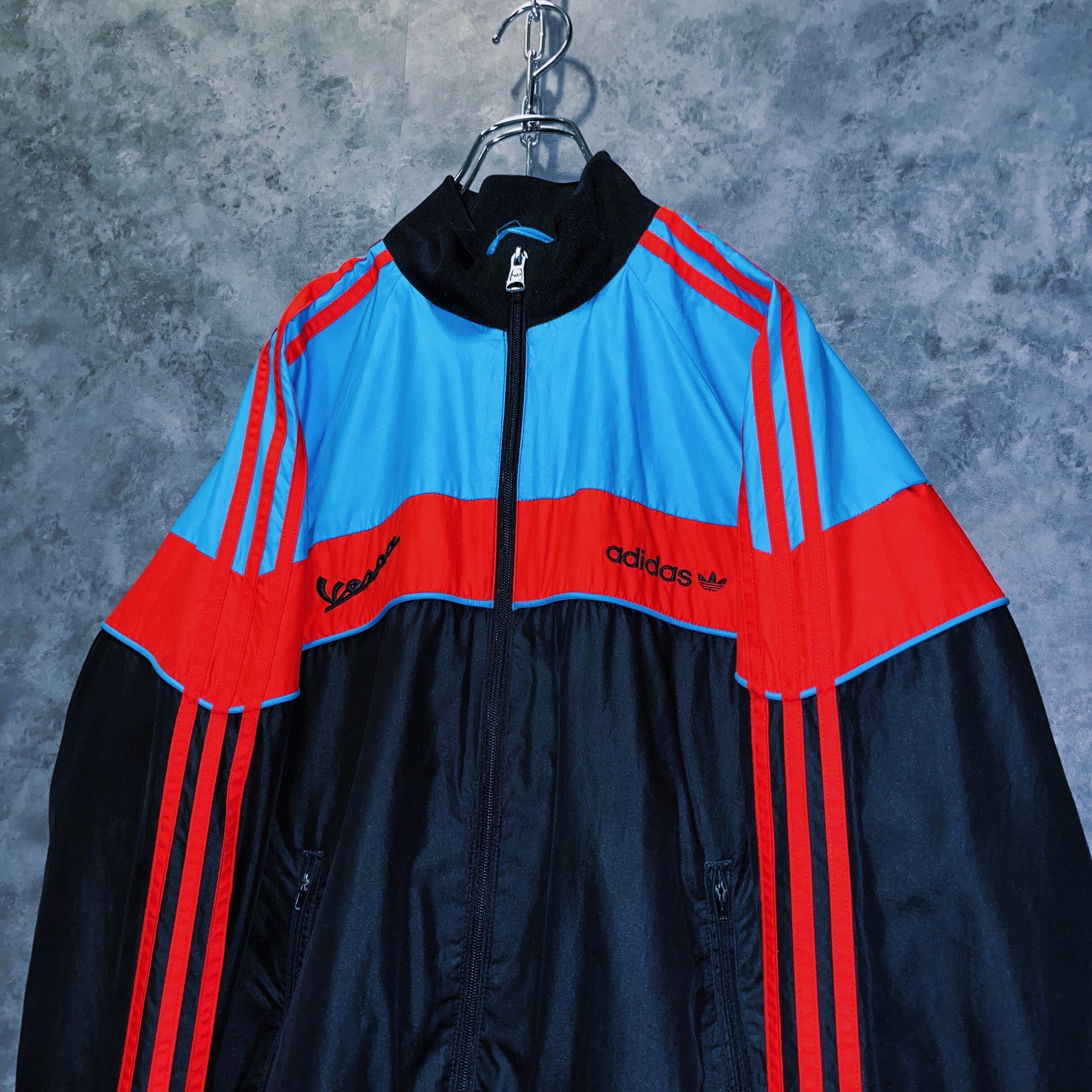 adidasのスリーストライプをメインデザインに、赤、黒、ターコイズブルーのシチリア島を彷彿とさせるカラーリングを落とし込んだトラックジャケット。
