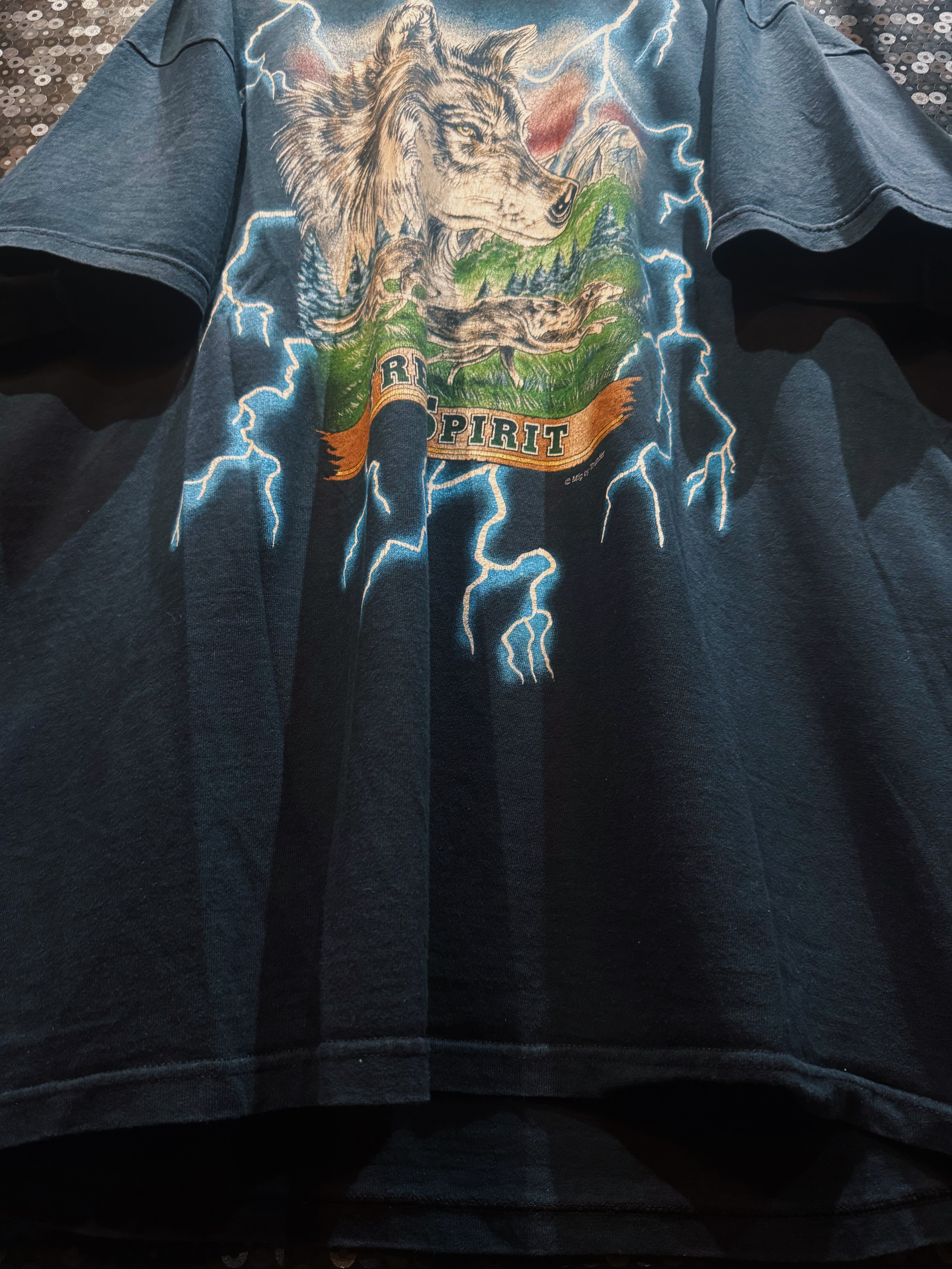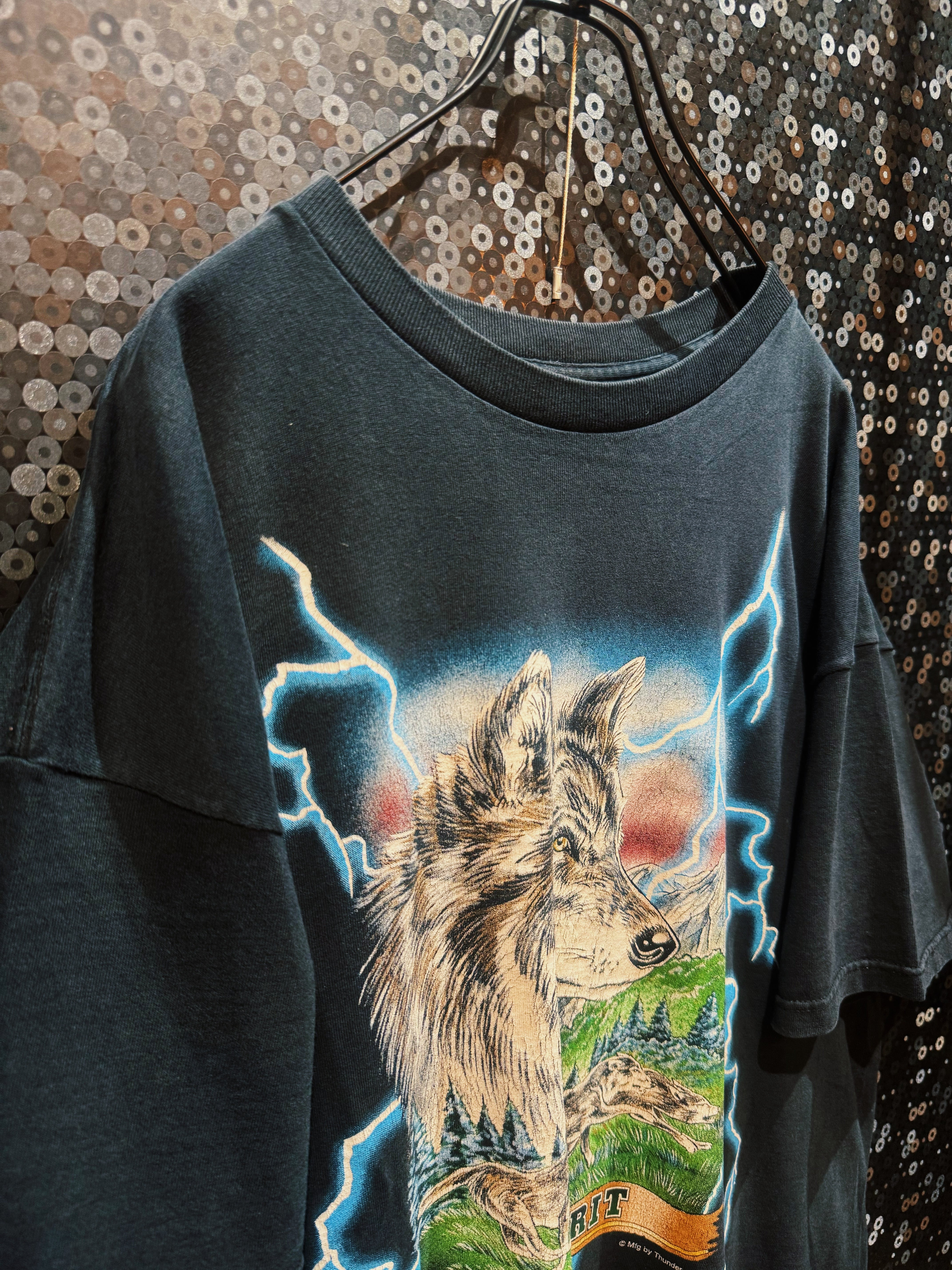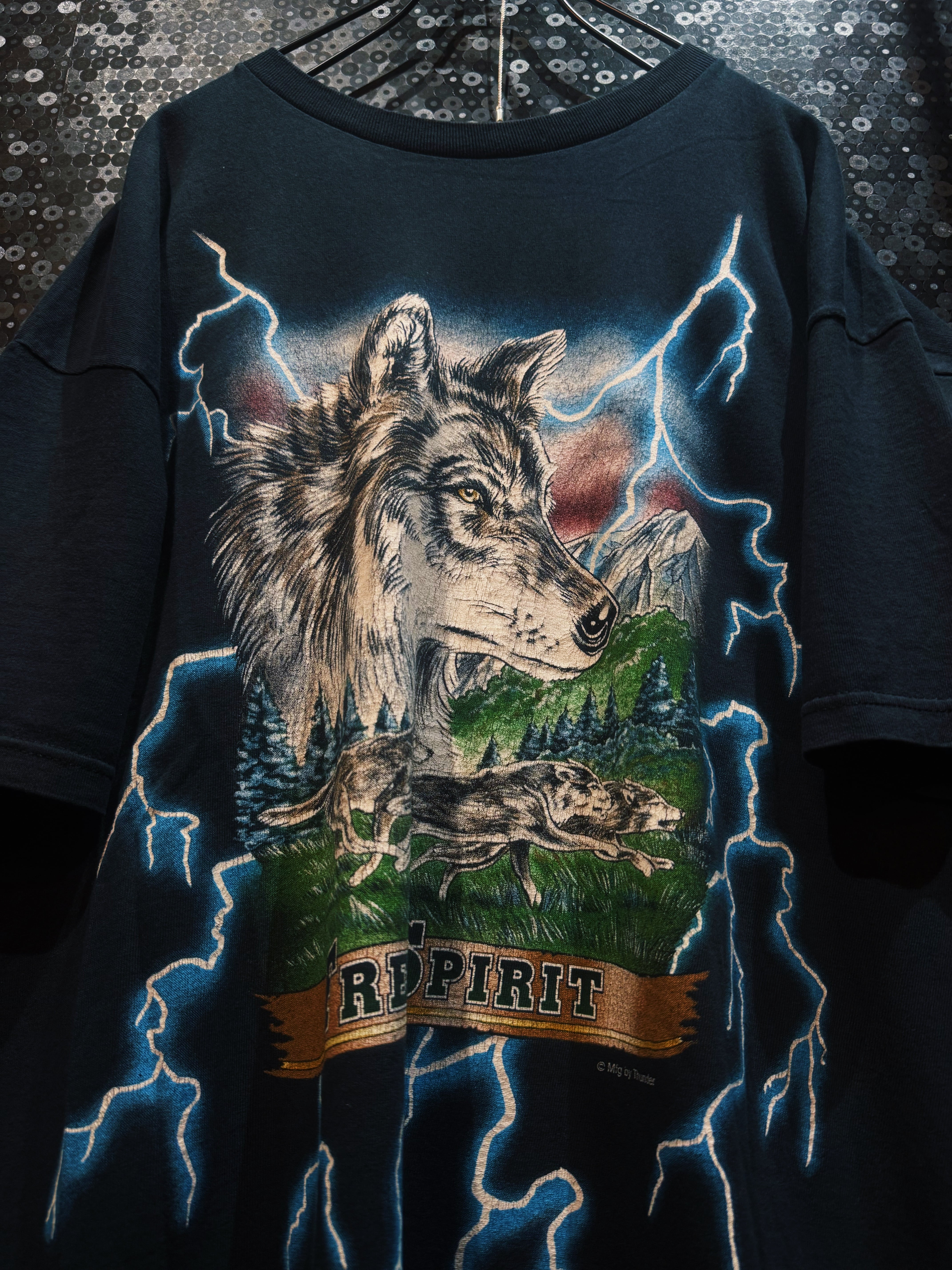 フロントには狼の大きなフェイスと走る群れが描かれ、背景には稲妻が全体を覆う迫力あるデザインのヴィンテージTシャツ。