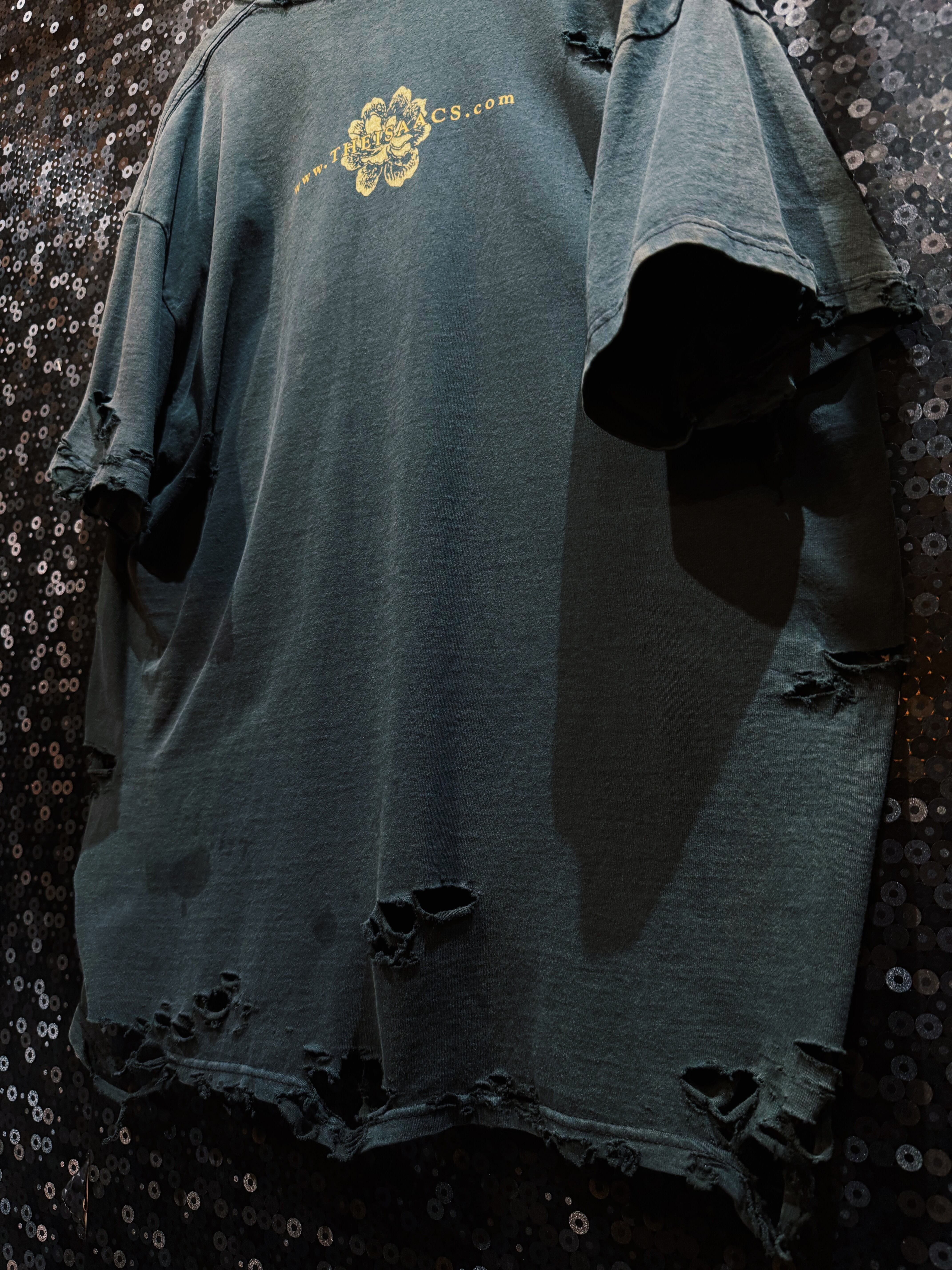 ボディ全体には激しいダメージ加工が施され、首元・袖口・裾に至るまでほつれや穴が広がり、強烈なボロ感を放つ。単なる古着の経年劣化を超え、アート的に再構築された雰囲気があり、ストリートでの主役級存在感を誇る一枚。