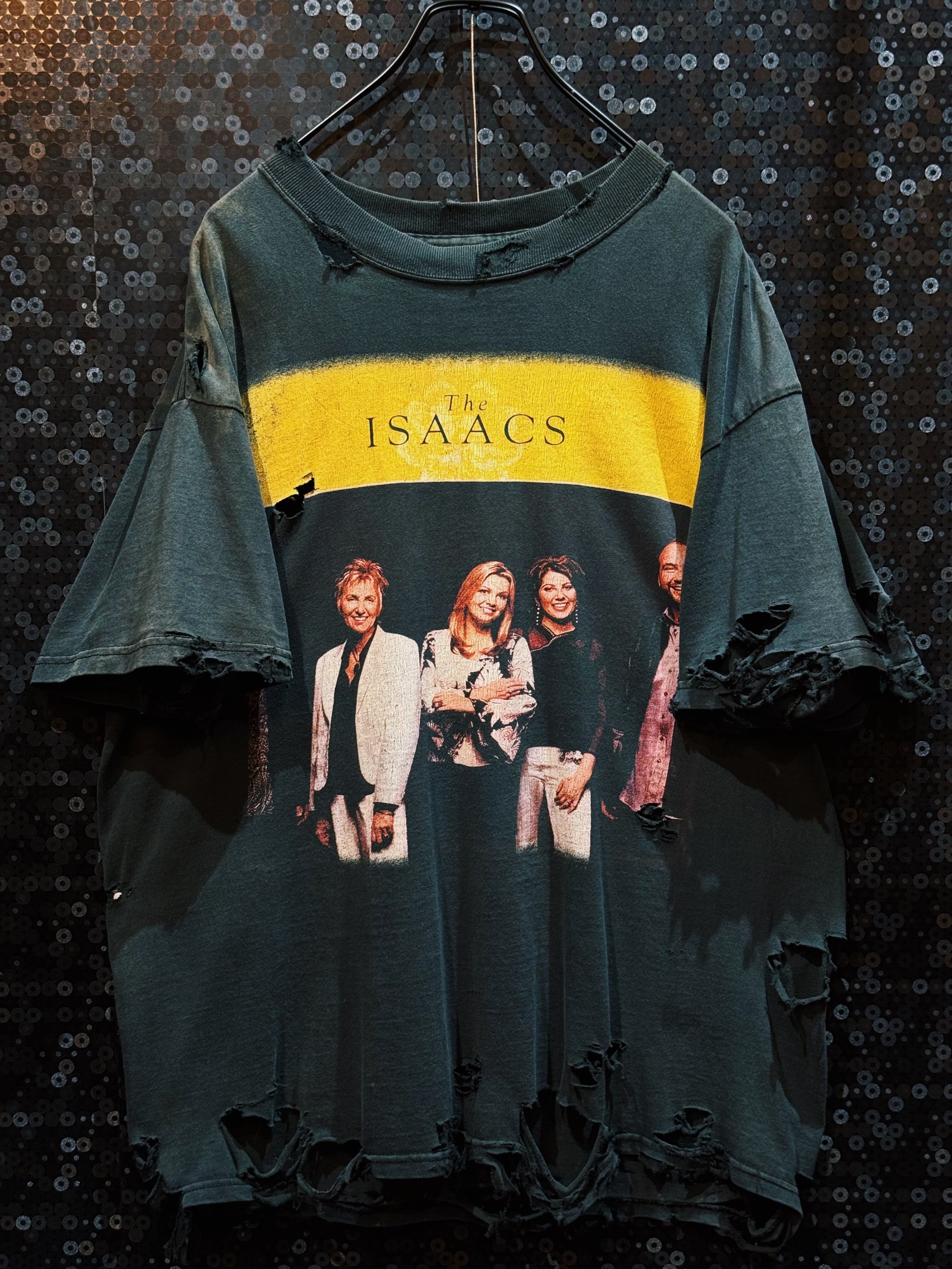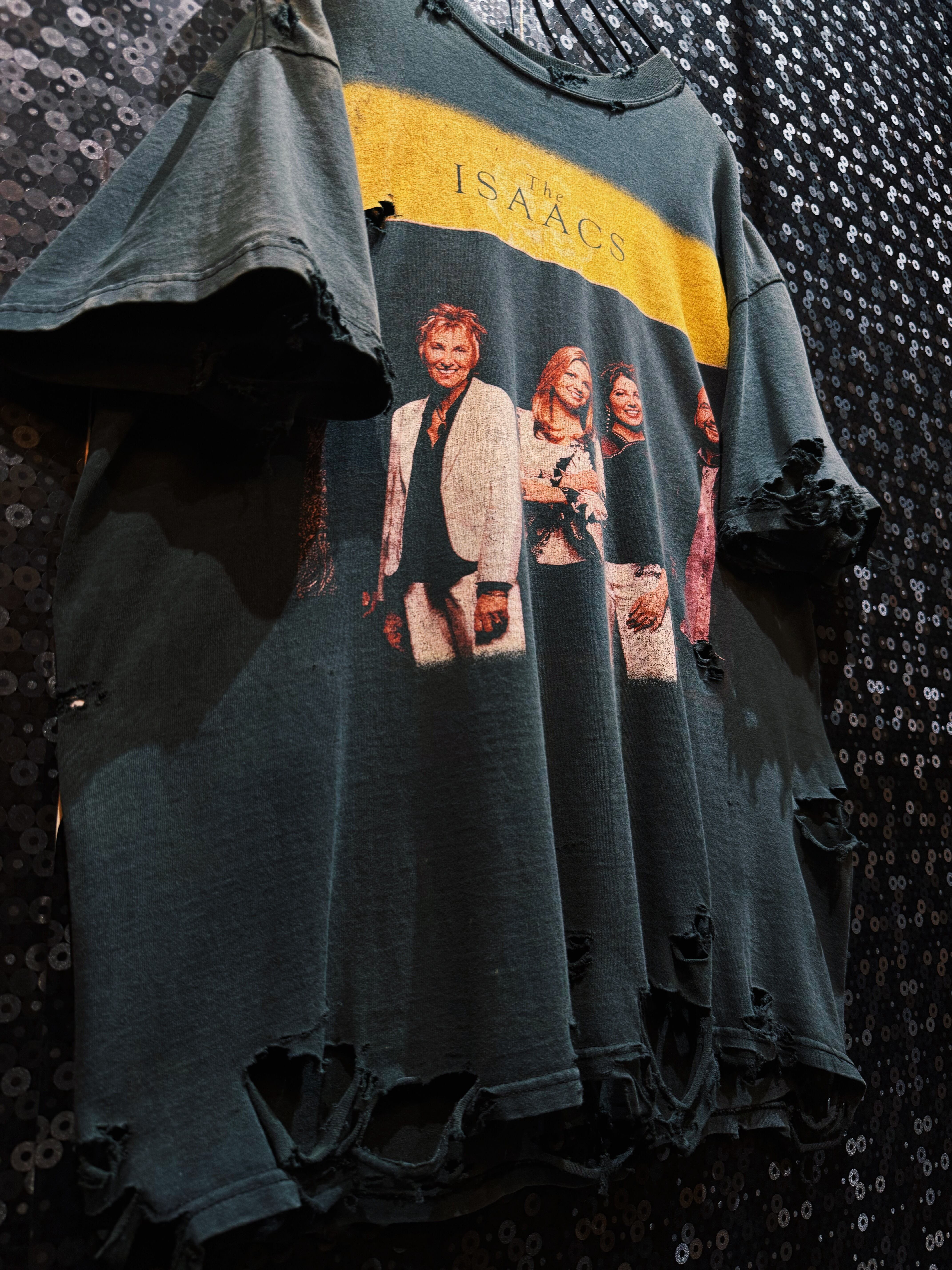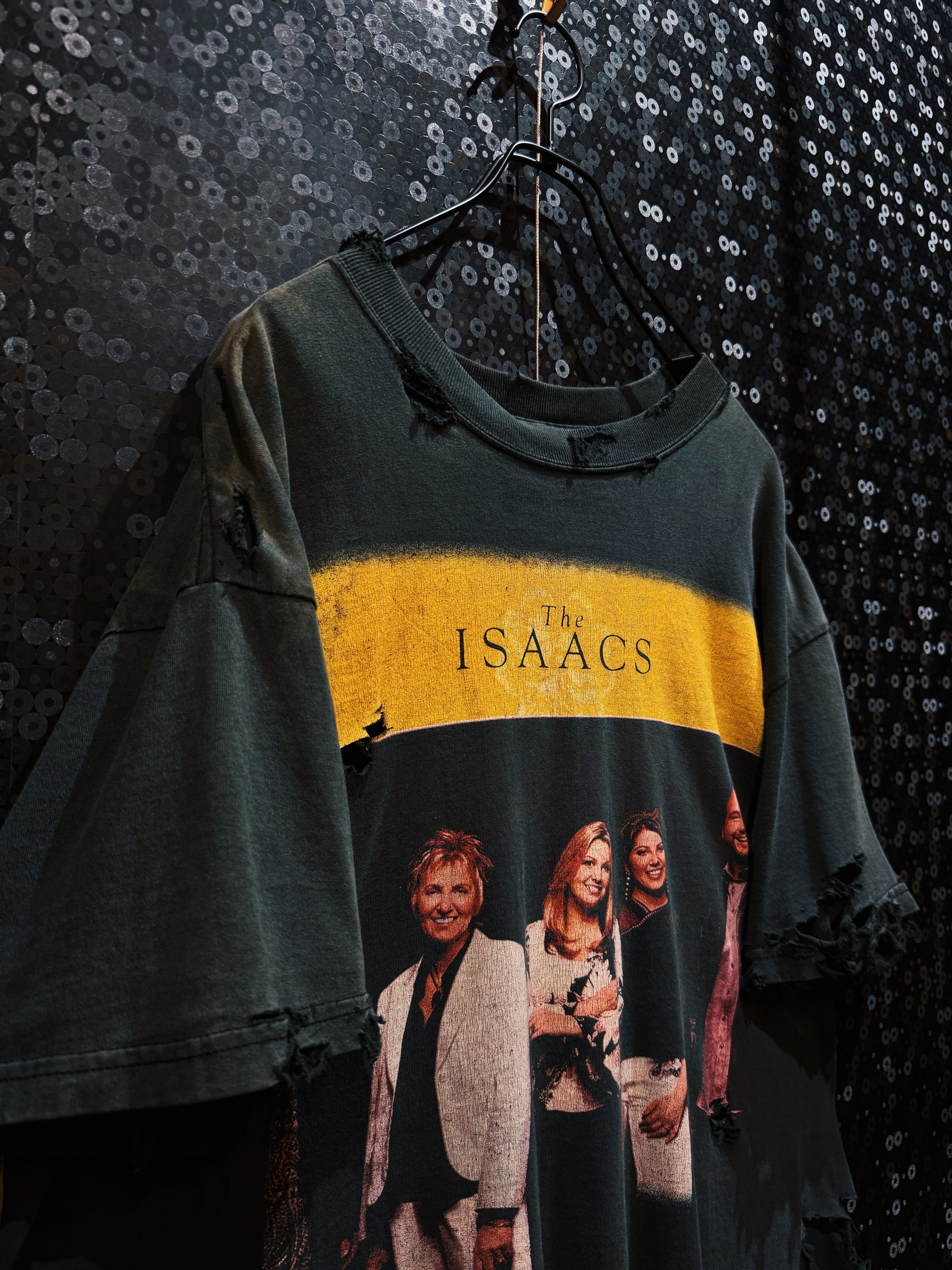 アメリカのゴスペル/ブルーグラス系ファミリーバンド「The Isaacs」のメンバー写真。中央に黄色の帯が入り、その上にバンド名「The ISAACS」がシンプルに配置され、下部にはメンバー4人の立ち姿がプリントされている。