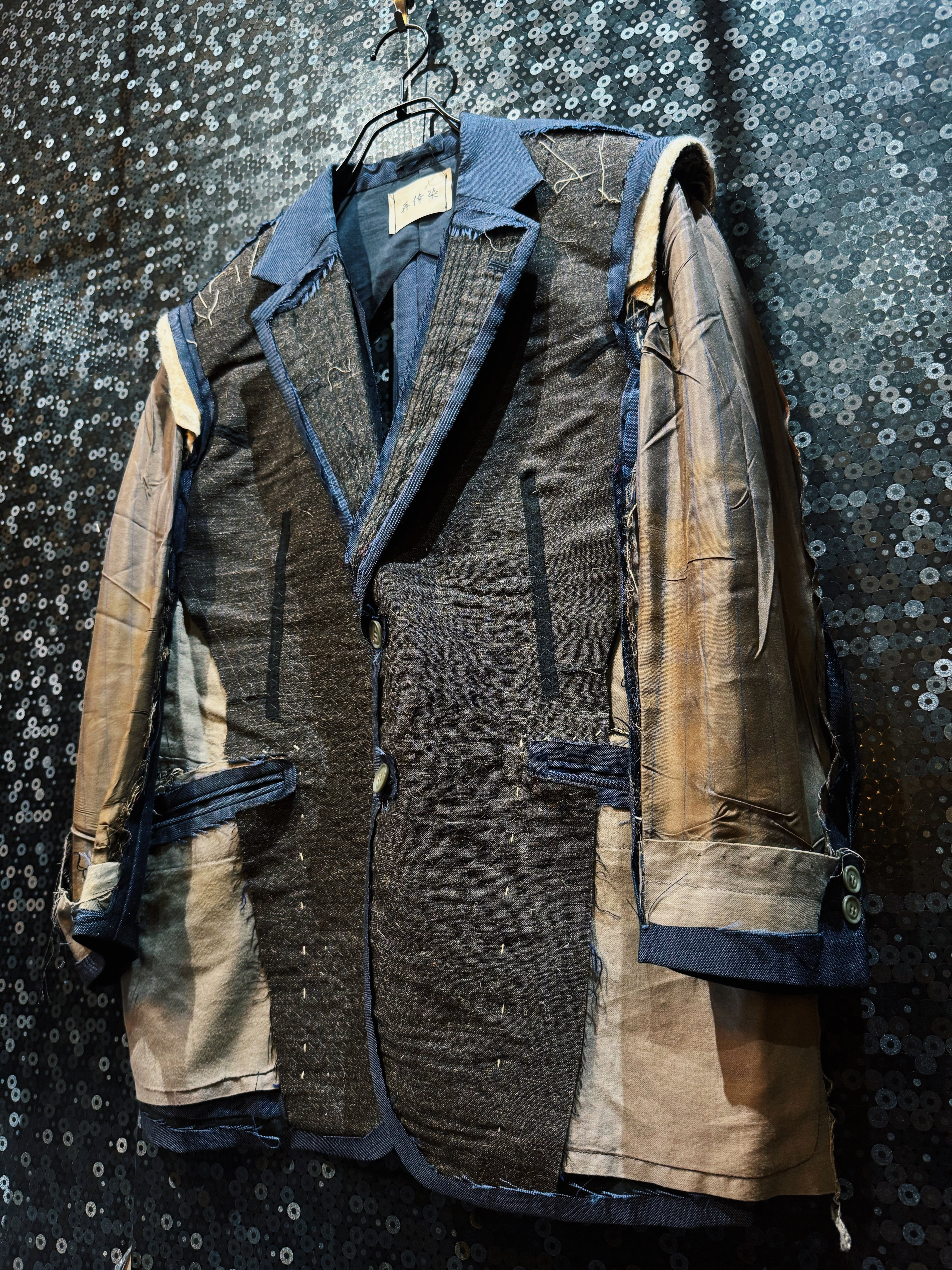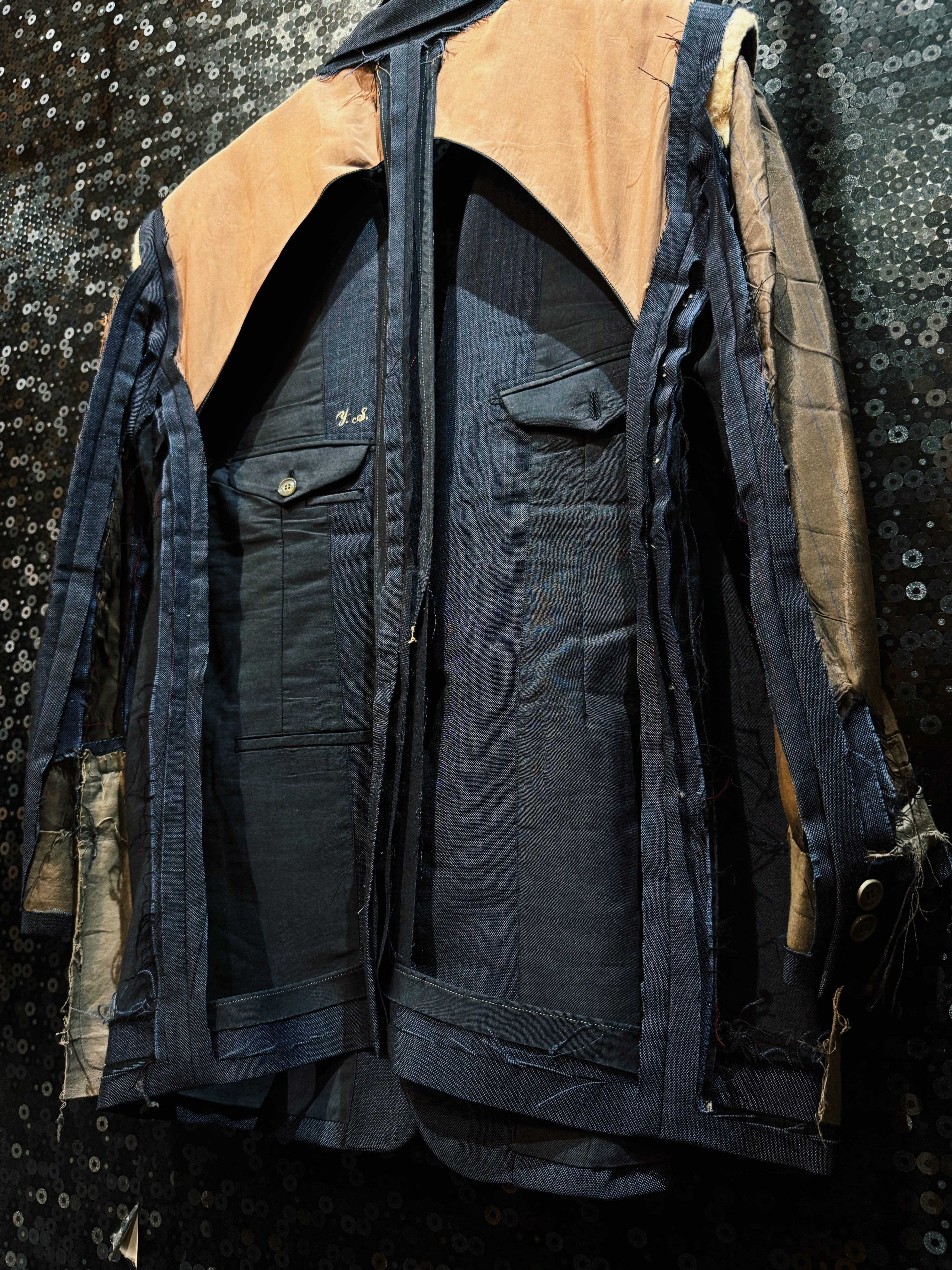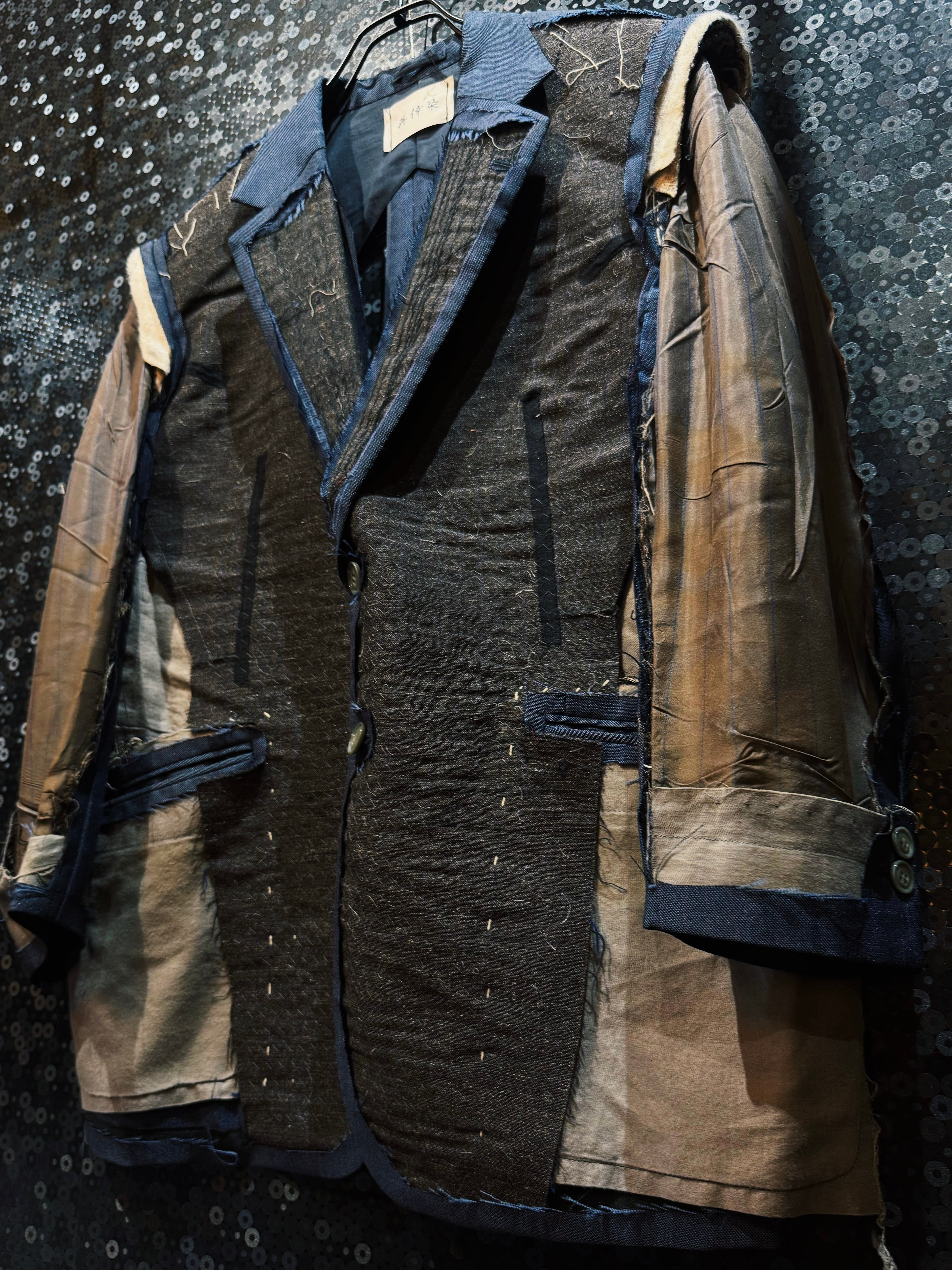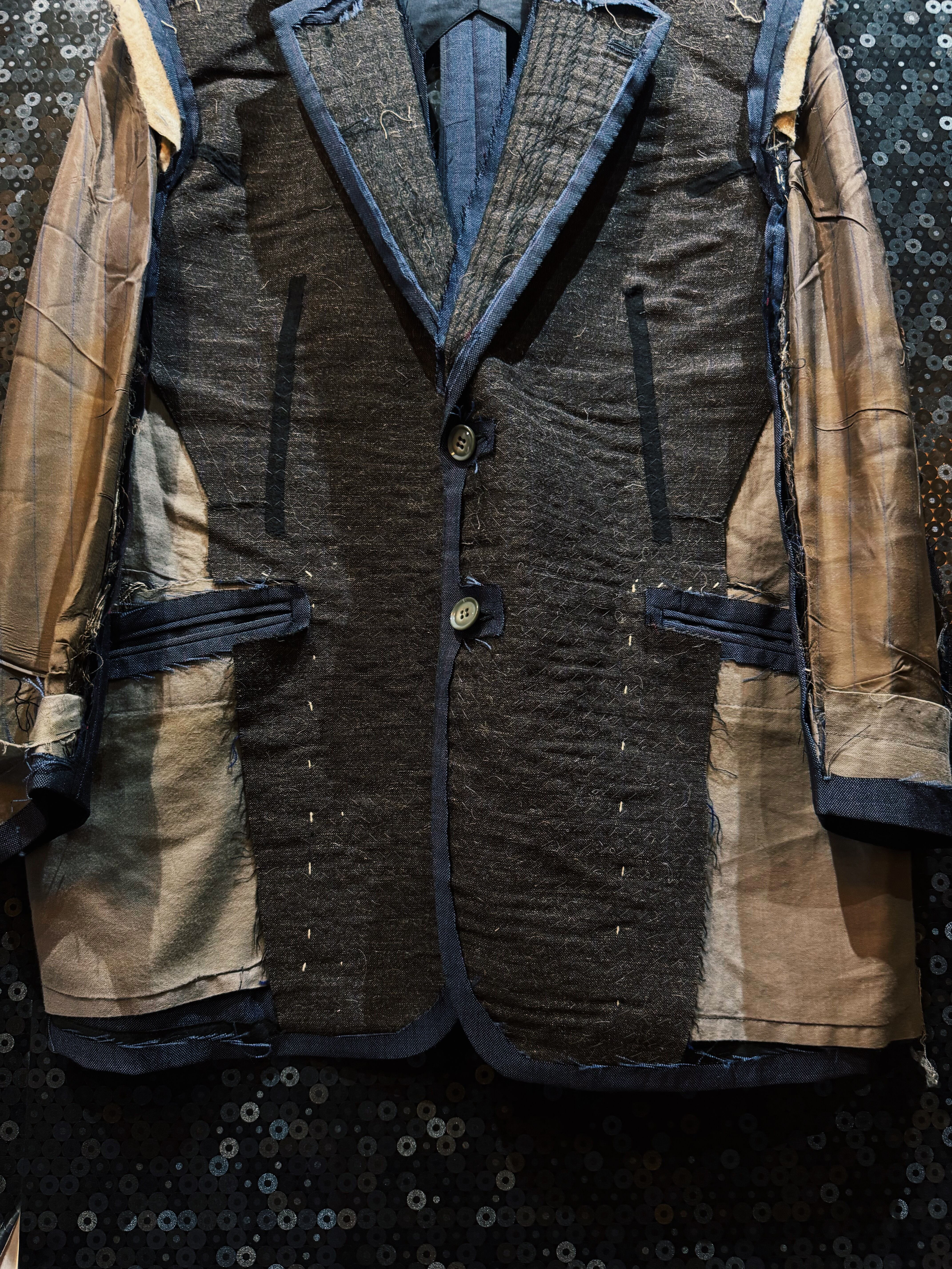 テーラードジャケットを大胆に解体し、裏地・芯地・パーツをむき出しに再構築したアヴァンギャルドな逸品。