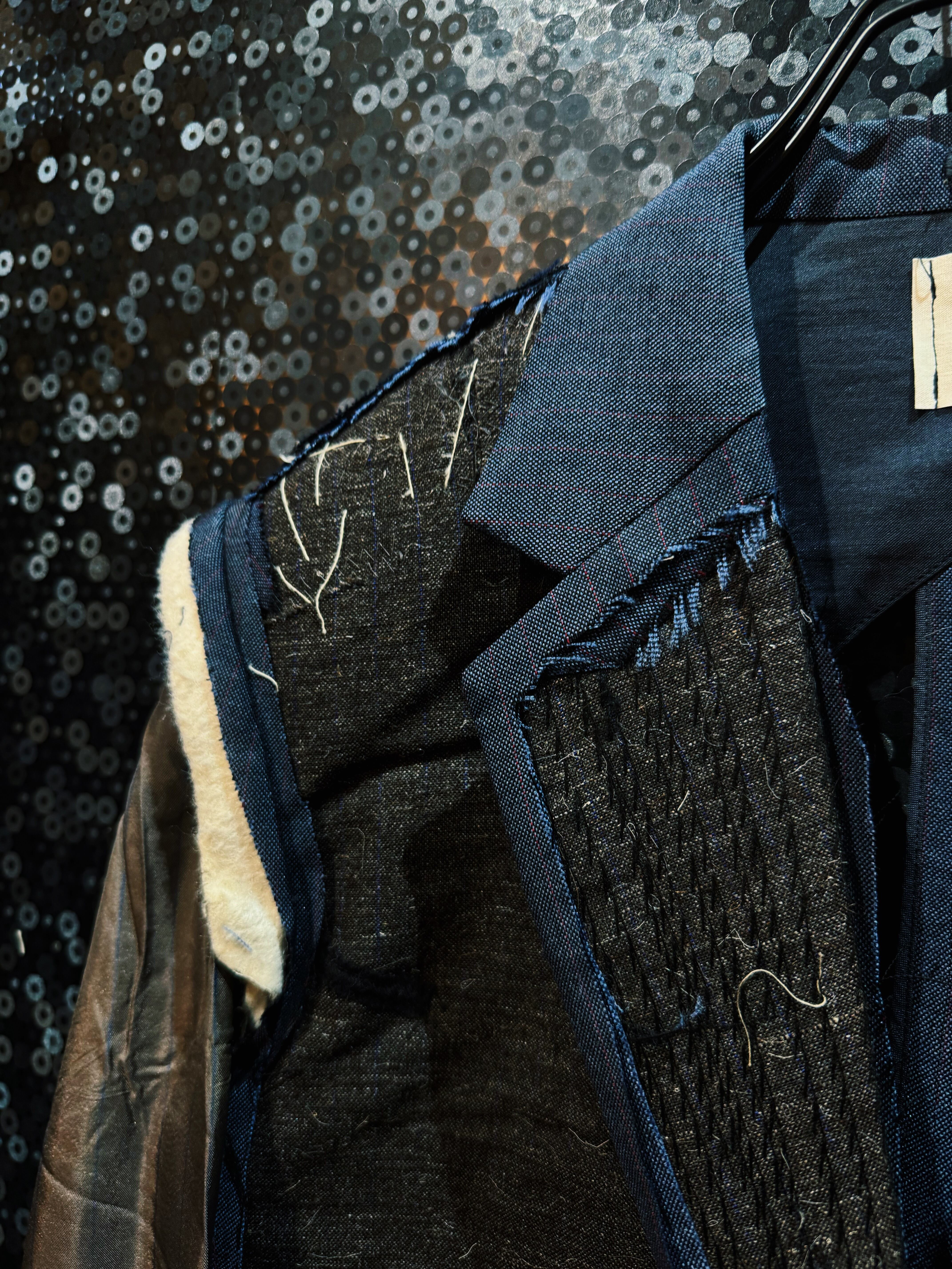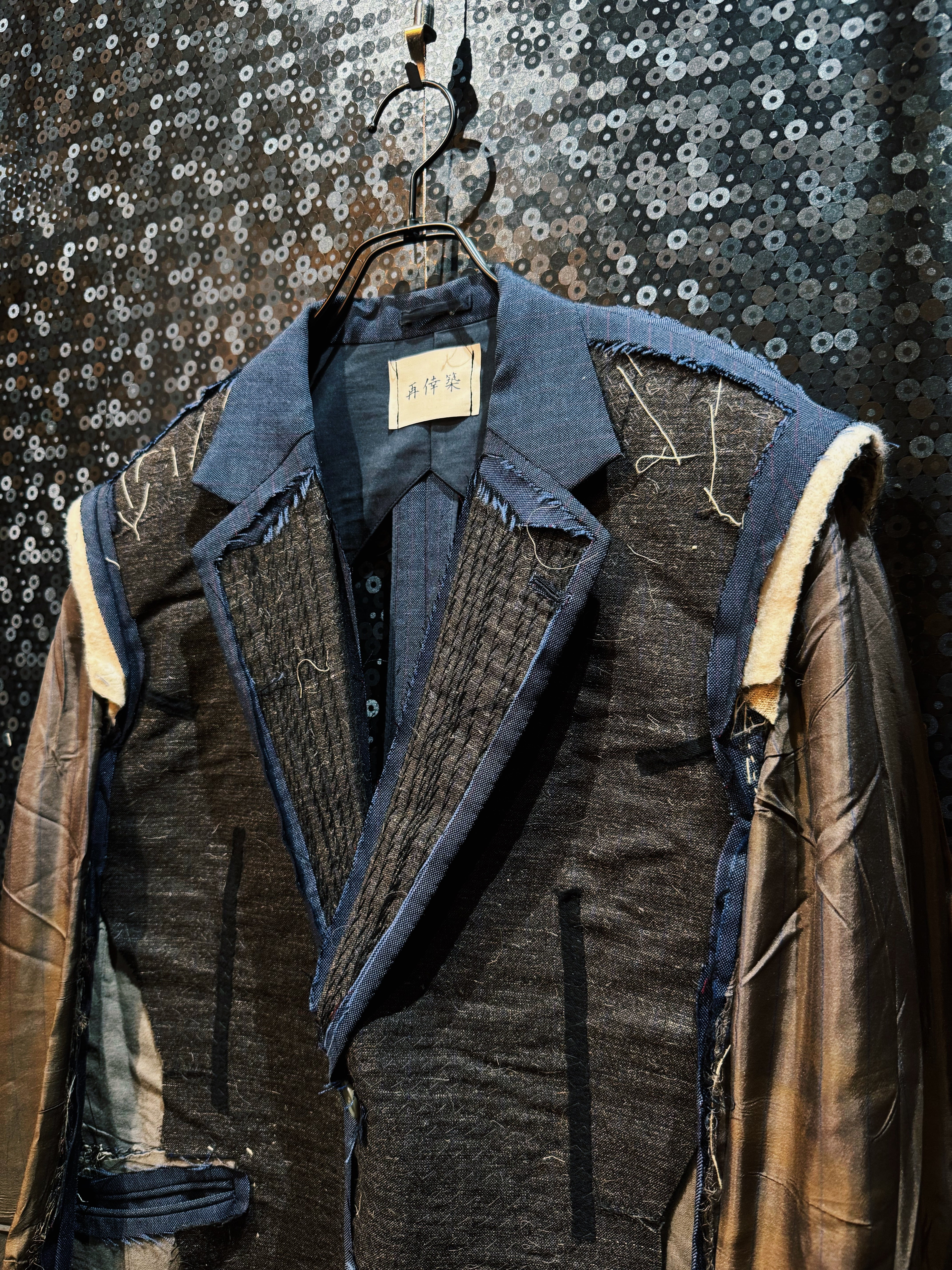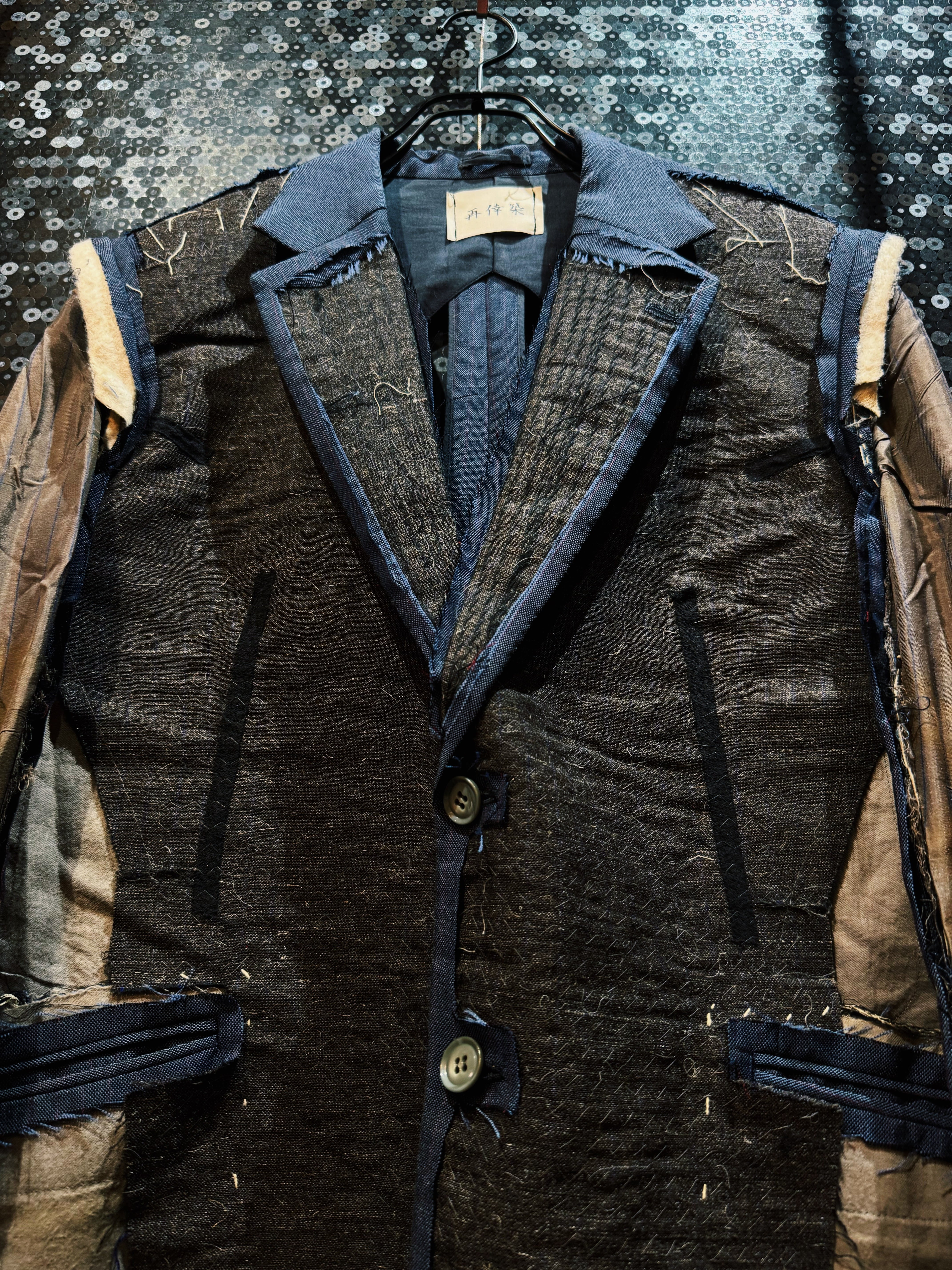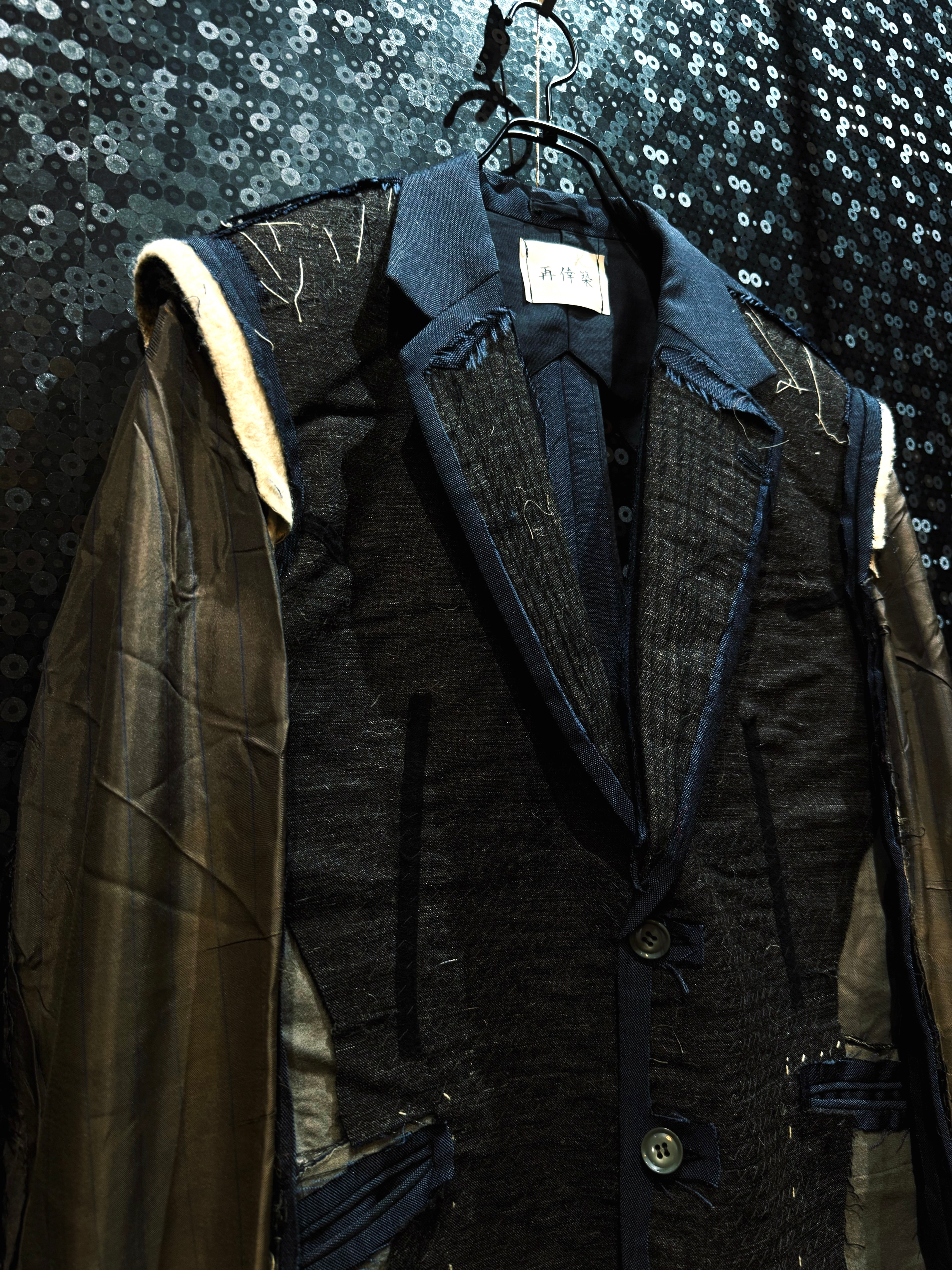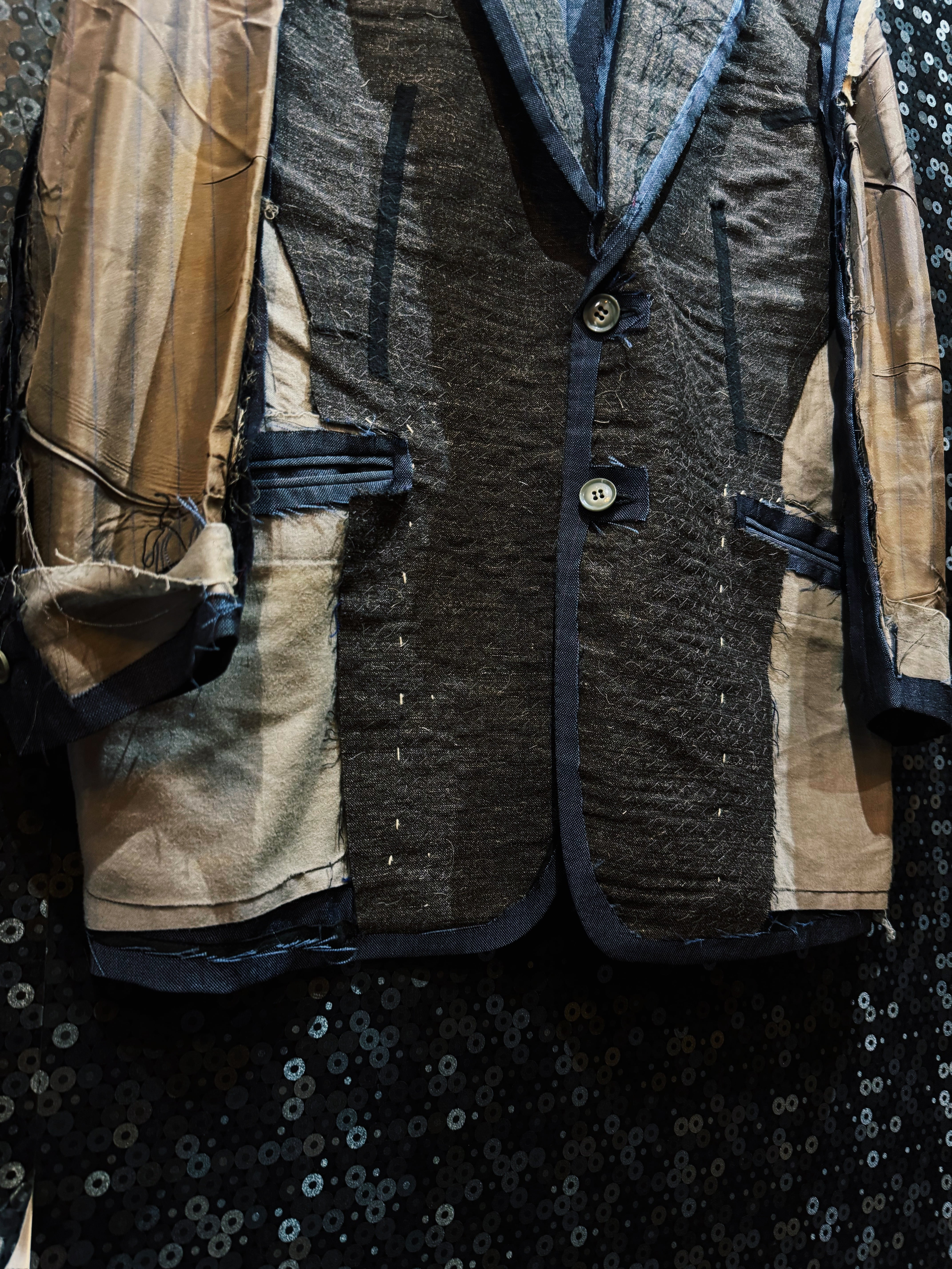 テーラードジャケットを大胆に解体し、裏地・芯地・パーツをむき出しに再構築したアヴァンギャルドな逸品。