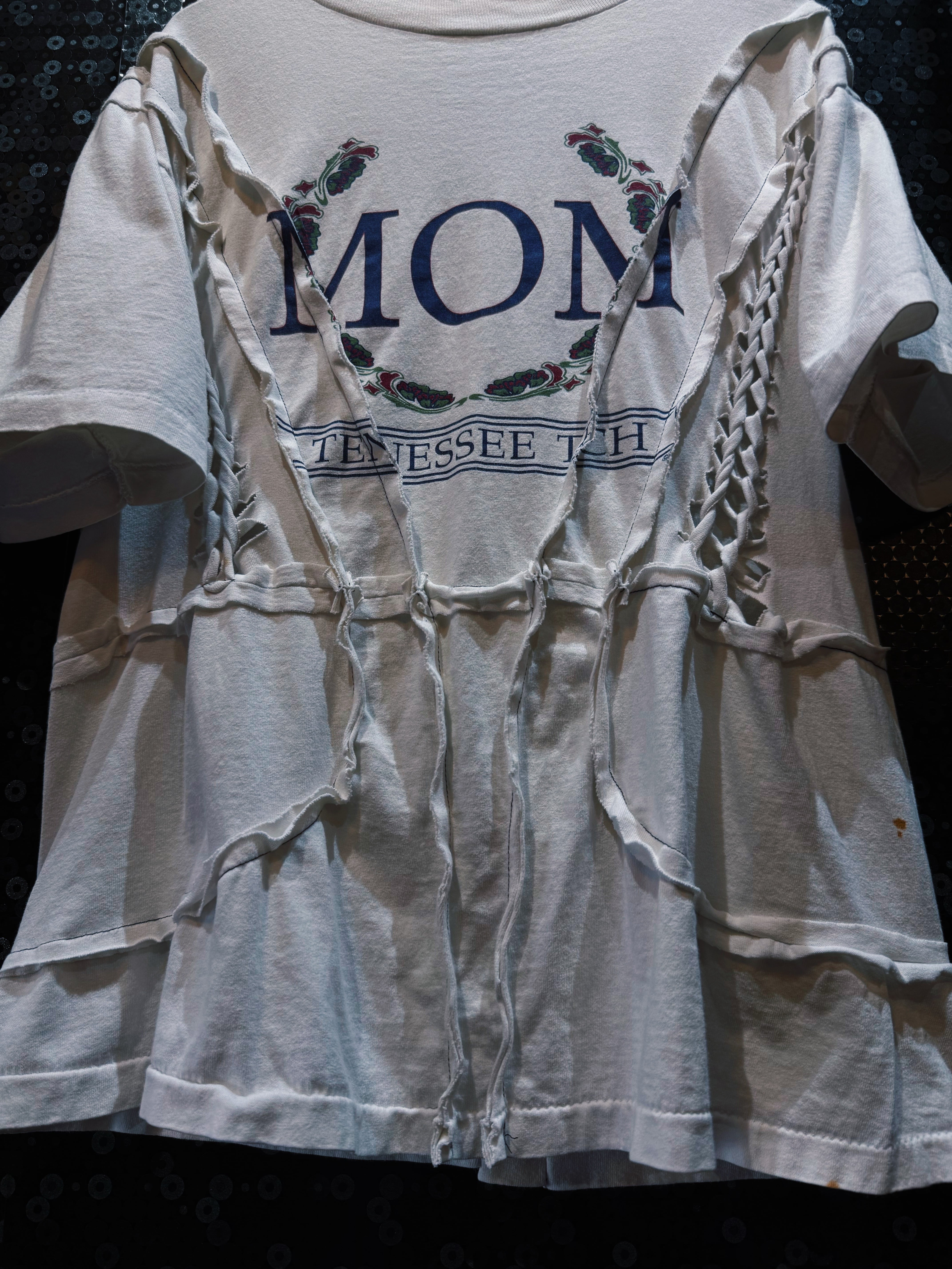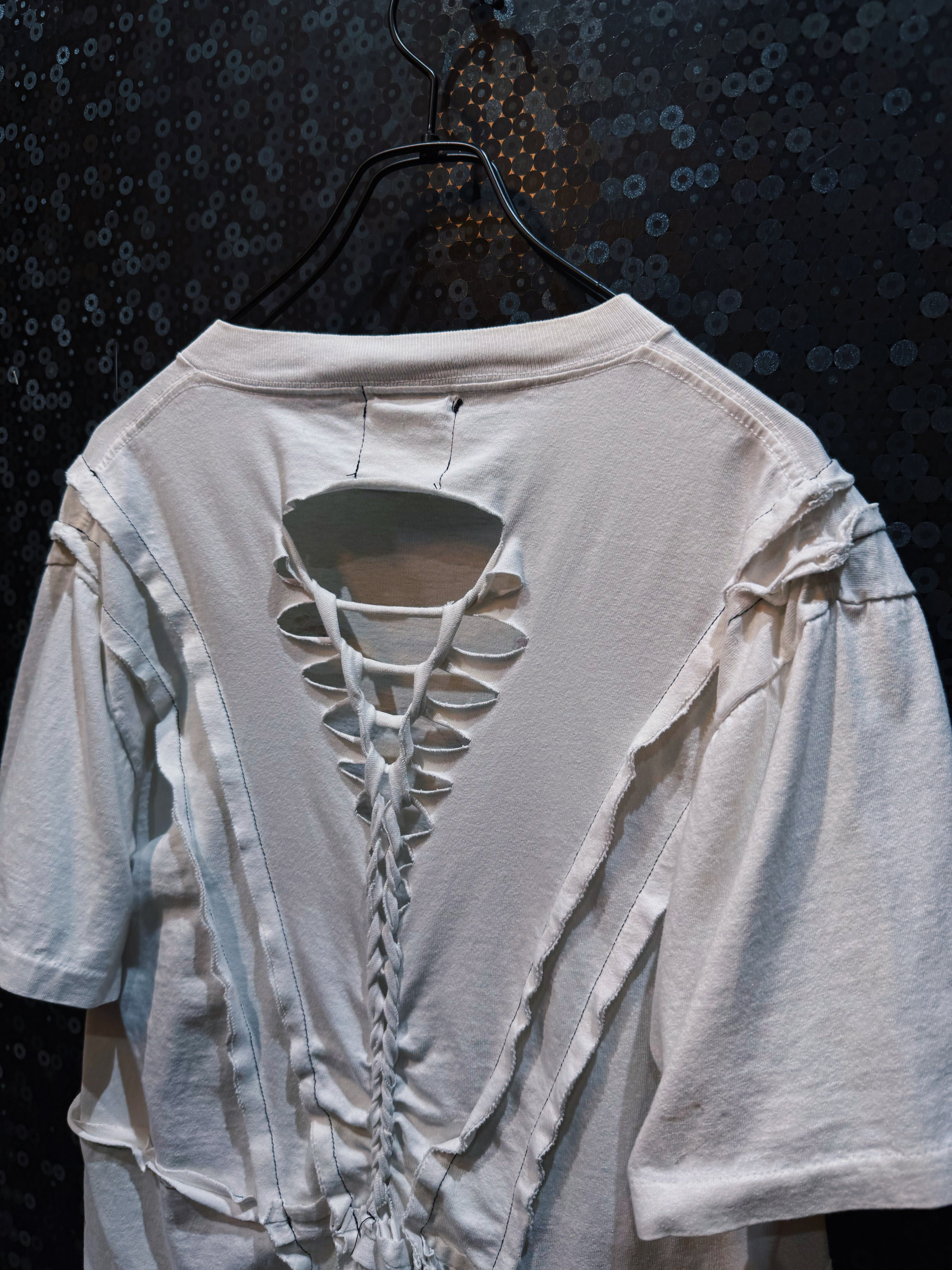 バックスタイルにはスパイン(背骨)のように連なる編み込みが走り、Y2Kカルチャーを彷彿とさせるセクシーかつ攻撃的なデザインに仕上げられている。解体と再構築を繰り返す中で生まれる不規則なカットラインとハンドメイドの編み込みが、唯一無二の存在感を放つ一枚。