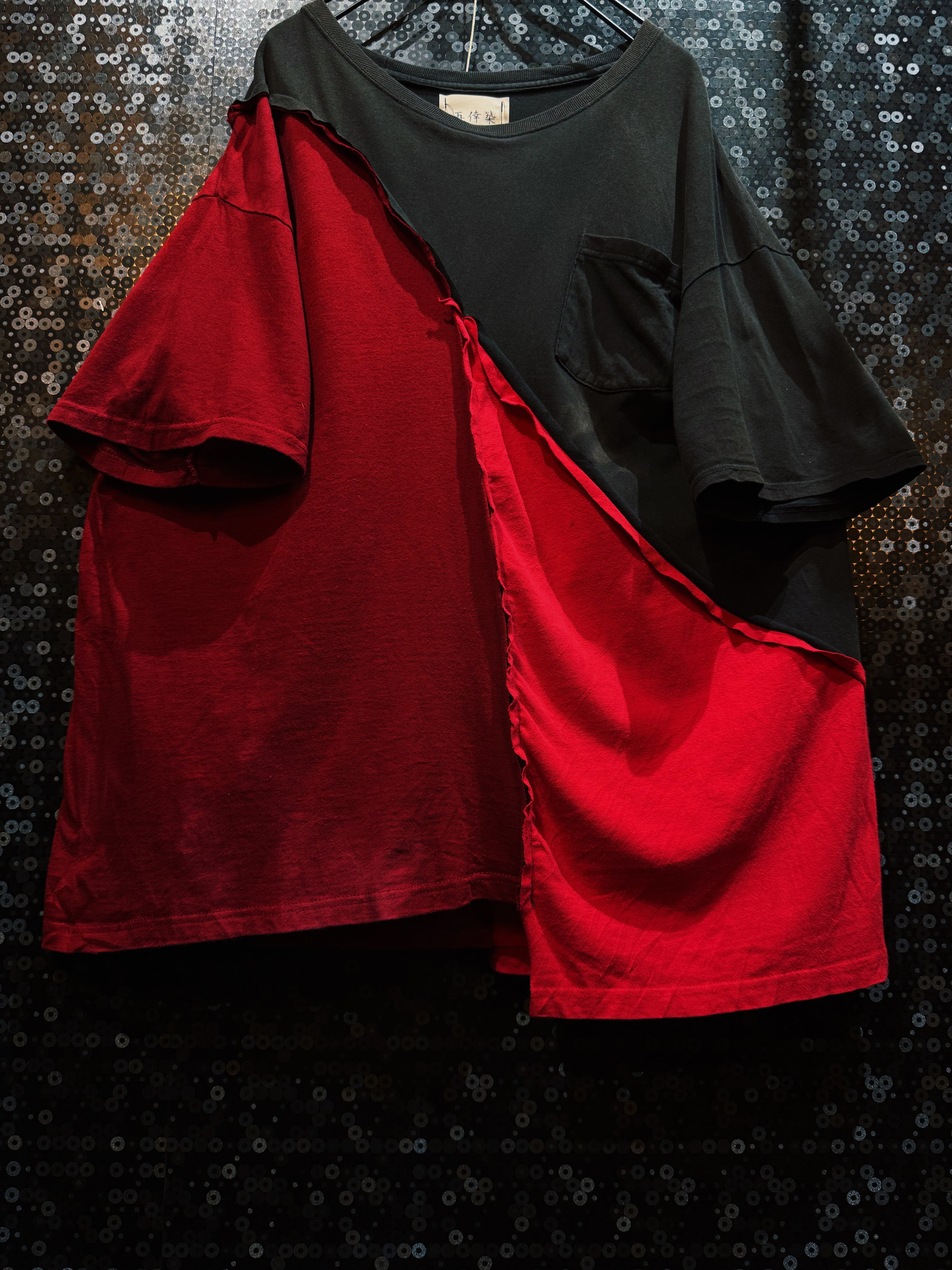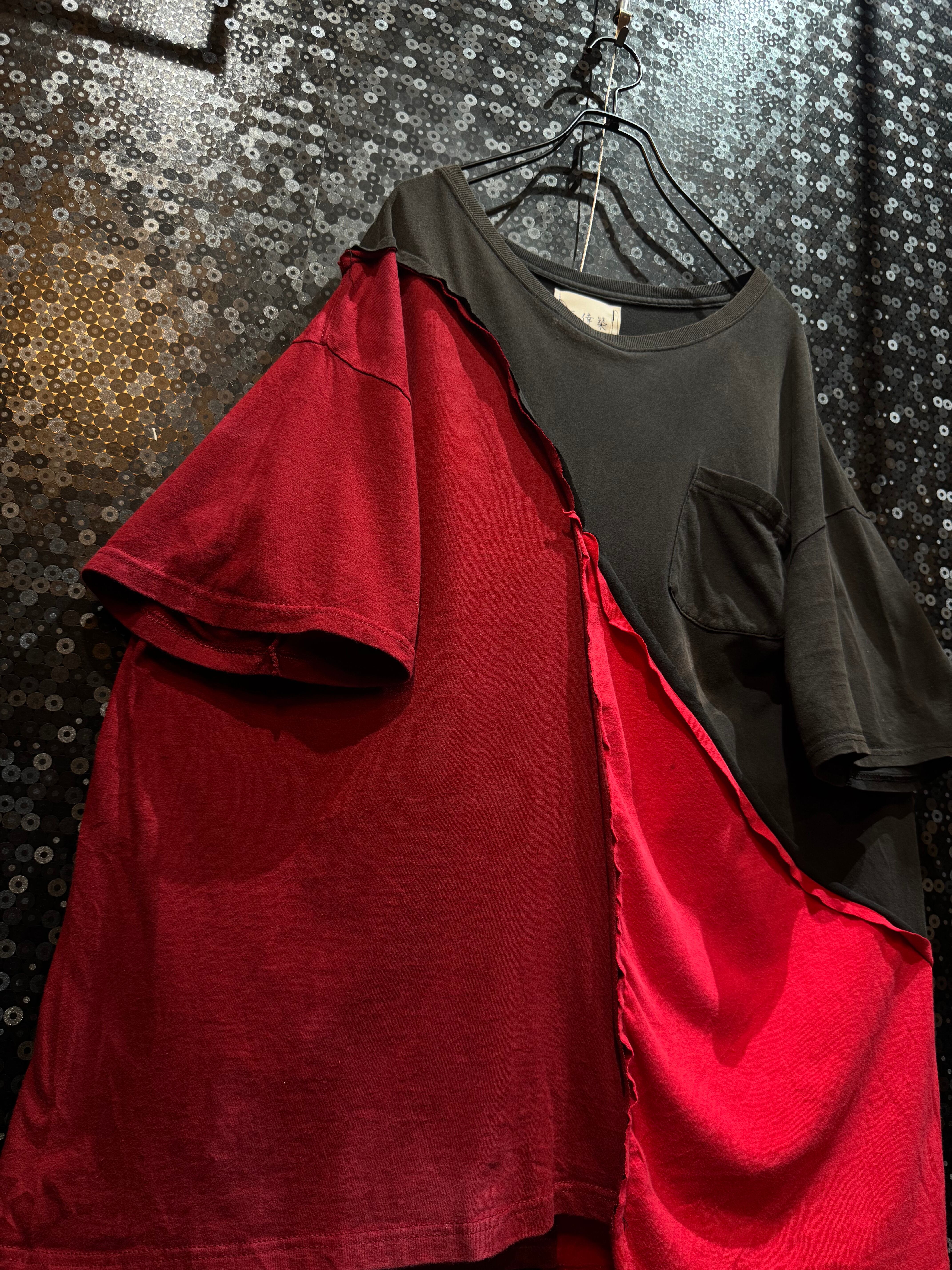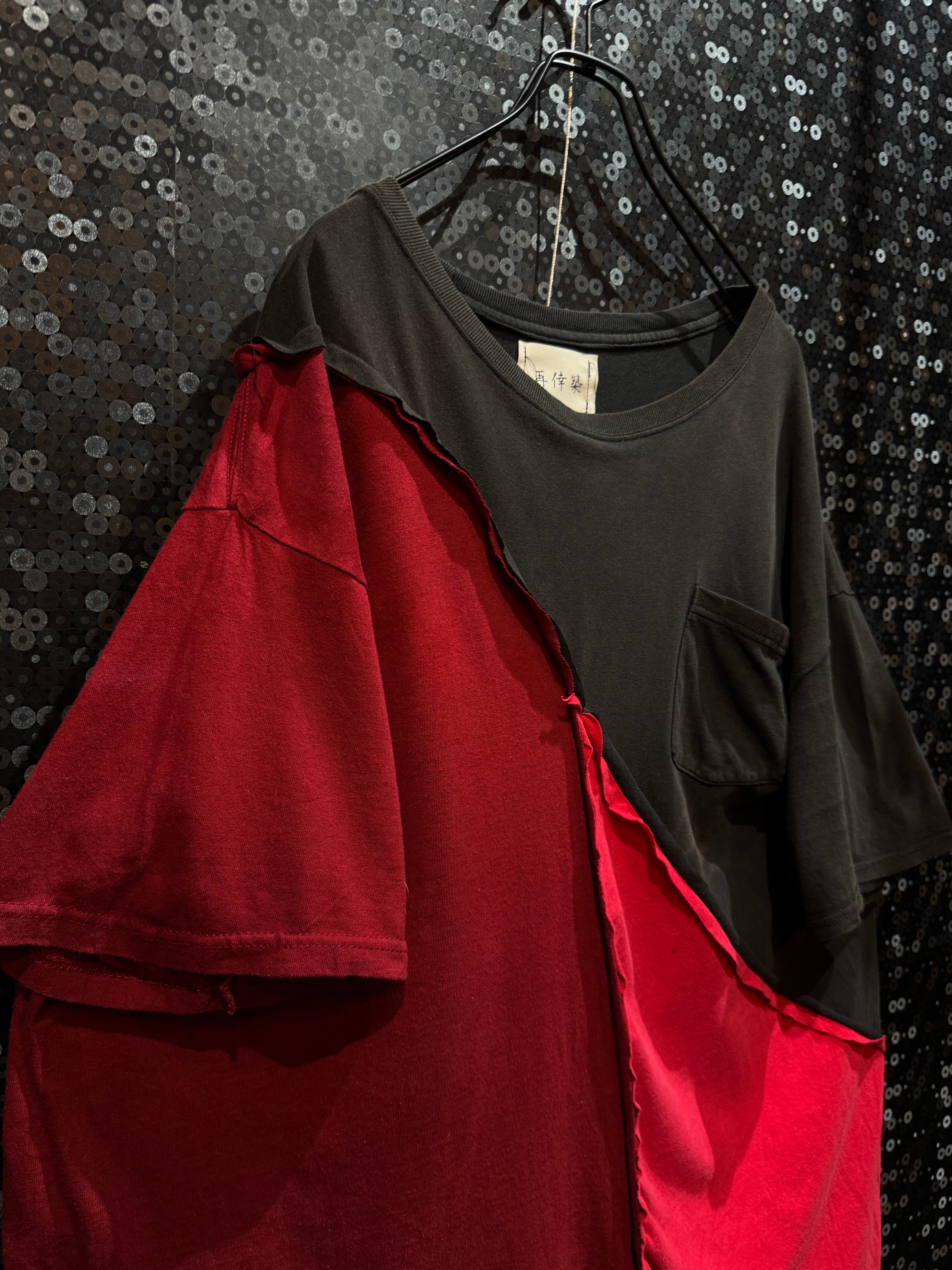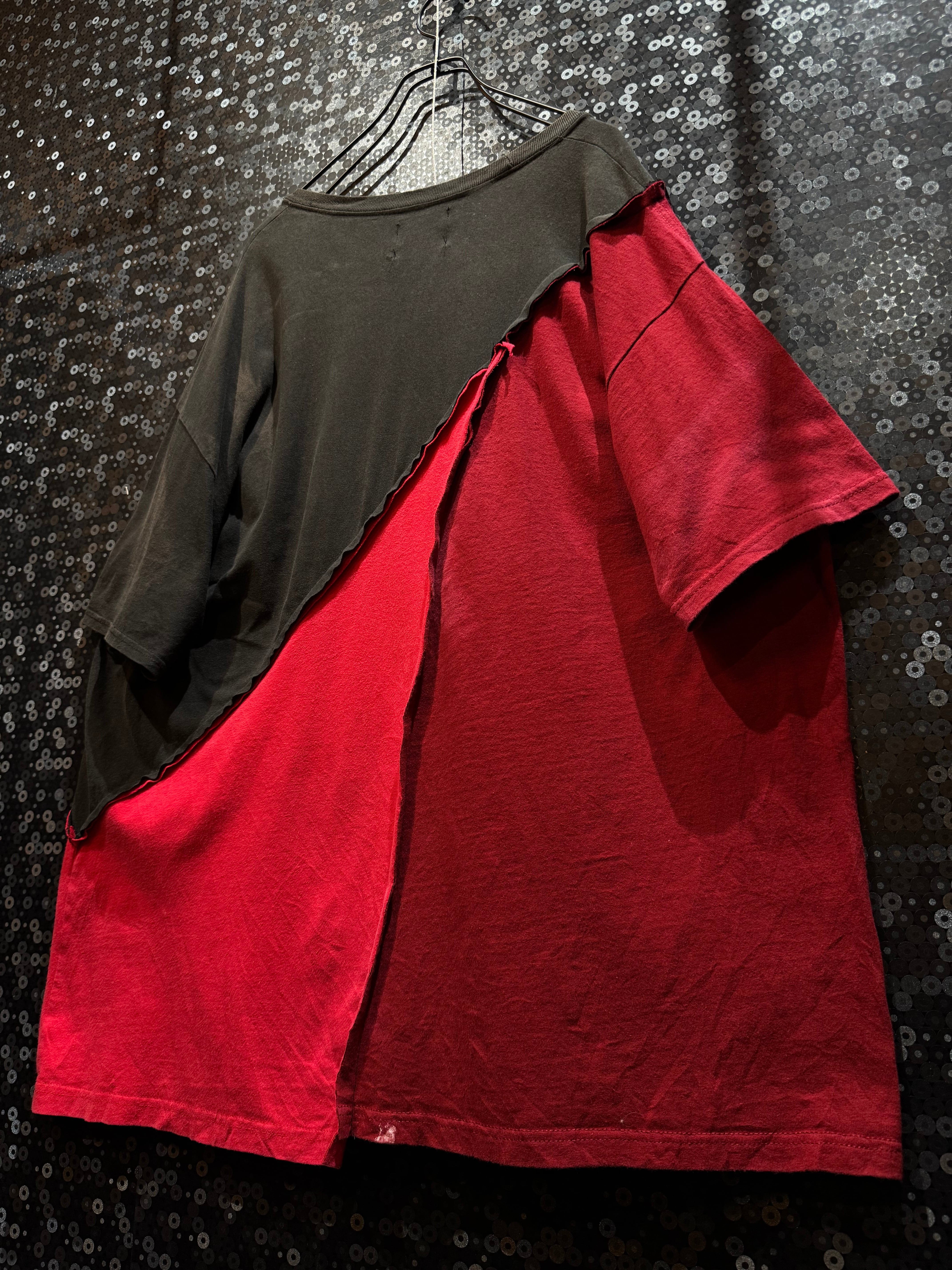 3枚の異なるTシャツを解体し、斜めと縦の切り替えで再構築した存在感抜群のトリプルドッキングTシャツ。