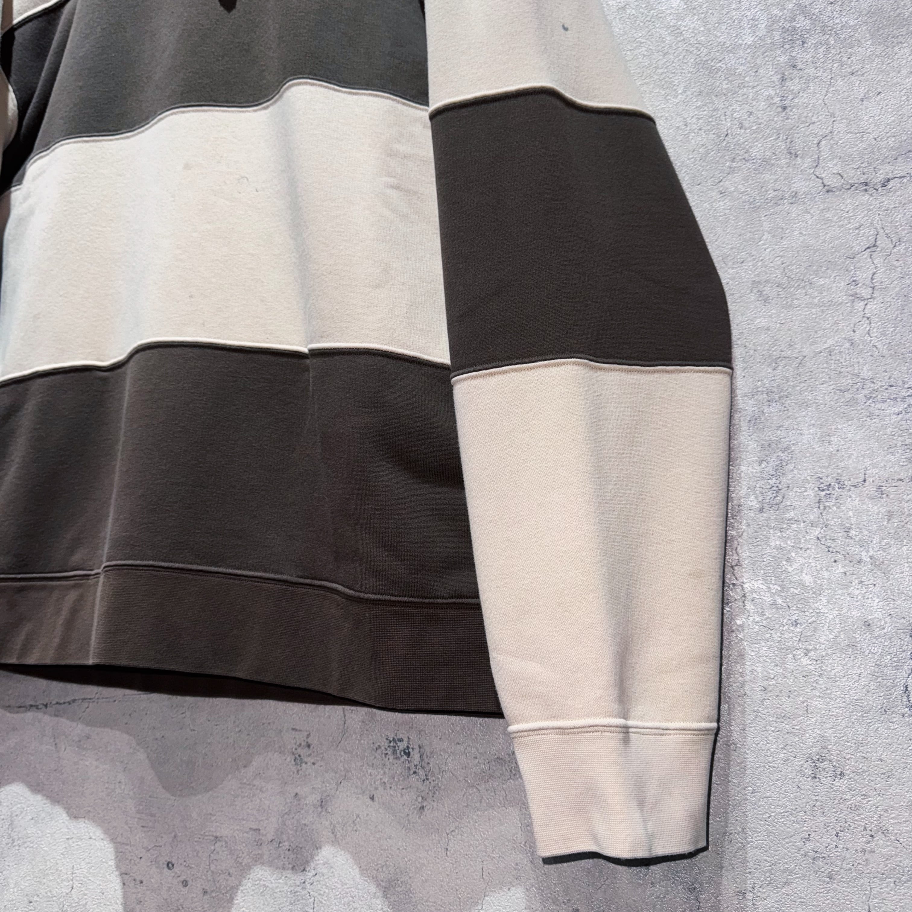 ベージュ×ブラウンのストライプがアクセントになったプルオーバースウェットフーディー。