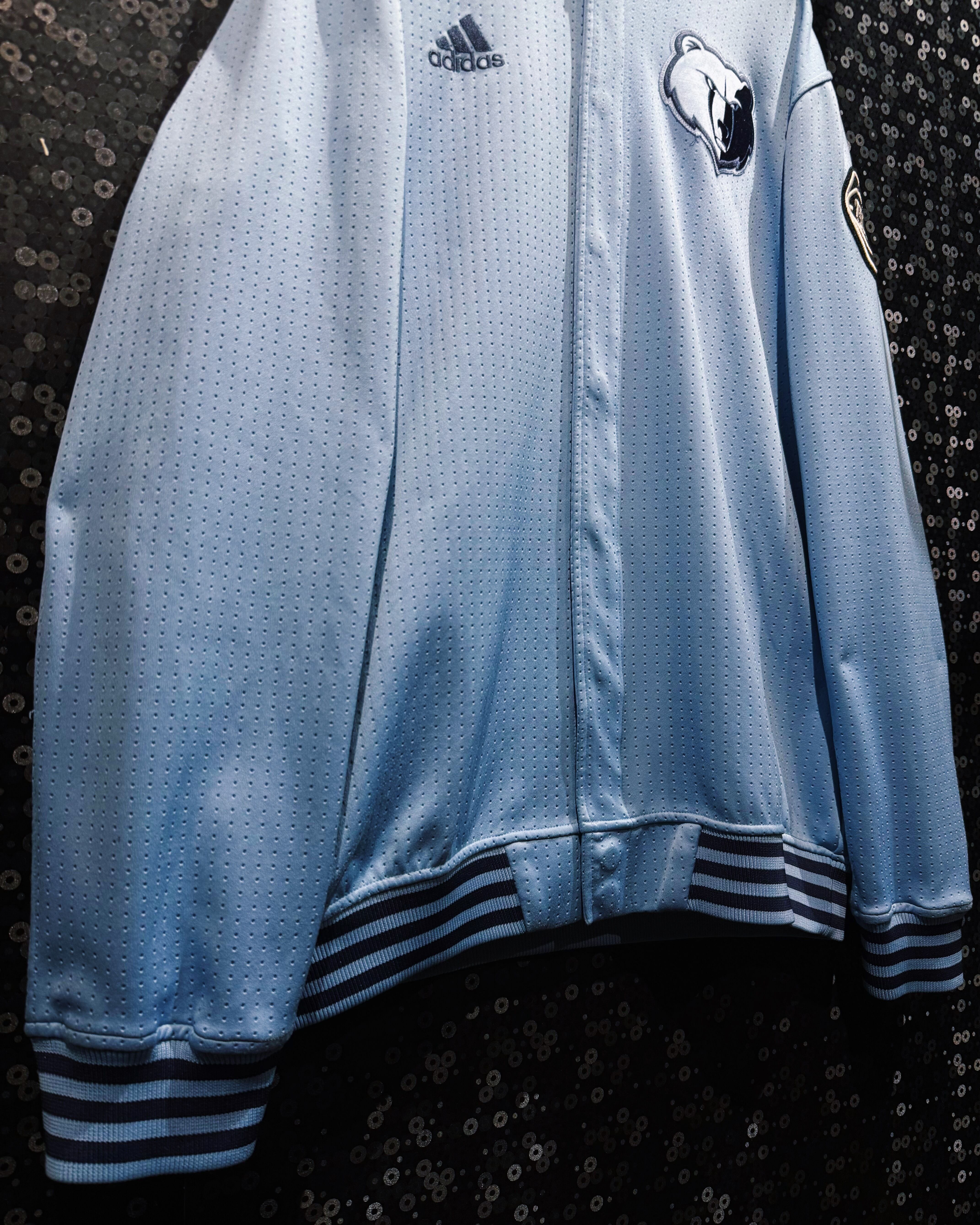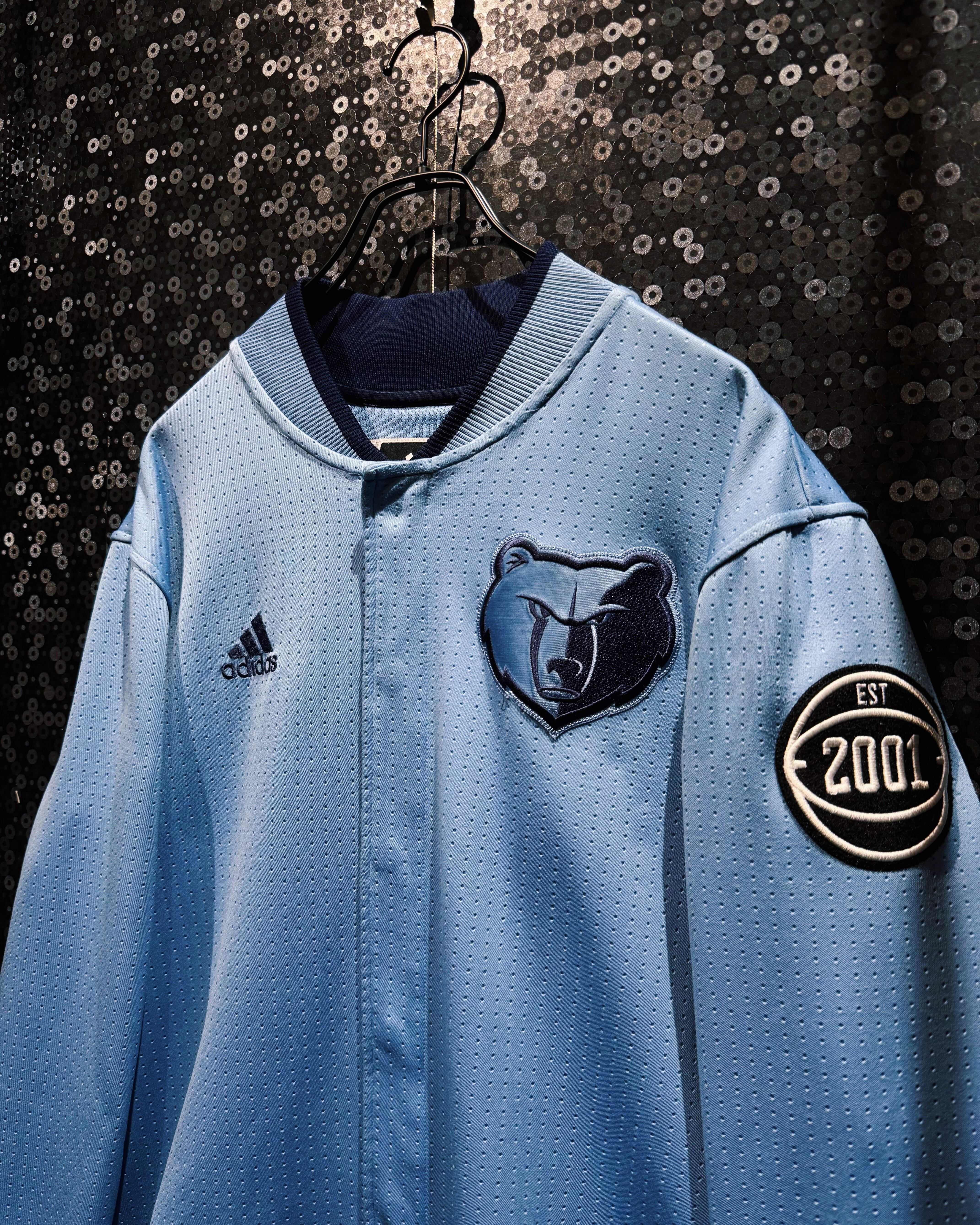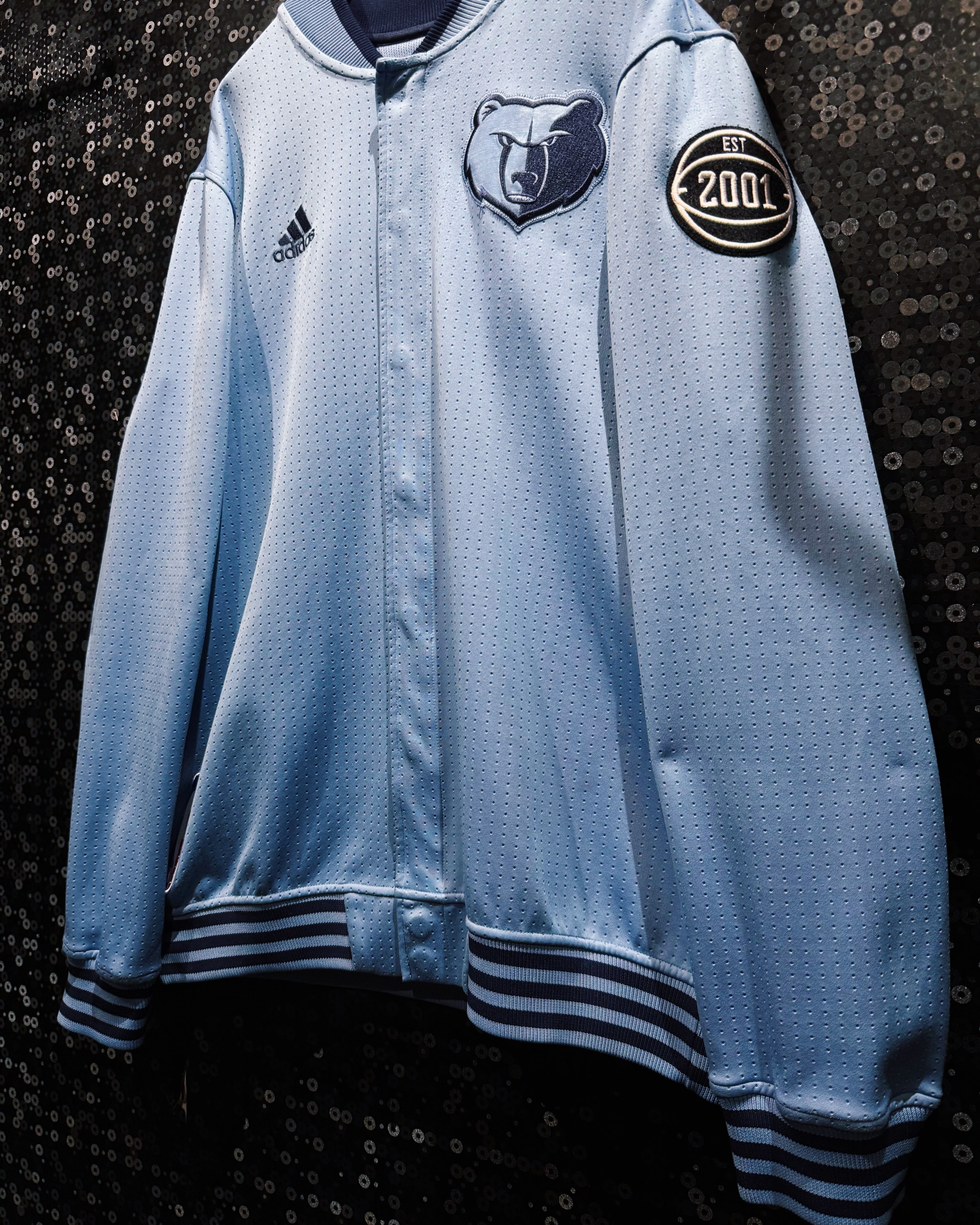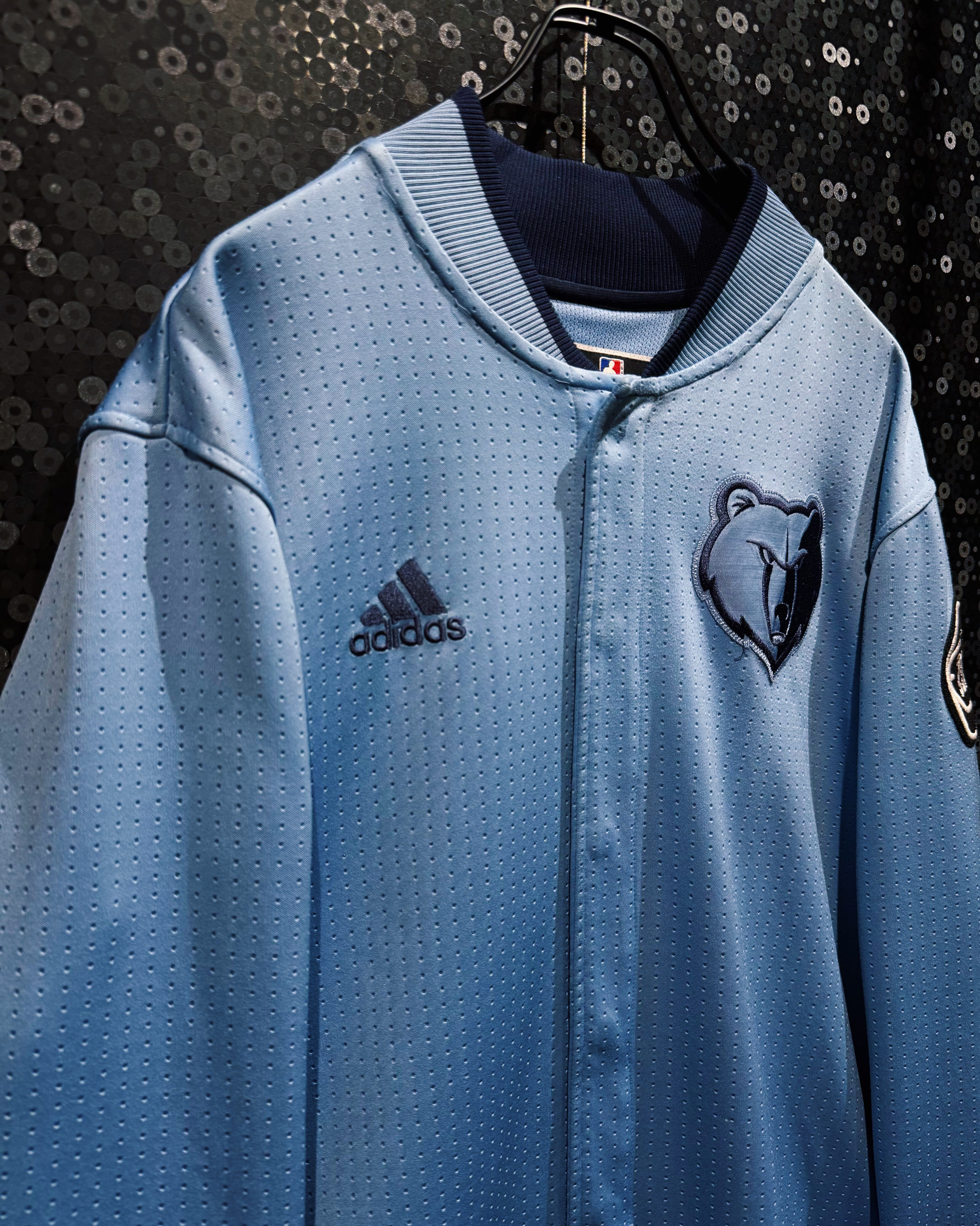 NBAチーム「メンフィス・グリズリーズ」の公式テイストを纏ったadidas製のチームジャケット。ライトブルーのボディに細かいパンチング加工が施され、通気性とスポーティな雰囲気を兼ね備えた逸品。