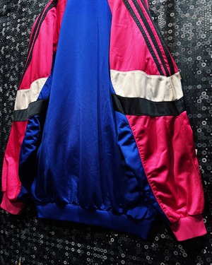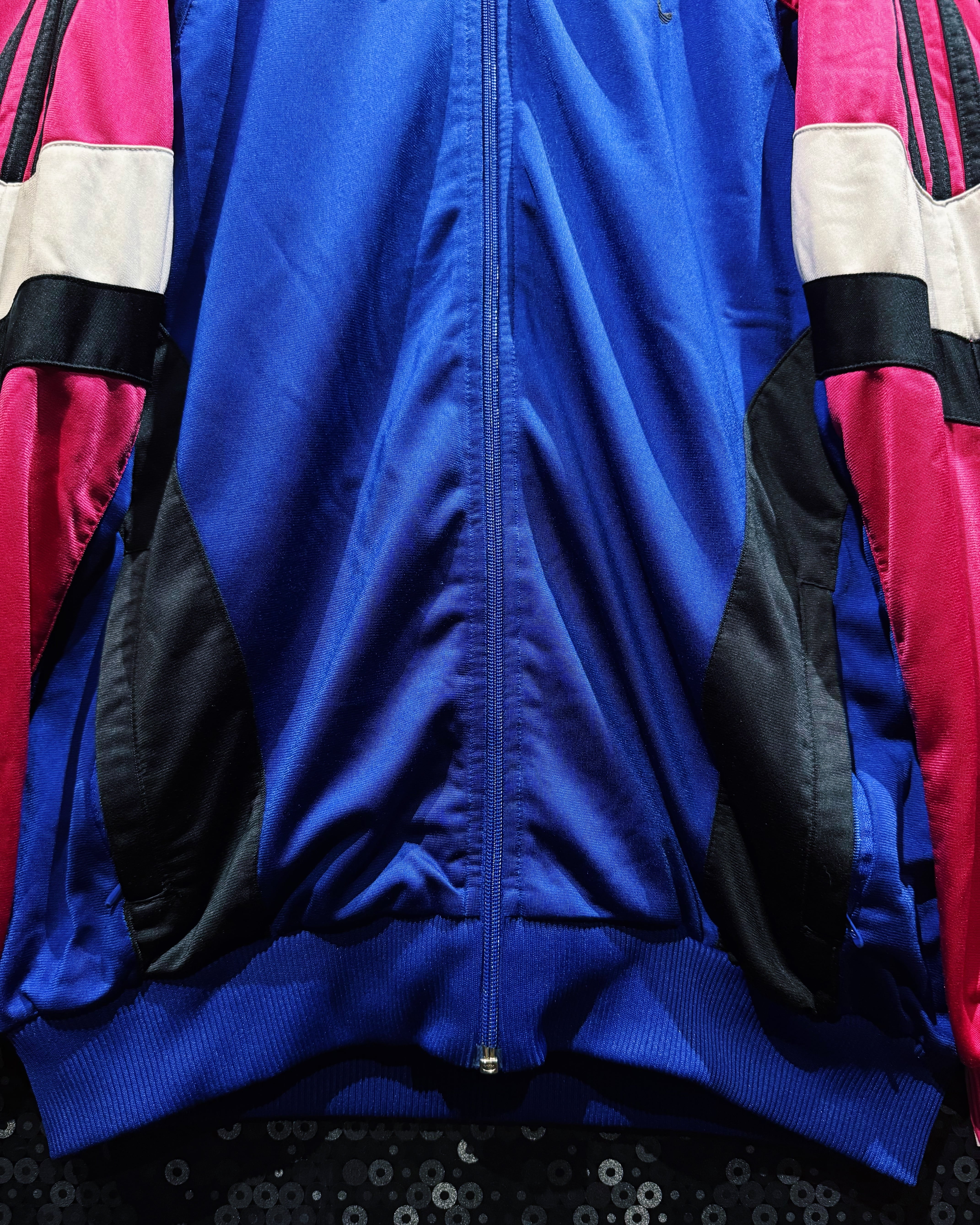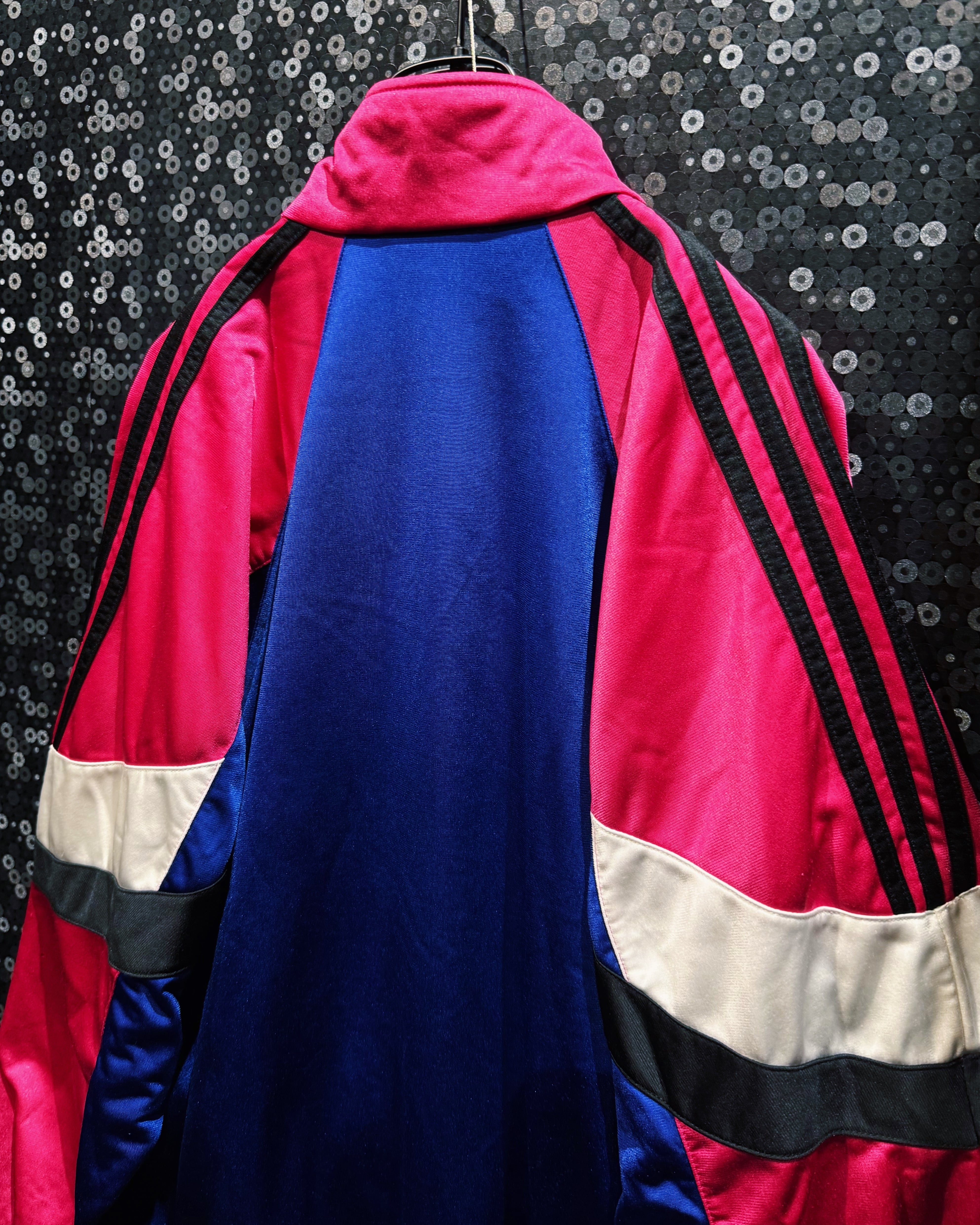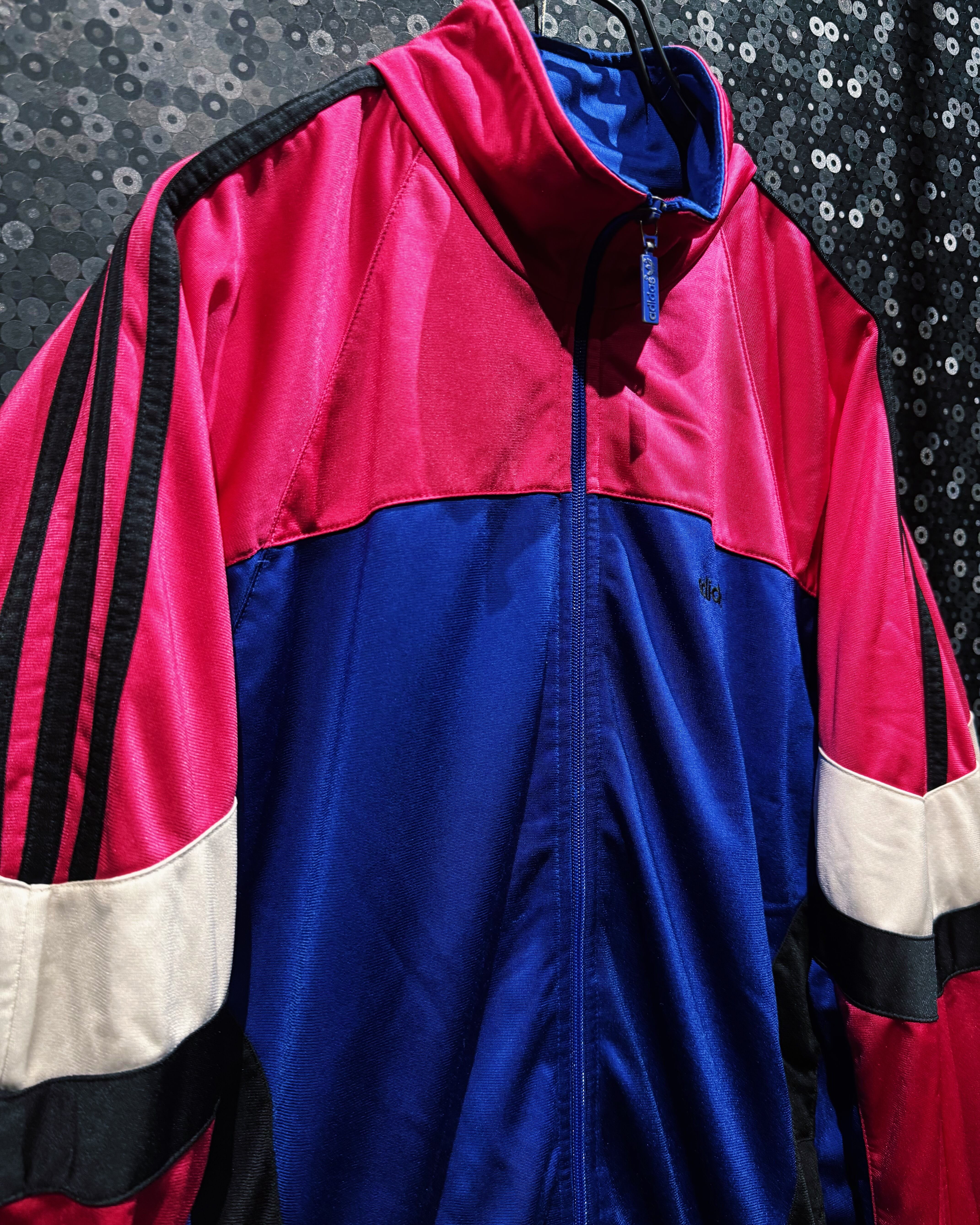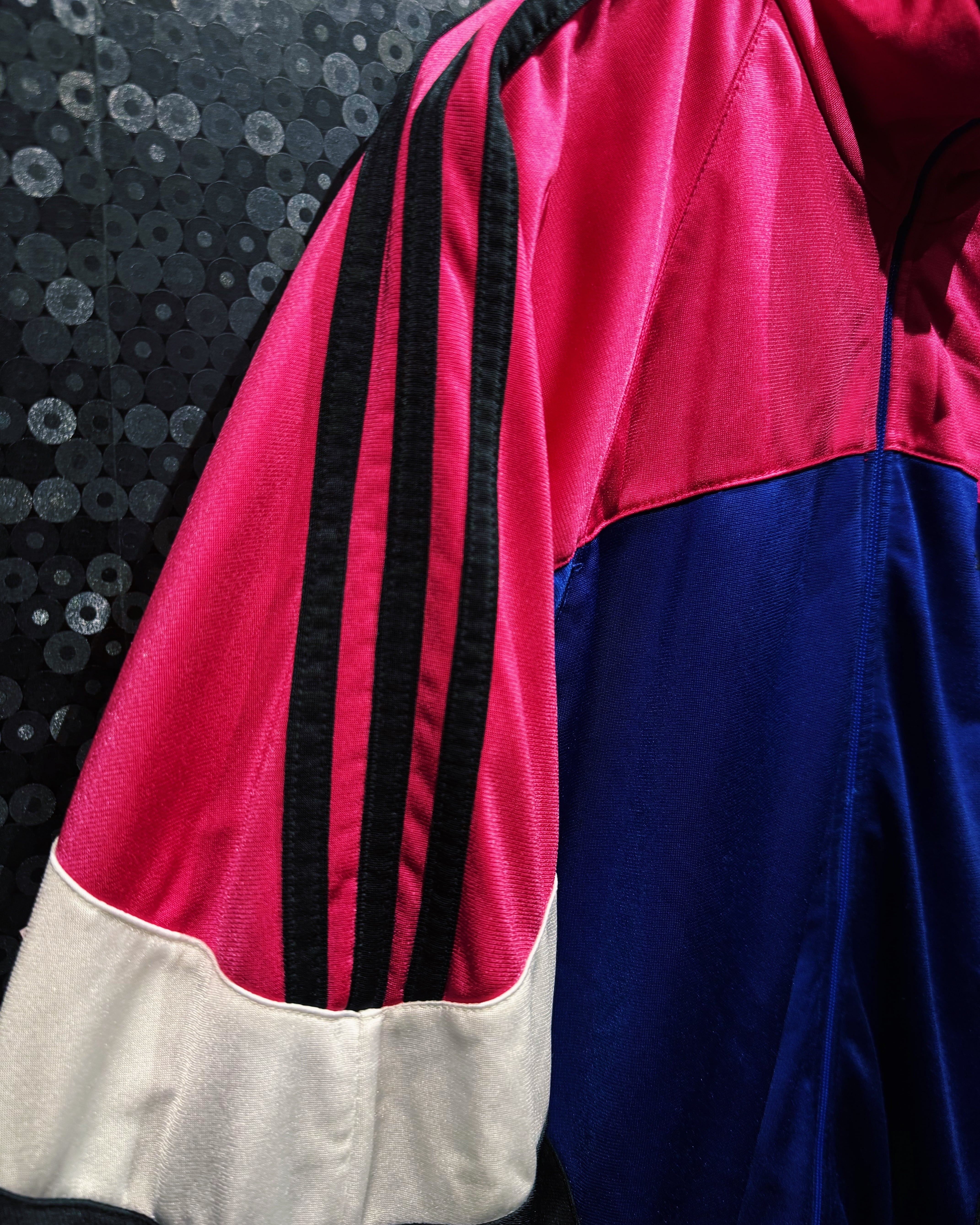 鮮やかなマゼンタピンク、深みのあるロイヤルブルー、ホワイトとブラックの切替を組み合わせた、強烈な存在感を放つadidas Originalsのトラックジャケット。