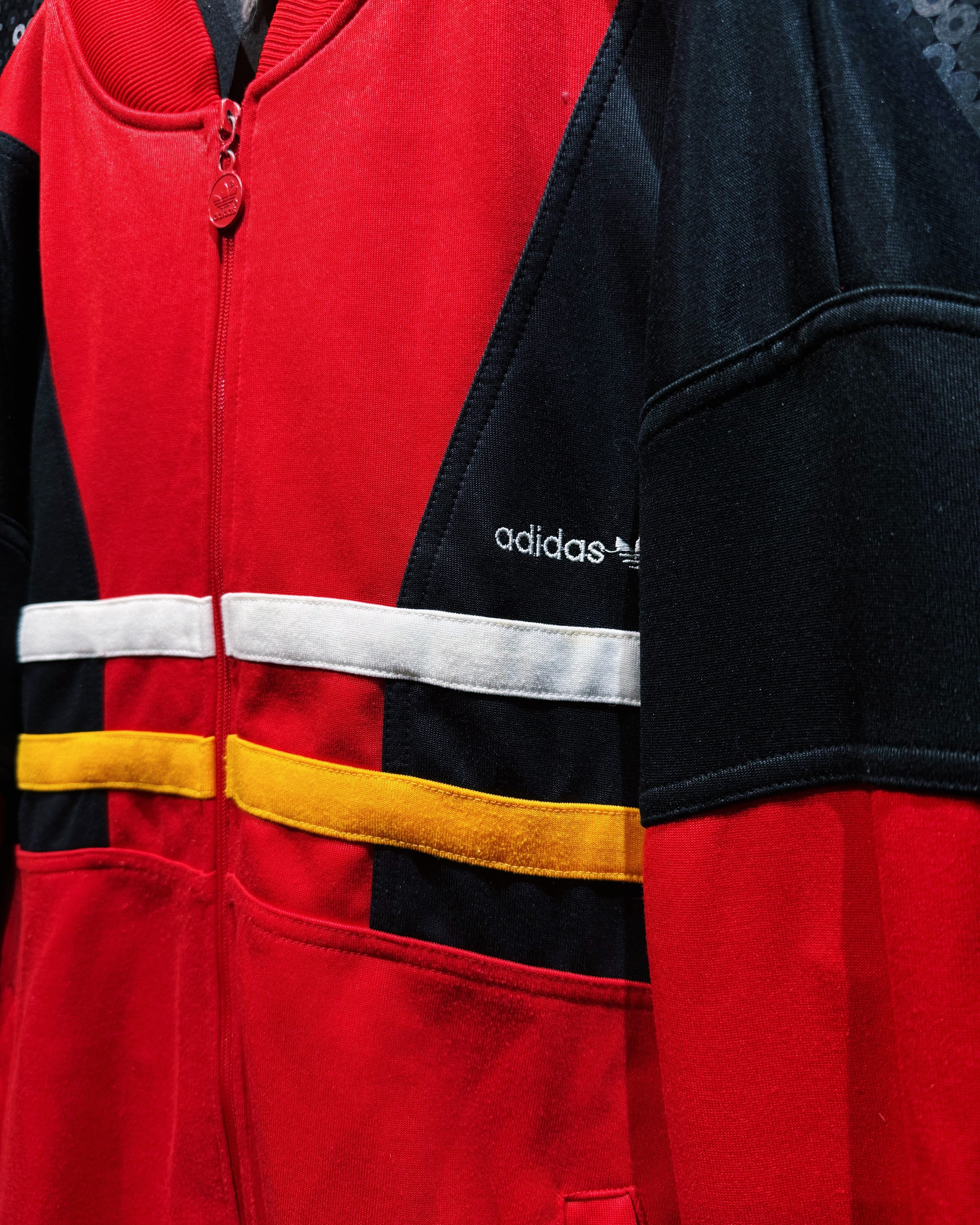 鮮烈なレッドとブラックをベースに、ホワイトとイエローのパネルラインを組み合わせた、存在感抜群のadidas Originalsトラックジャケット。
