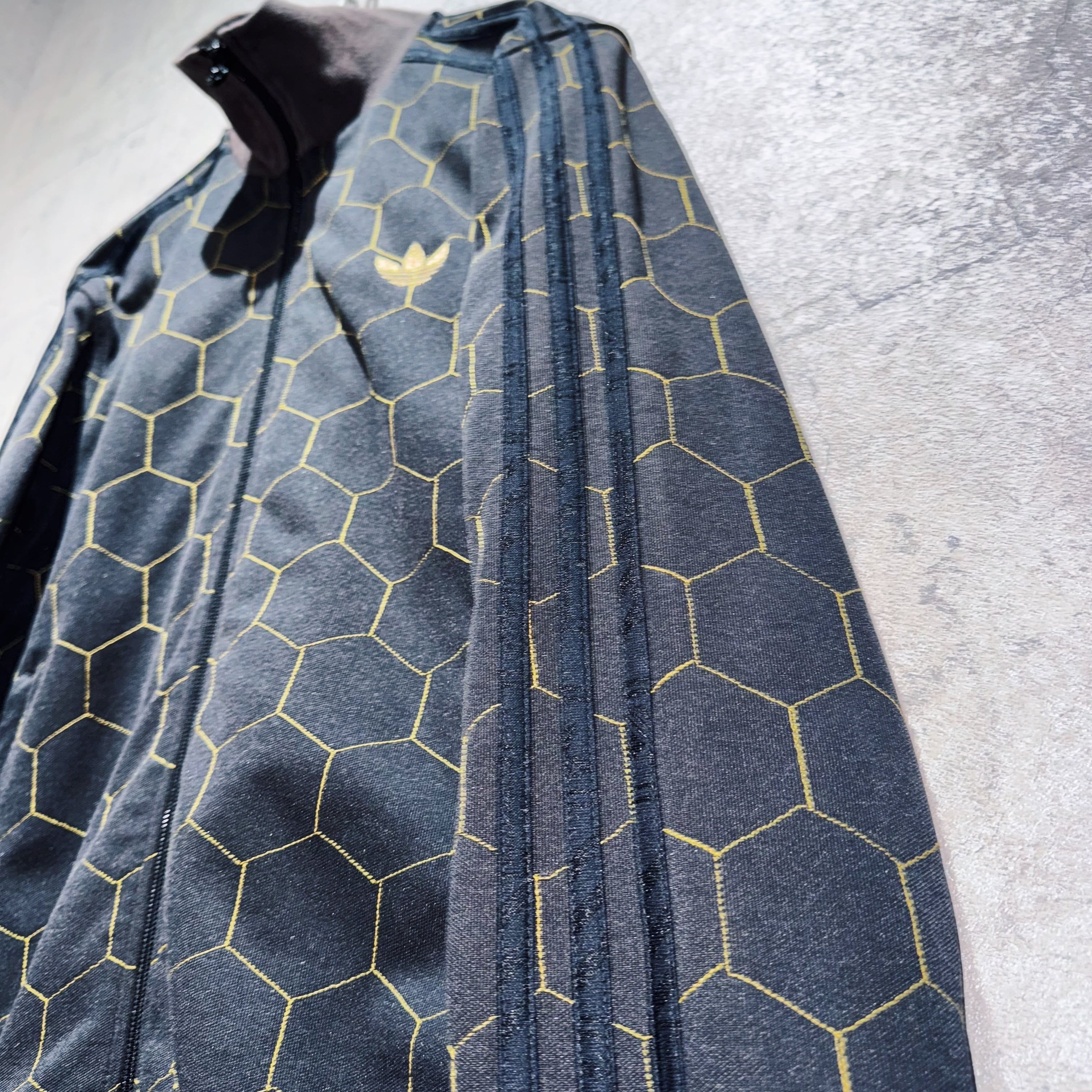ボディ全体に蜂の巣のようなヘキサゴンの刺繍をあしらったトラックジャケット。ゴールドの刺繍であしらうことでラグジュアリーさを演出しています。