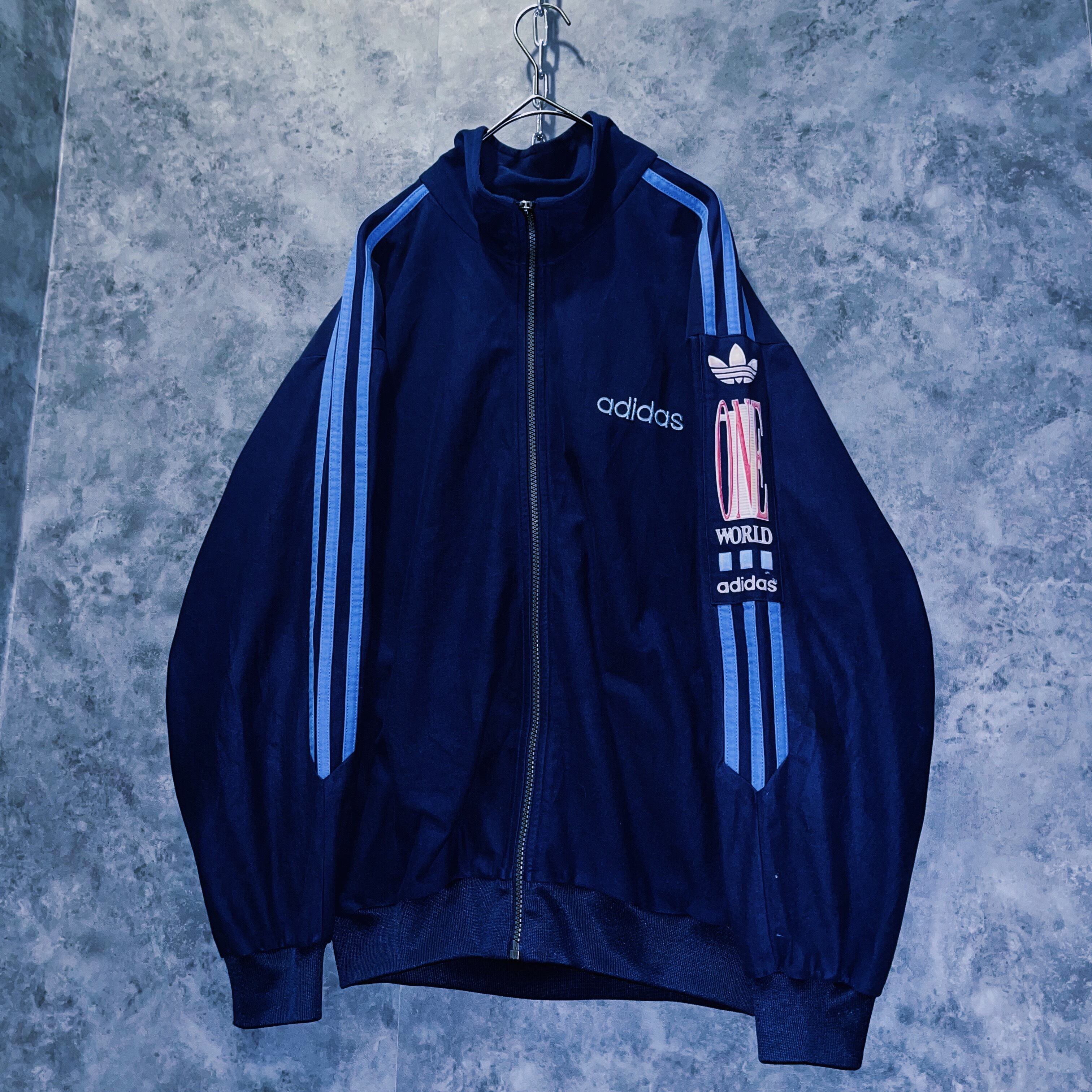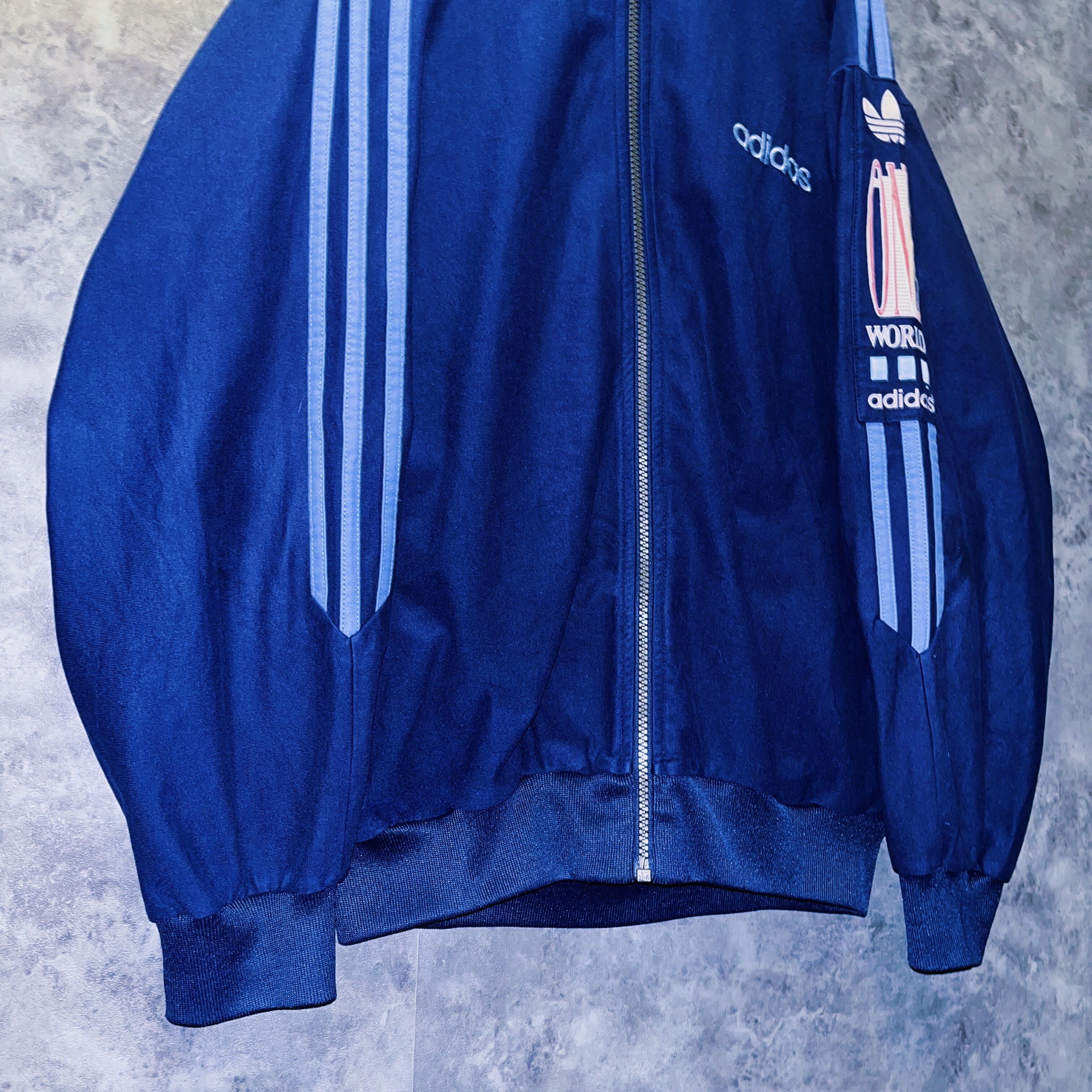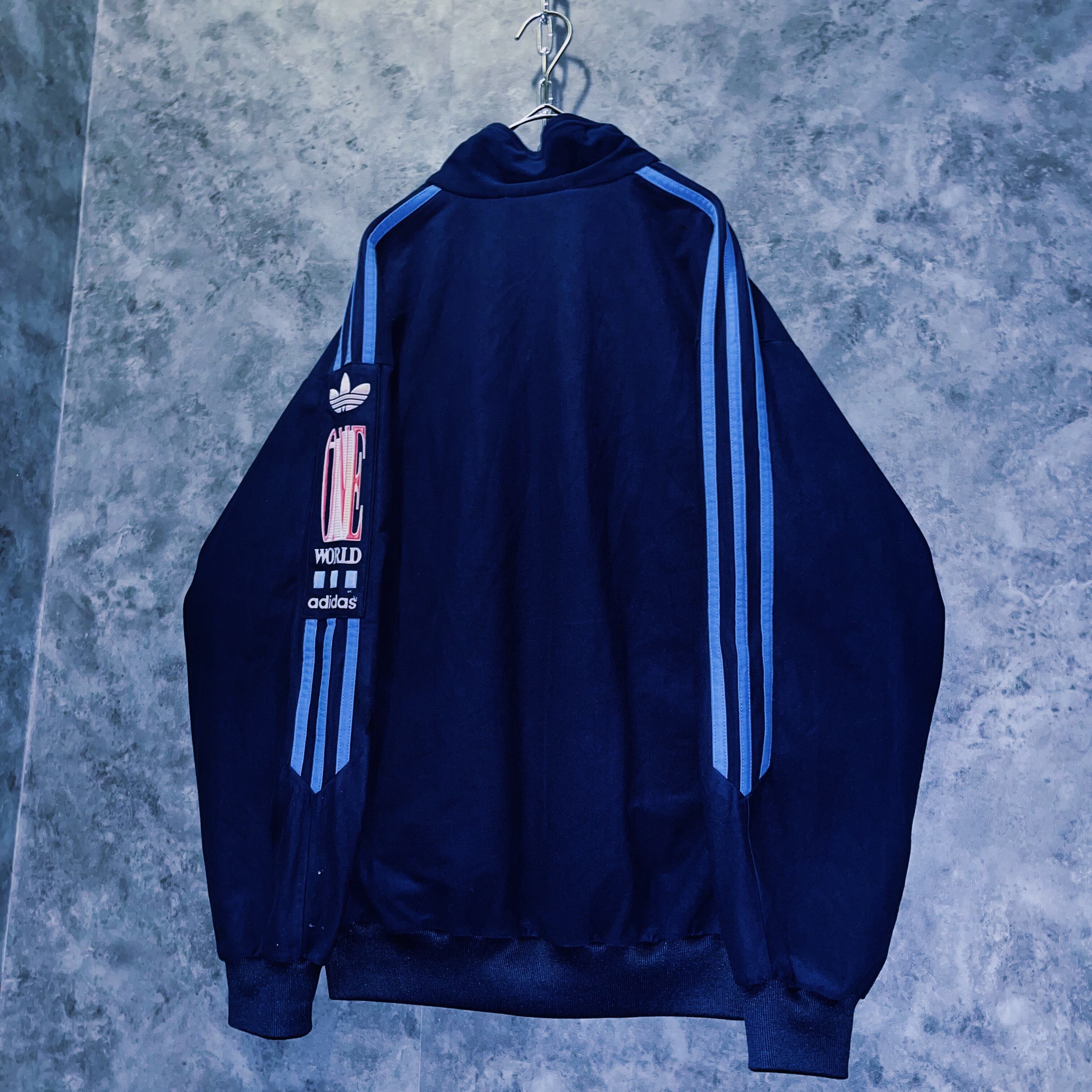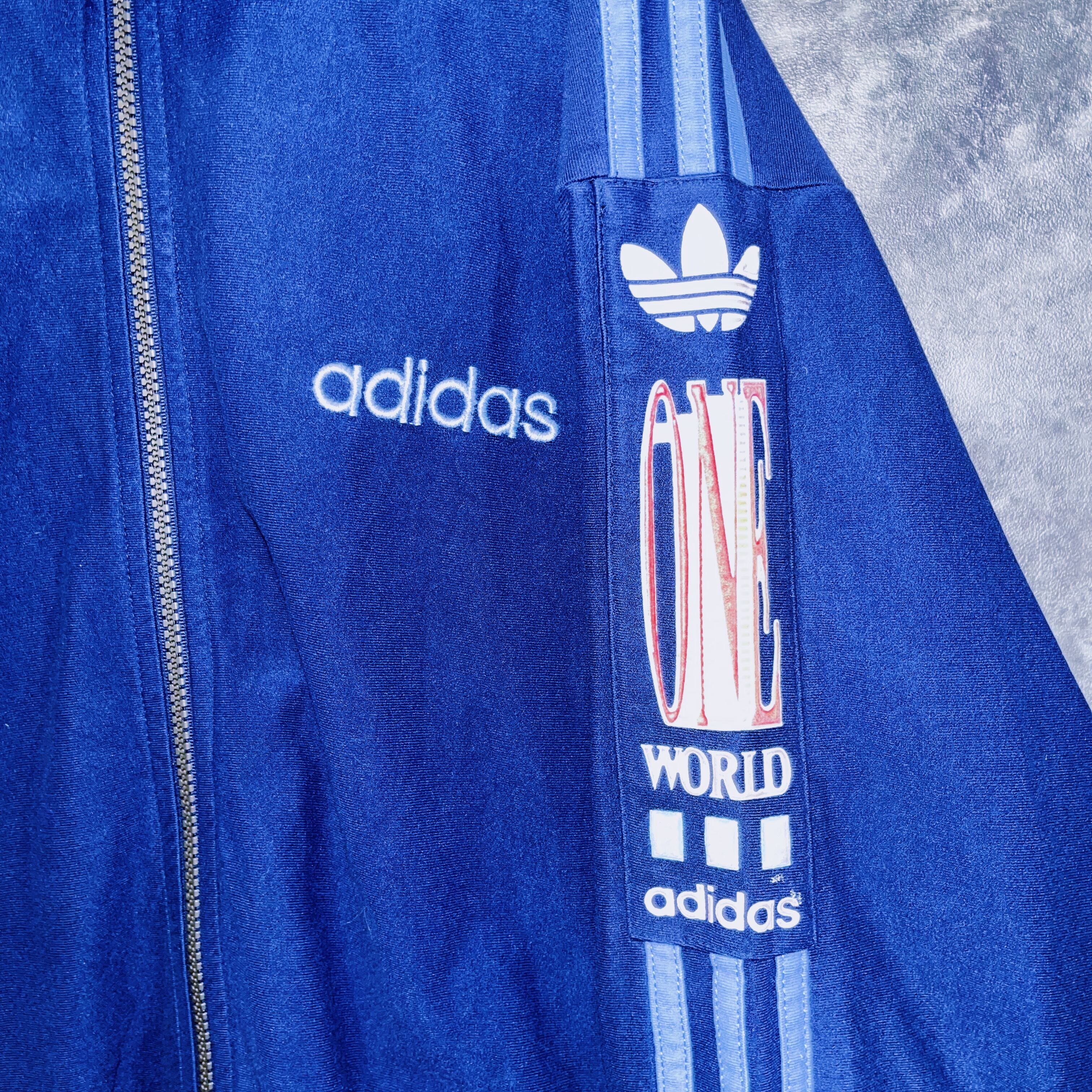 アーム部分には“adidas“を象徴するスリーストライプが施され、左腕に「ONE WORLD」の刺繍が施された、なかなか見かけないデザイン。