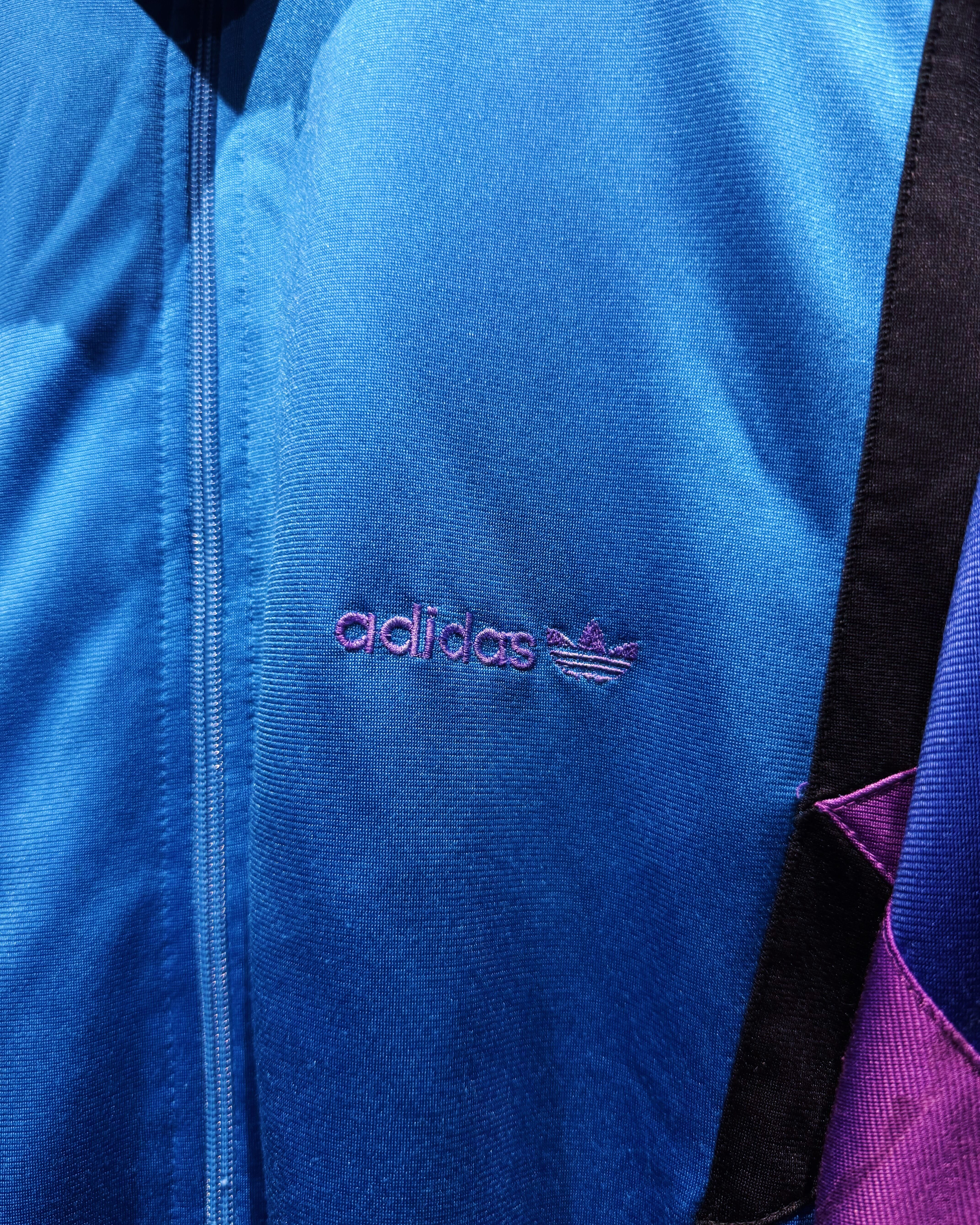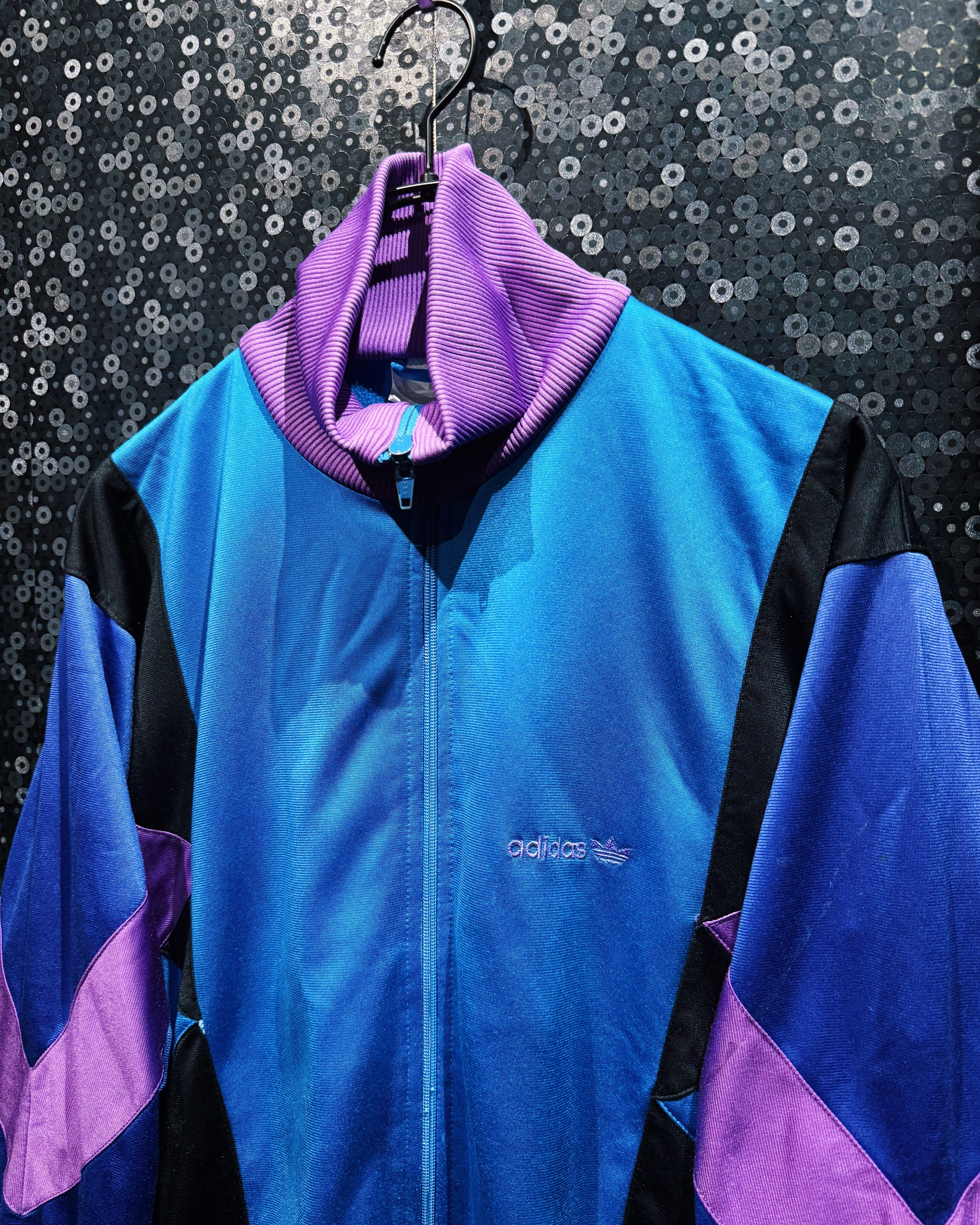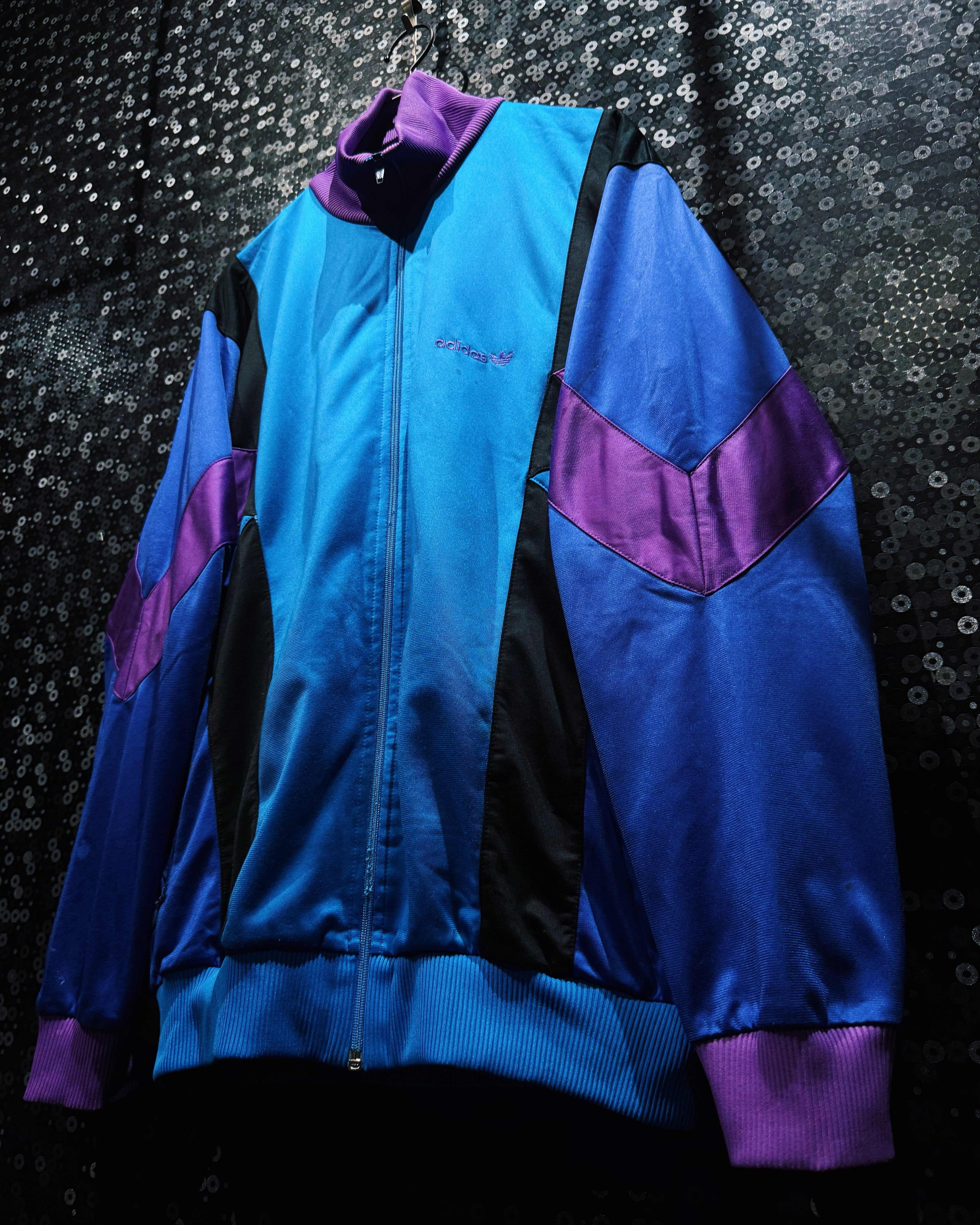 鮮やかなブルーをベースに、パープルとブラックの切り替えを効かせたadidas Originalsのトラックジャケット。