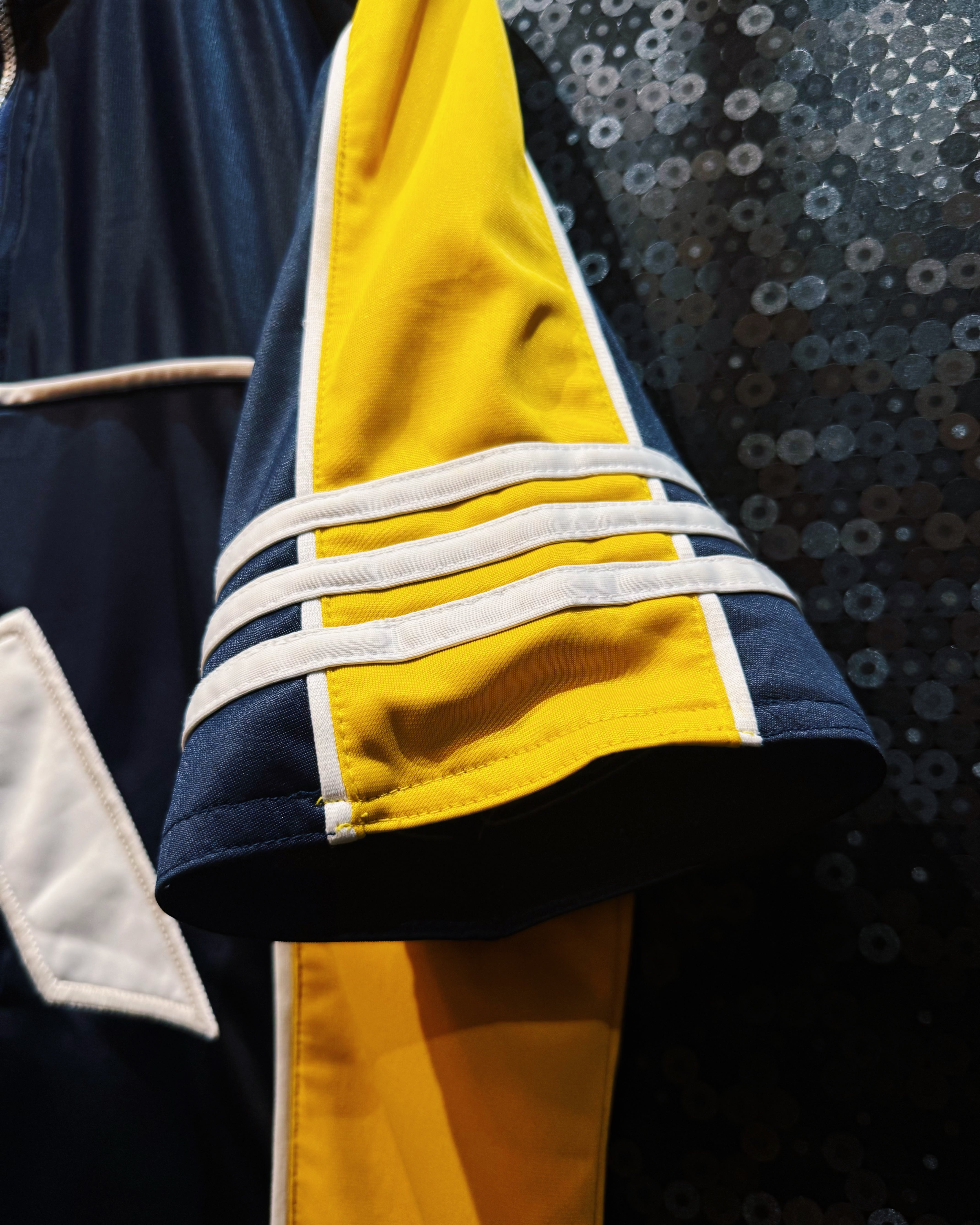 ブラックとイエローの鮮烈なカラーリングにホワイトのパイピングとスリーストライプスが走るデザインは、90’s〜00’sらしいスポーツミックス感を強調している。