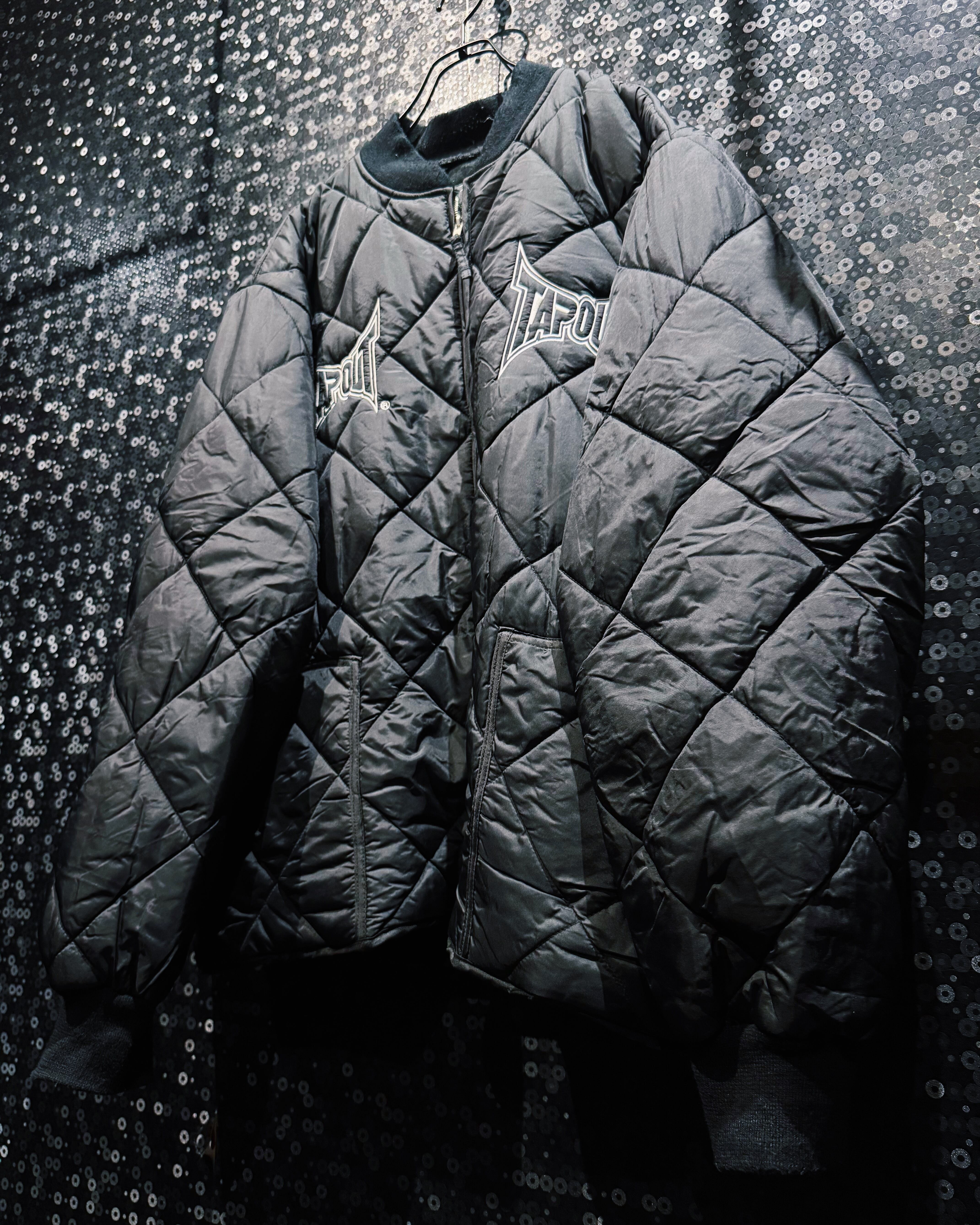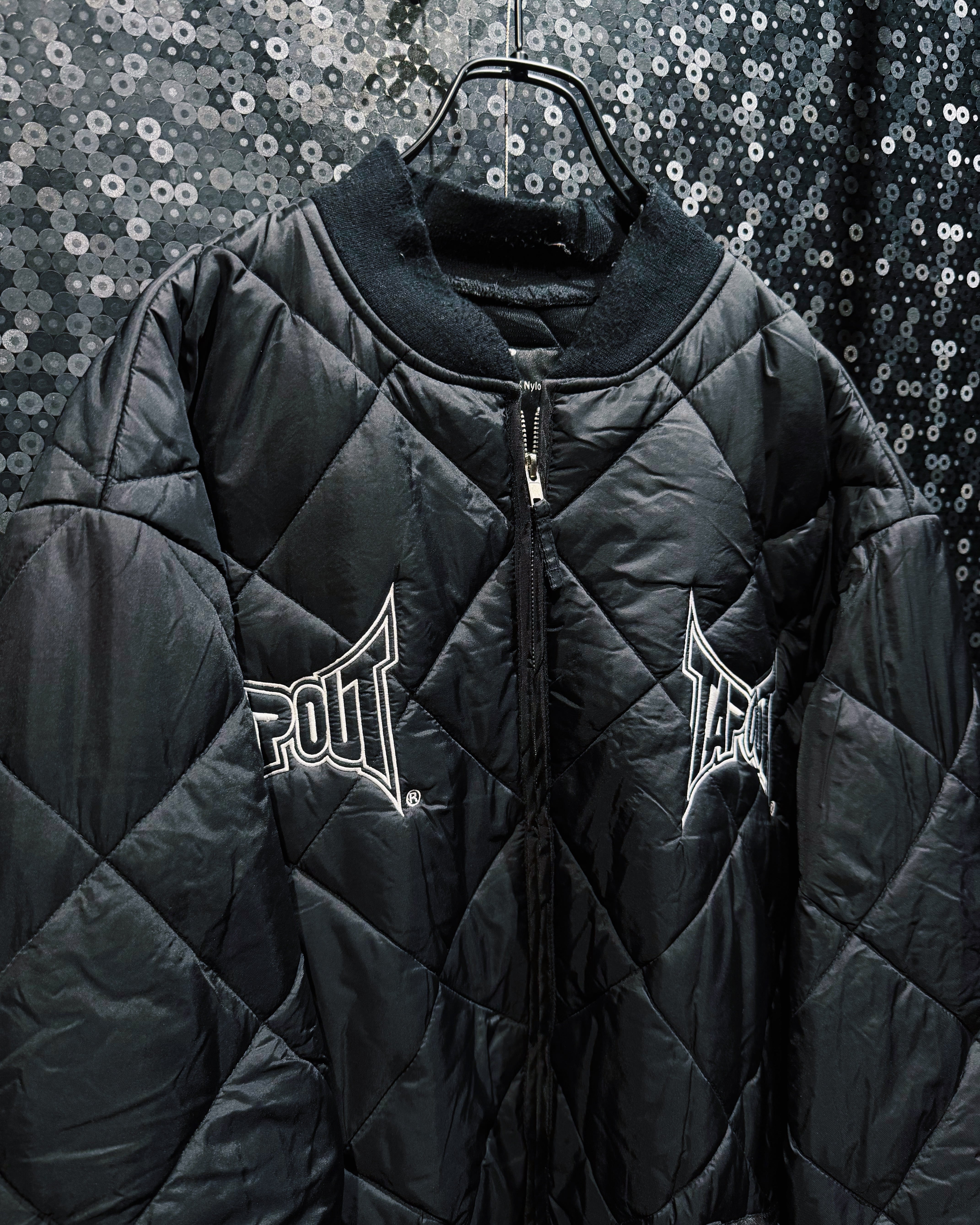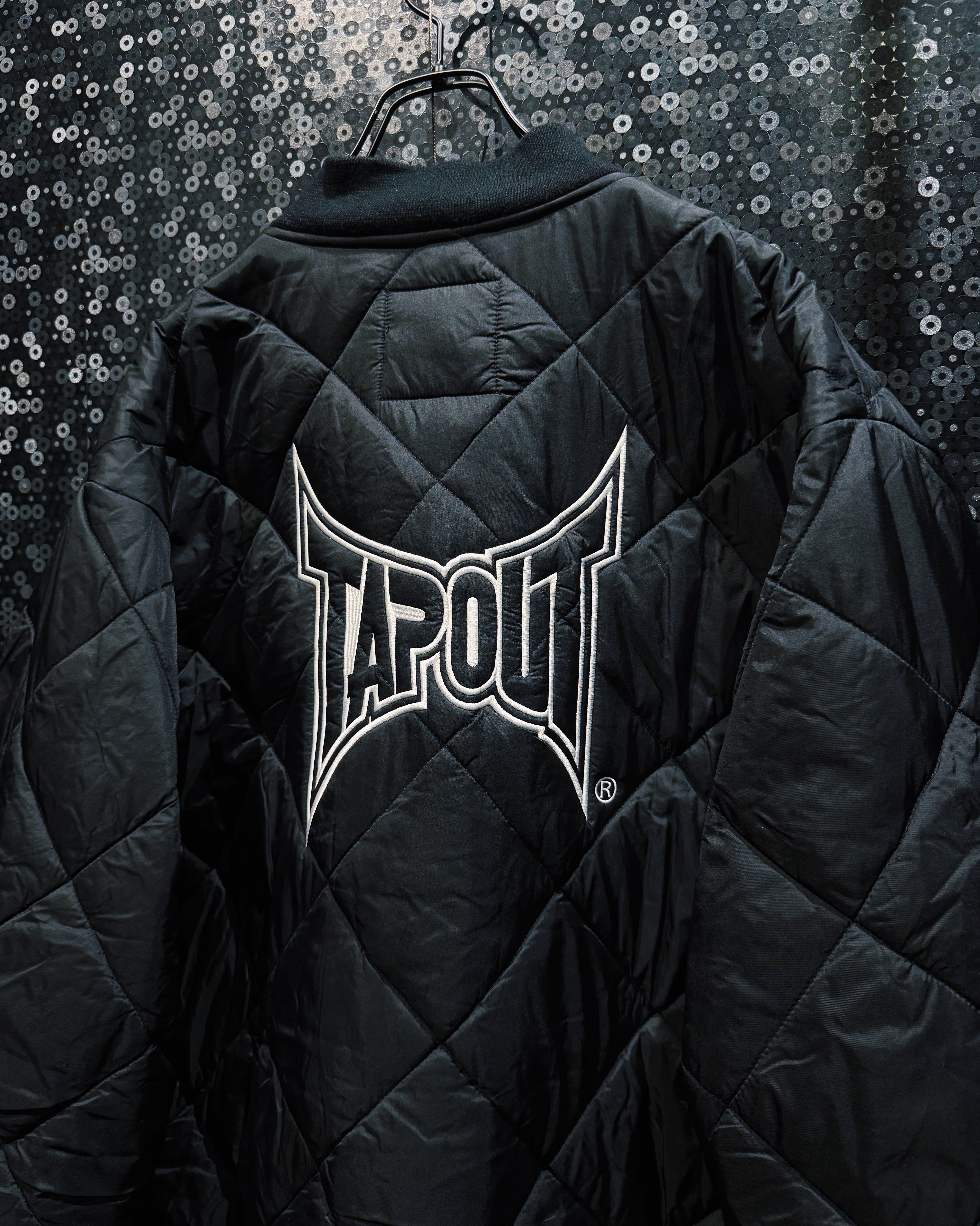 総キルティング仕様のブラックボンバージャケット。格闘技ブランド「TapouT」のロゴがフロント両胸と背面に大きく刺繍され、スポーツカルチャーの力強い存在感を放つ一着。