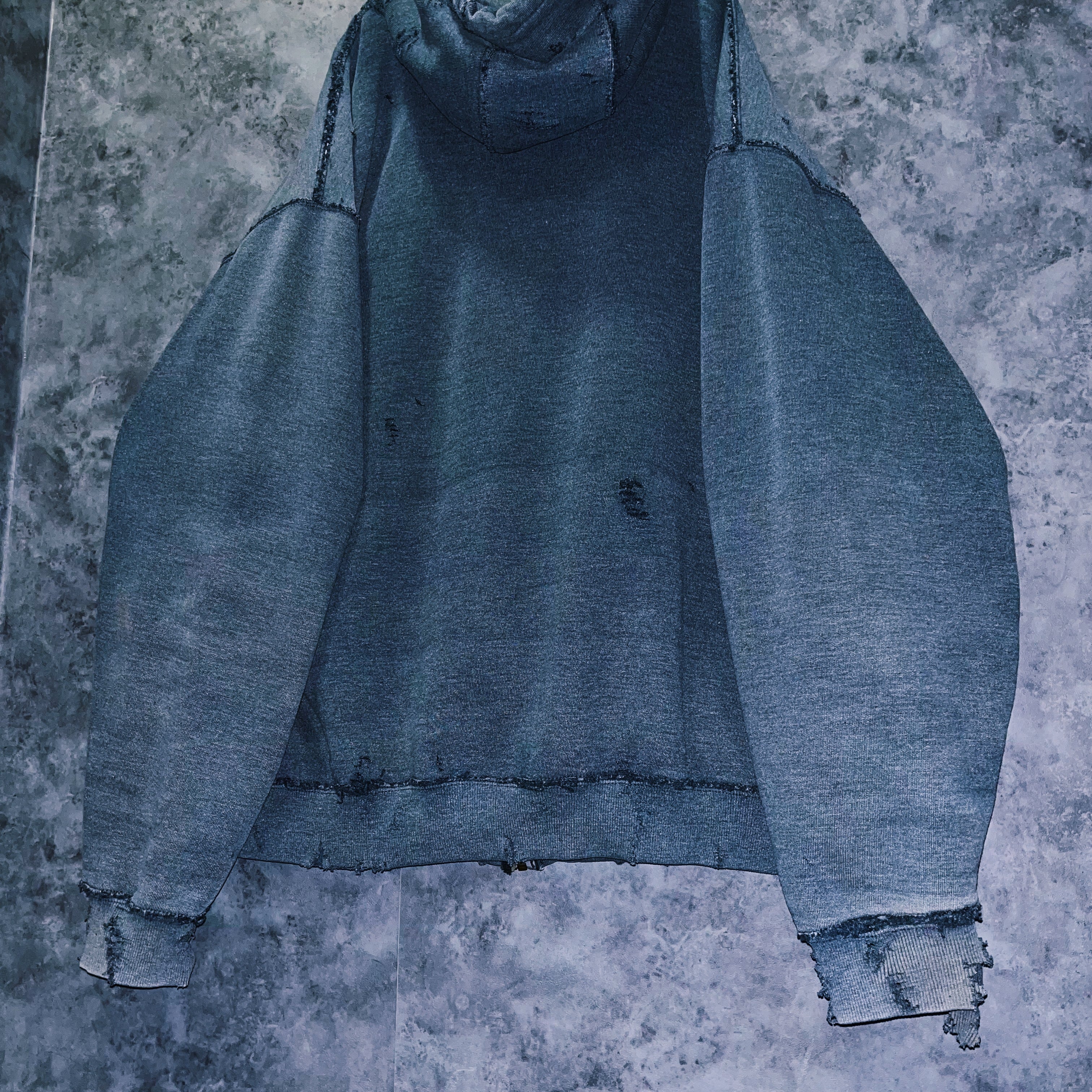 フェードデザインの褪せたフォググレーカラーのフーディにリブやシーム部分を中心にダメージを与えた一着。