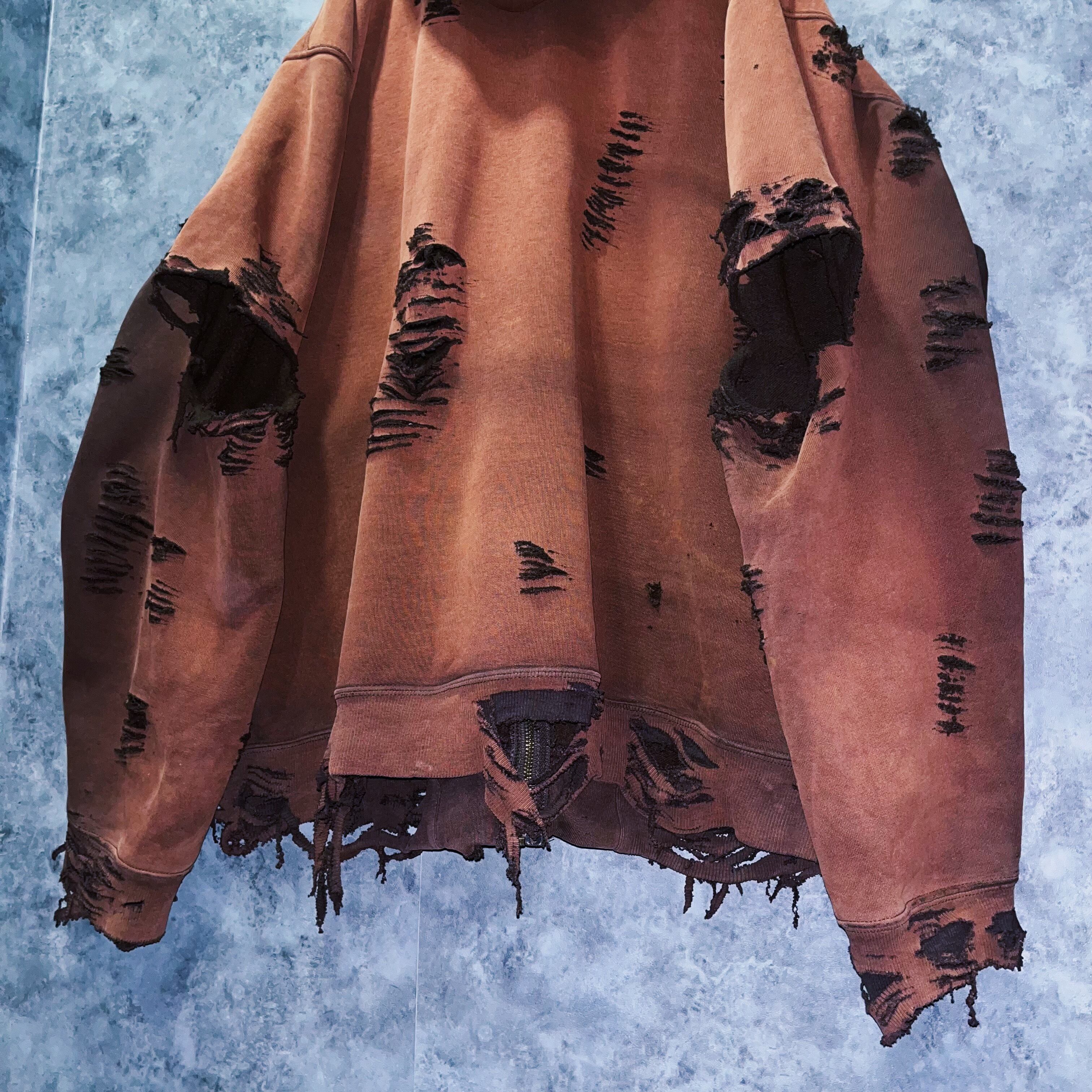 退廃的な雰囲気をもつフェードデザインのフーディを当店自慢のダメージ加工でエッジを加えたデザインの一枚。