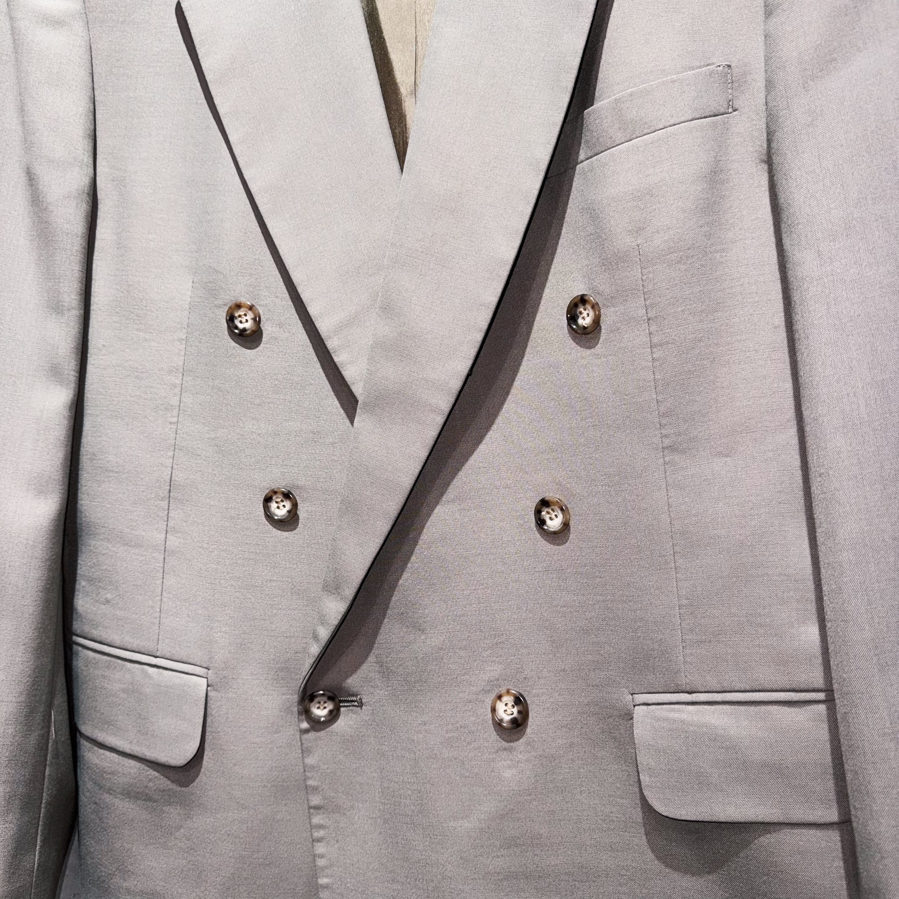ベーシックなくすんだベージュを身に纏い、高品質のウールを採用することで美しい光沢を放ち品格のある佇まいのセットアップ。ダブルブレストに加え立体感を生み出すパワーショルダー、パンツもセンタープレスが施された美しいシルエットでどちらも単体でも活躍してくれるかと。