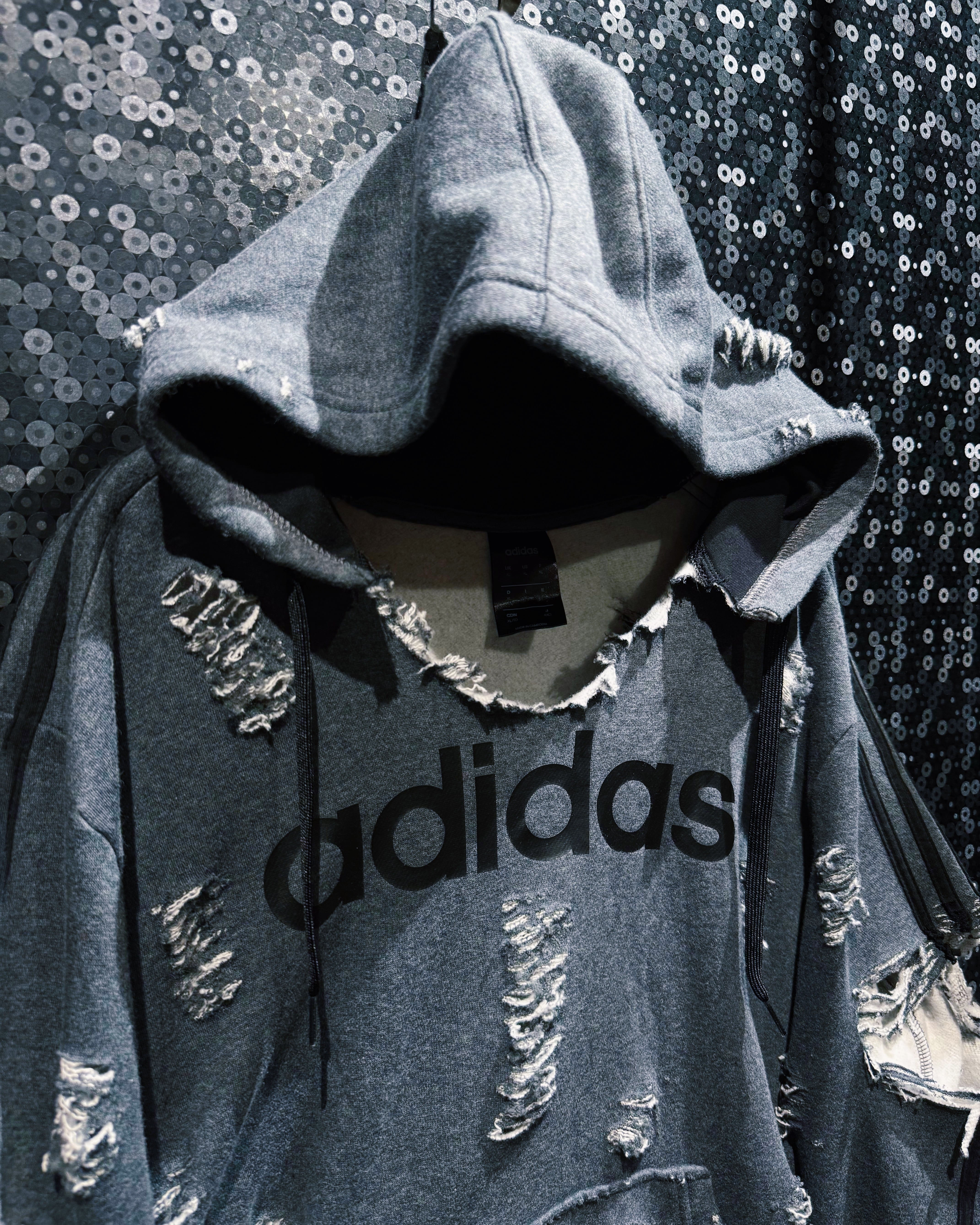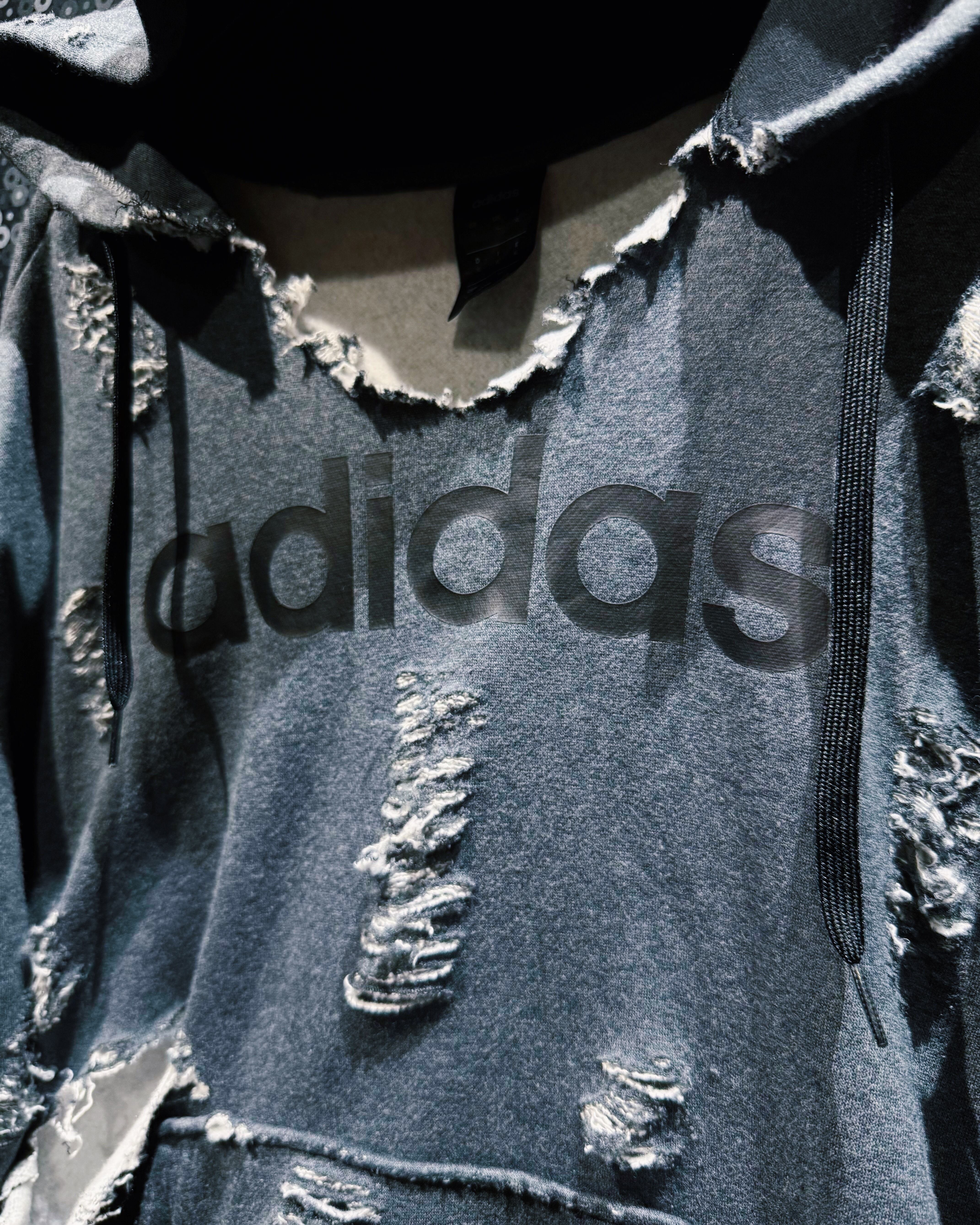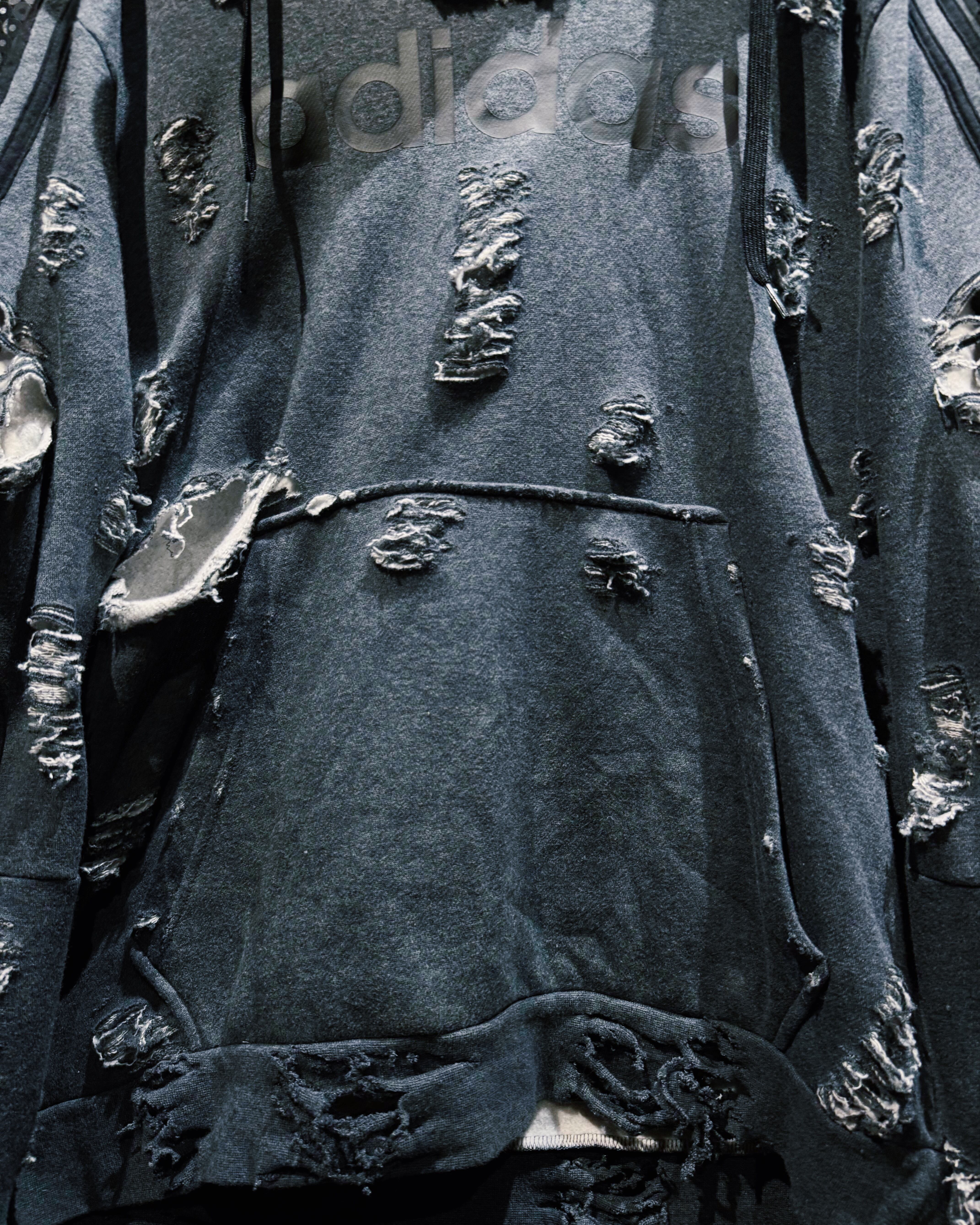 フロントに同色のadidasパフォーマンスロゴを大きく配した一枚を、オリジナルのボロリメイクで再構築したフーディー。